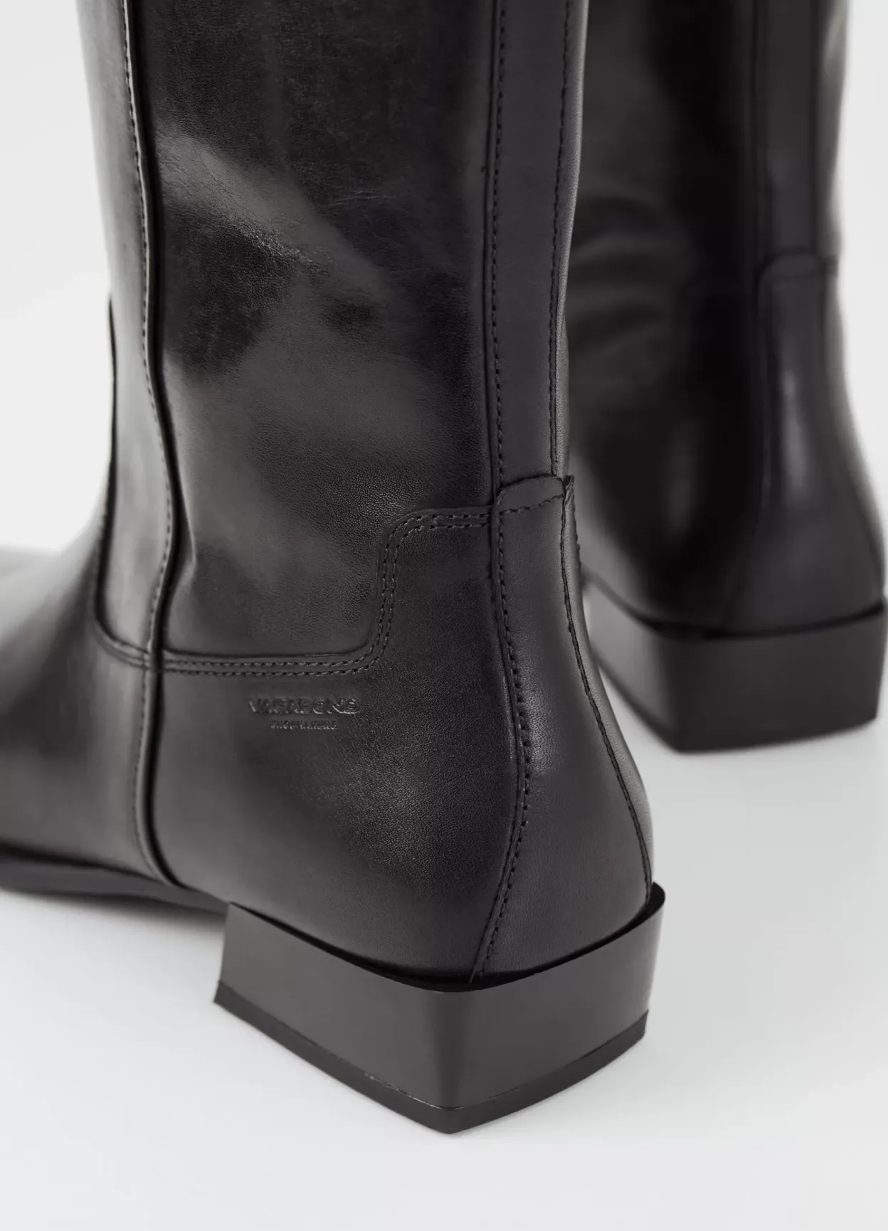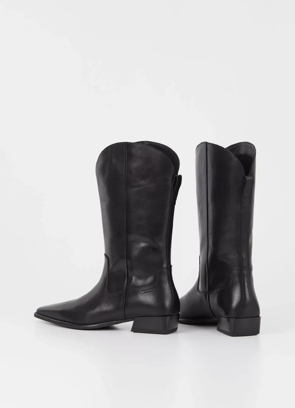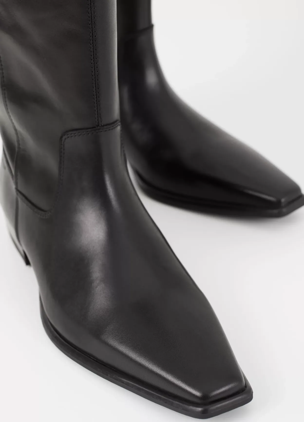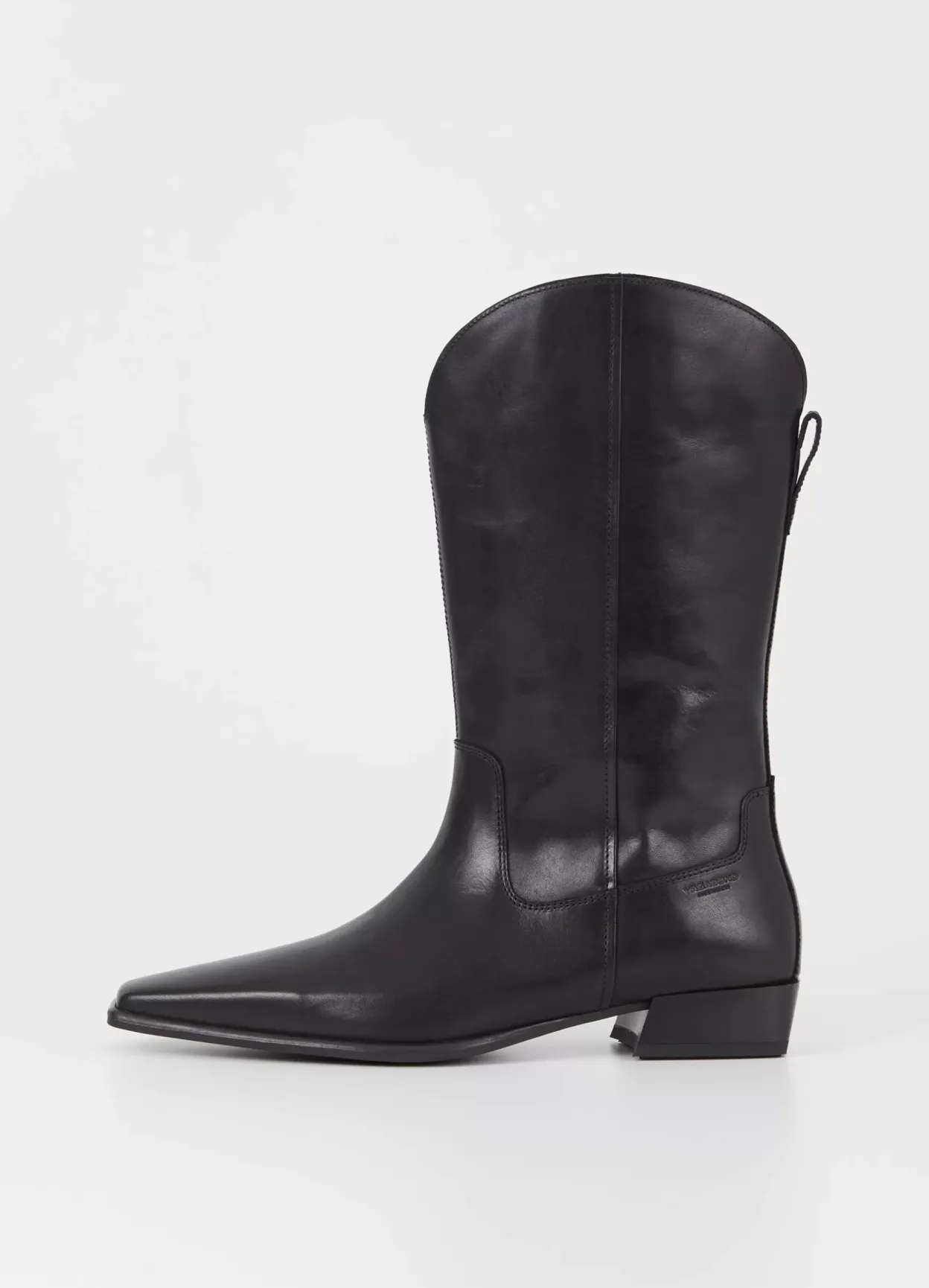 Nella er stilfulde støvler med et western-inspireret design. Modellen er lavet i sort læder med mellemhøjt skafte, spids tåform samt hælstrop. Den kantede hæl er 31 mm. Detaljen: pull-on design.