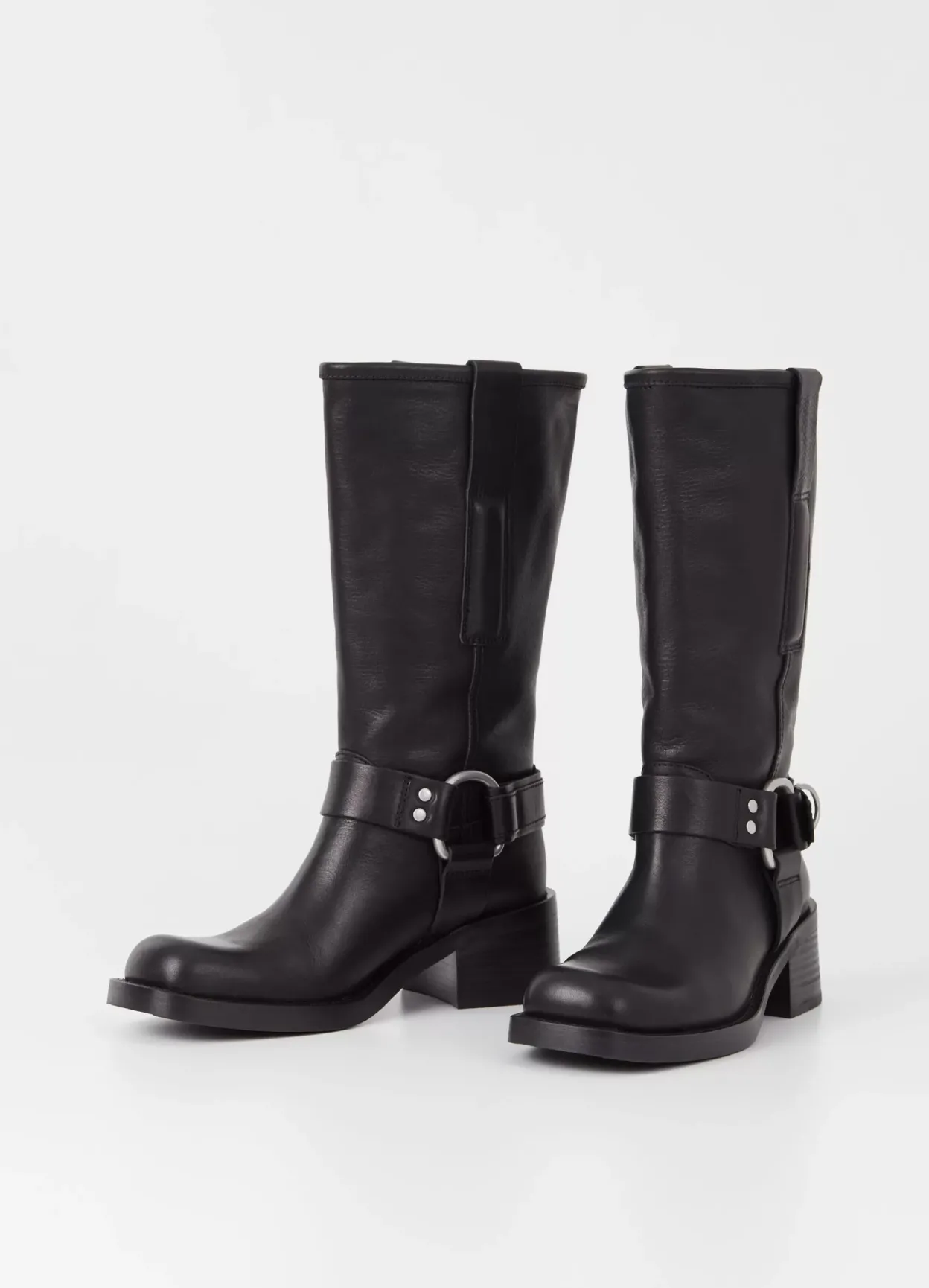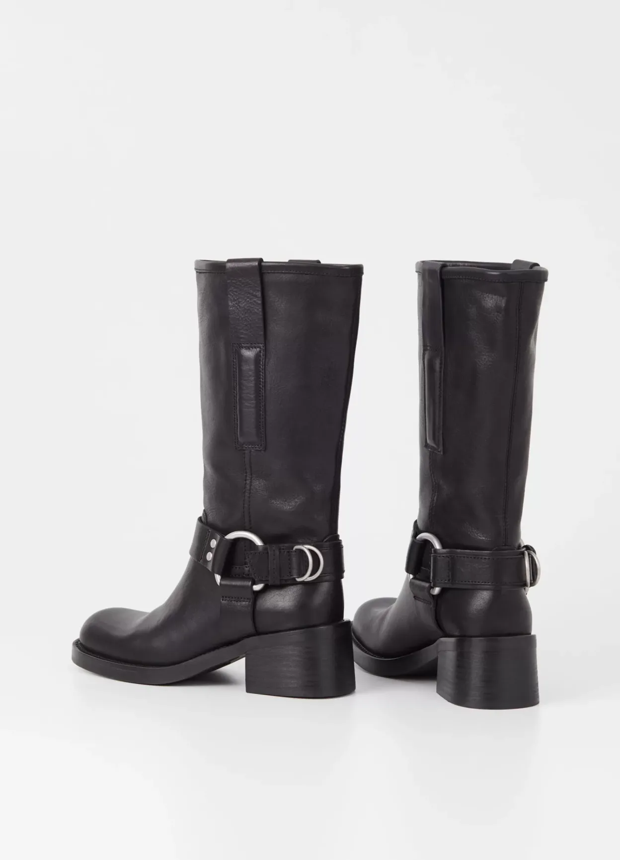 Nour er harness-støvler med et mc-inspireret design. Modellen kommer i sort læder med et mellemhøjt skafte samt pull-on design. Den formstøpte gummisål står på en 57 mm blokhæl. Detaljen: rund tå, læderfor og lynlåse langs med skaftet.