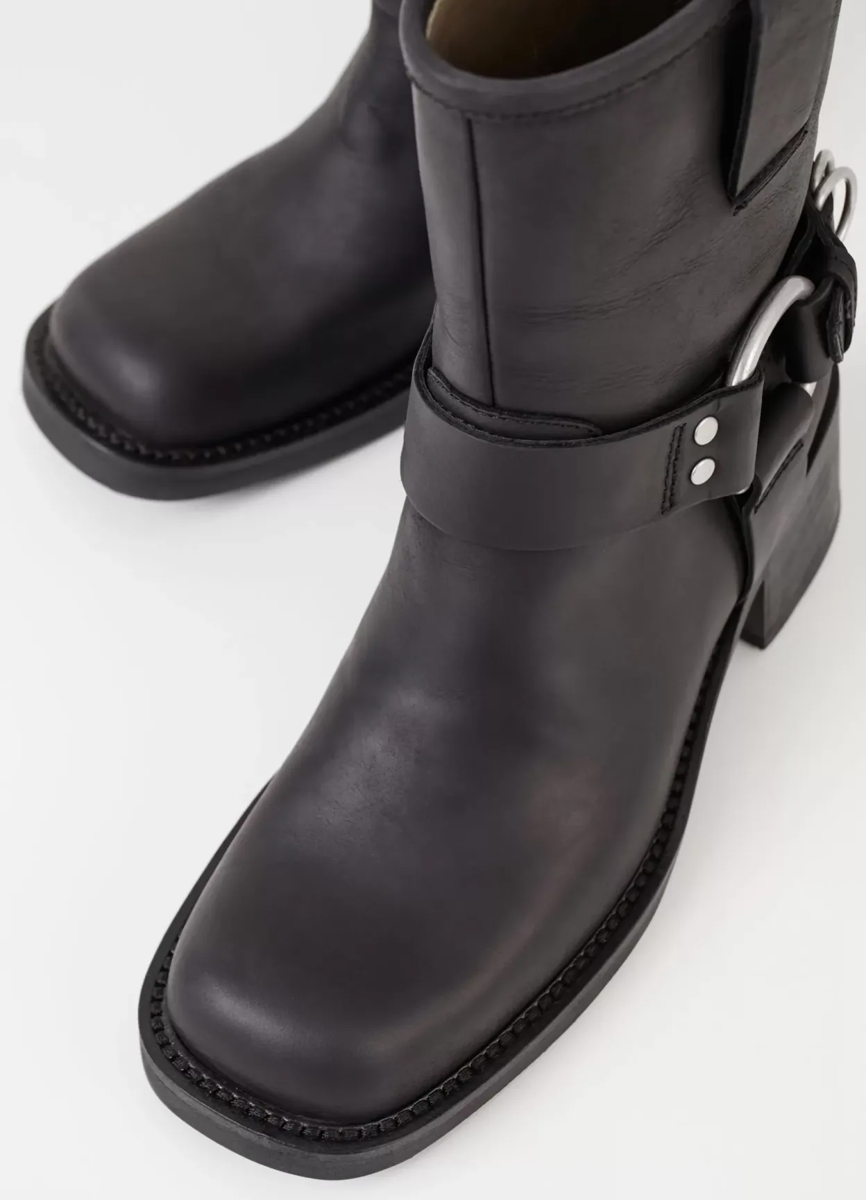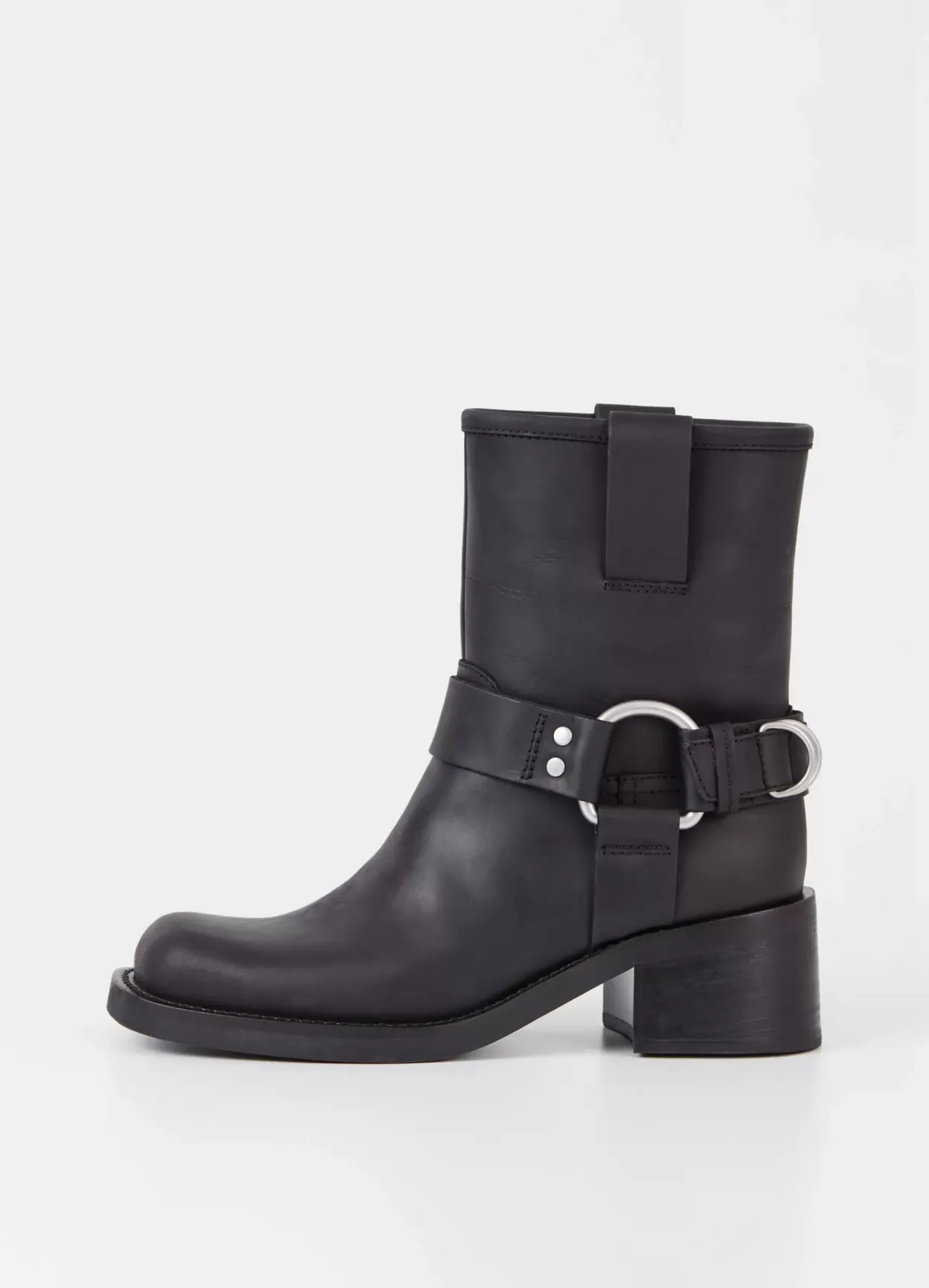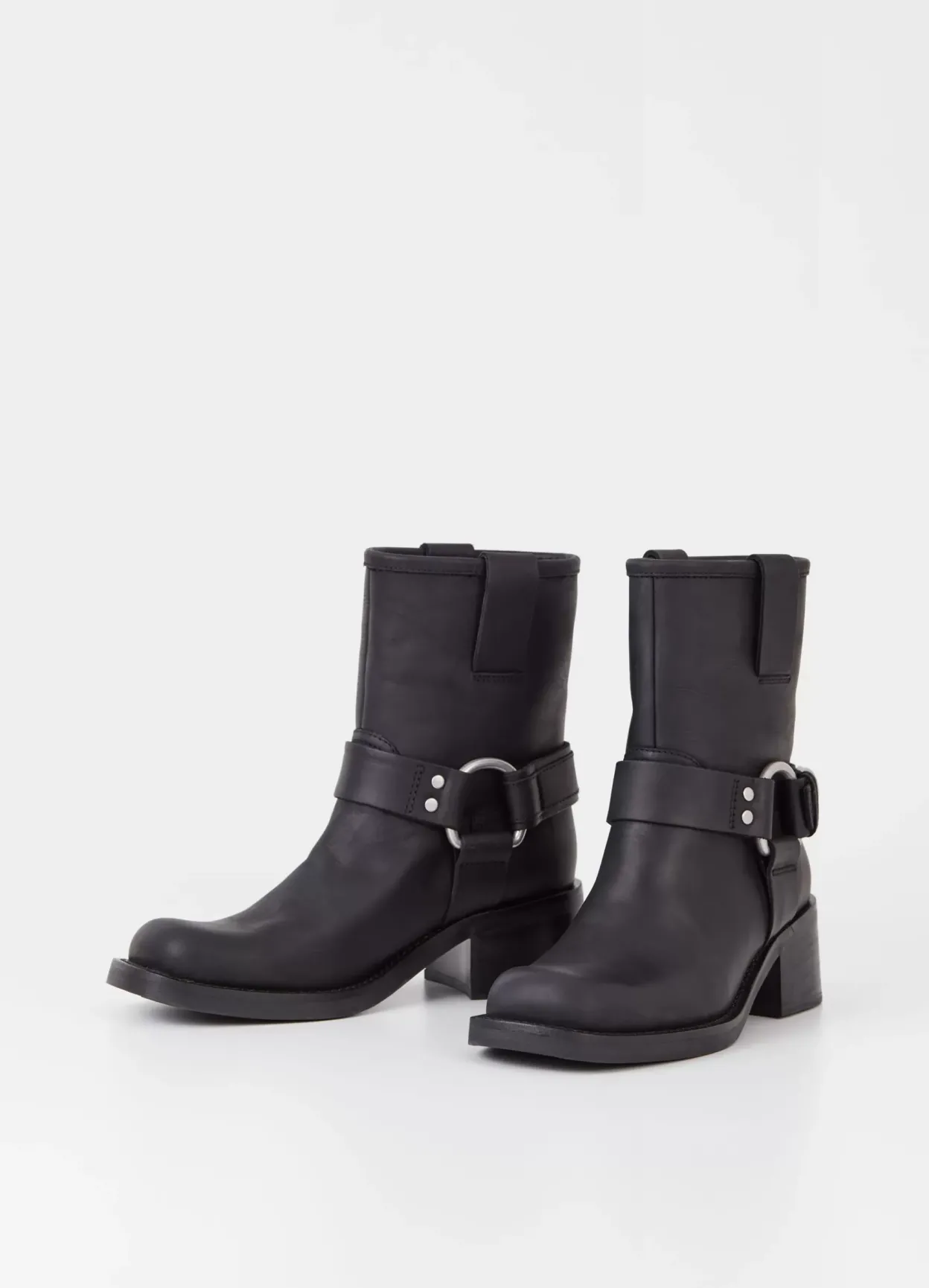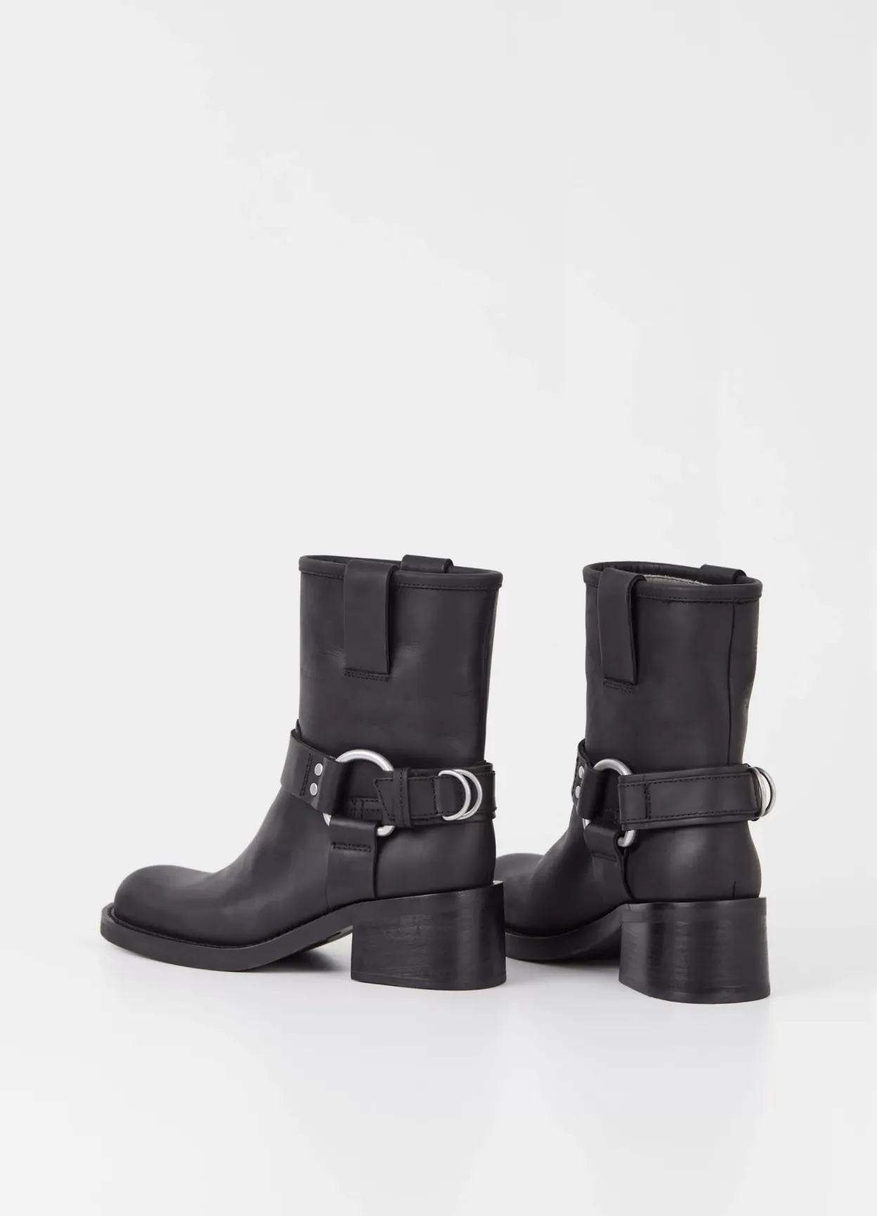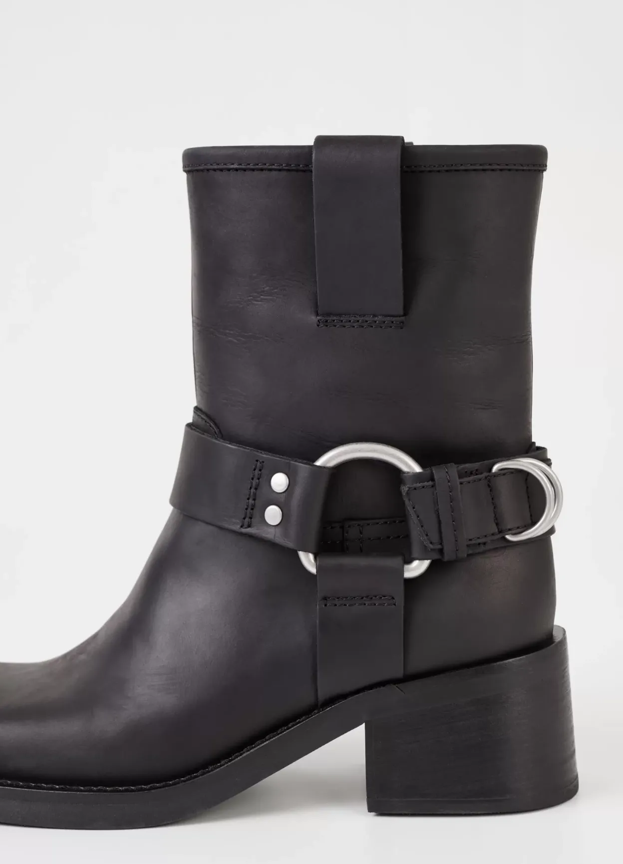 Nour er lave harness-boots som er en del af kapselkollektionen Atelier by Vagabond. Modellen er lavet i sort olieret nubuck med rund tå, pull-on skafte samt dekorative harness-detaljer. Den støbte gummisål hviler på en 57 mm høj blokhæl. Detaljen: læderfor og hæl i læderfiner.
