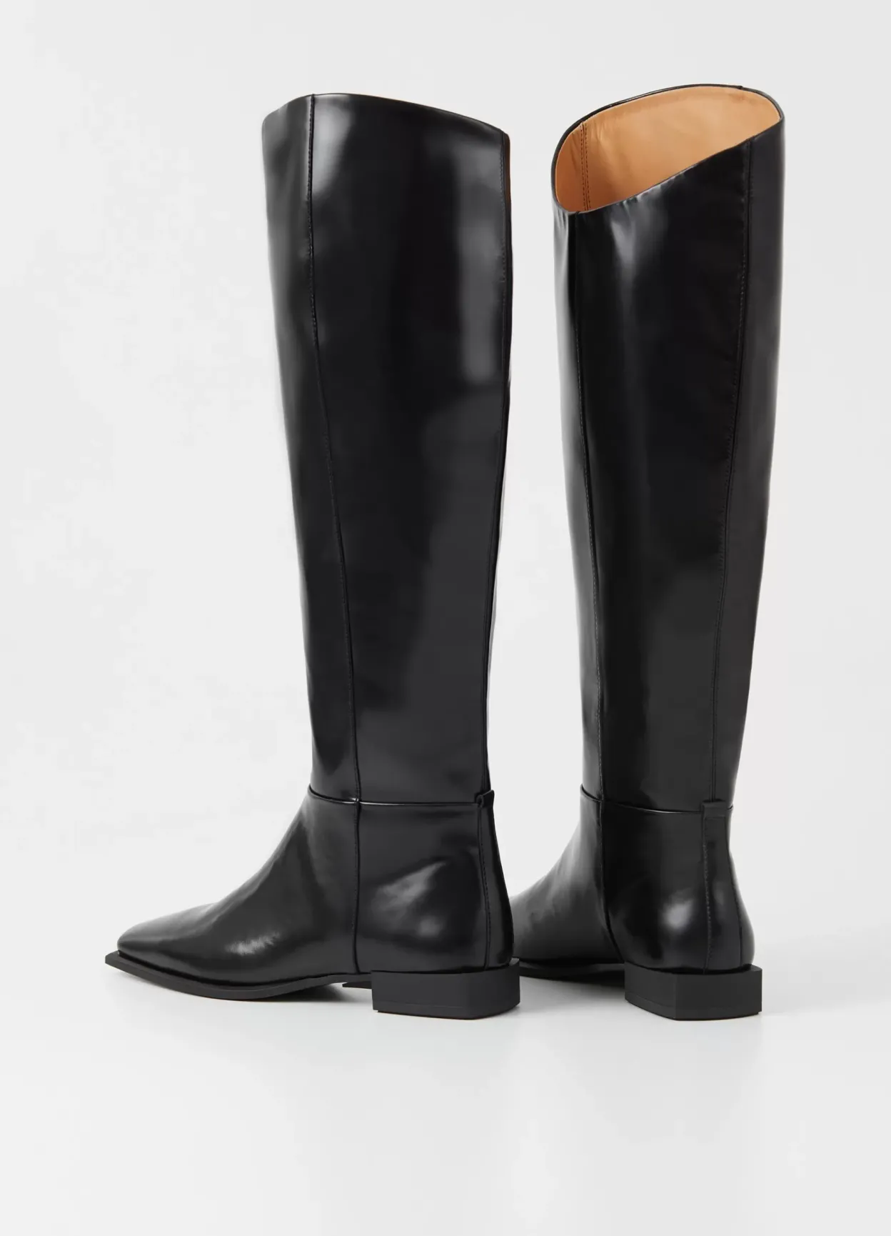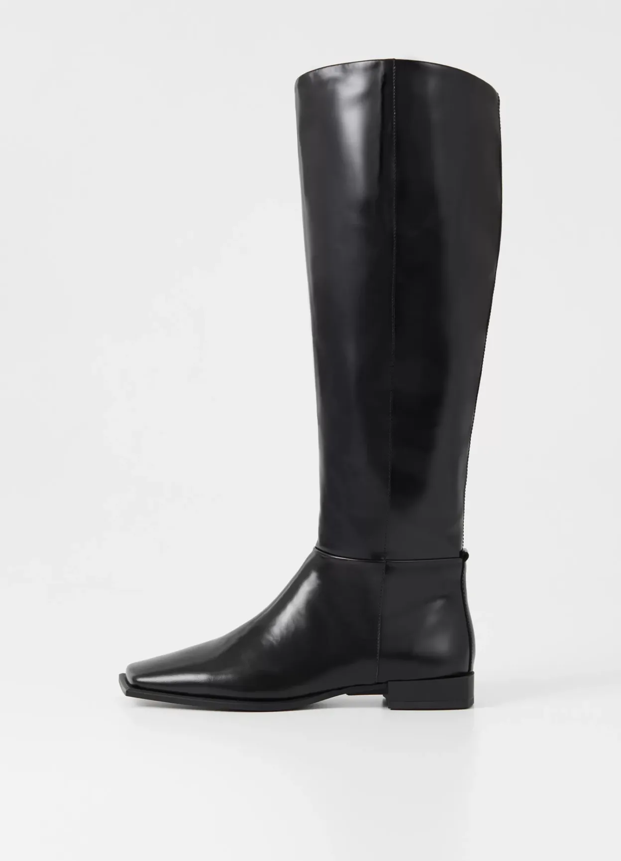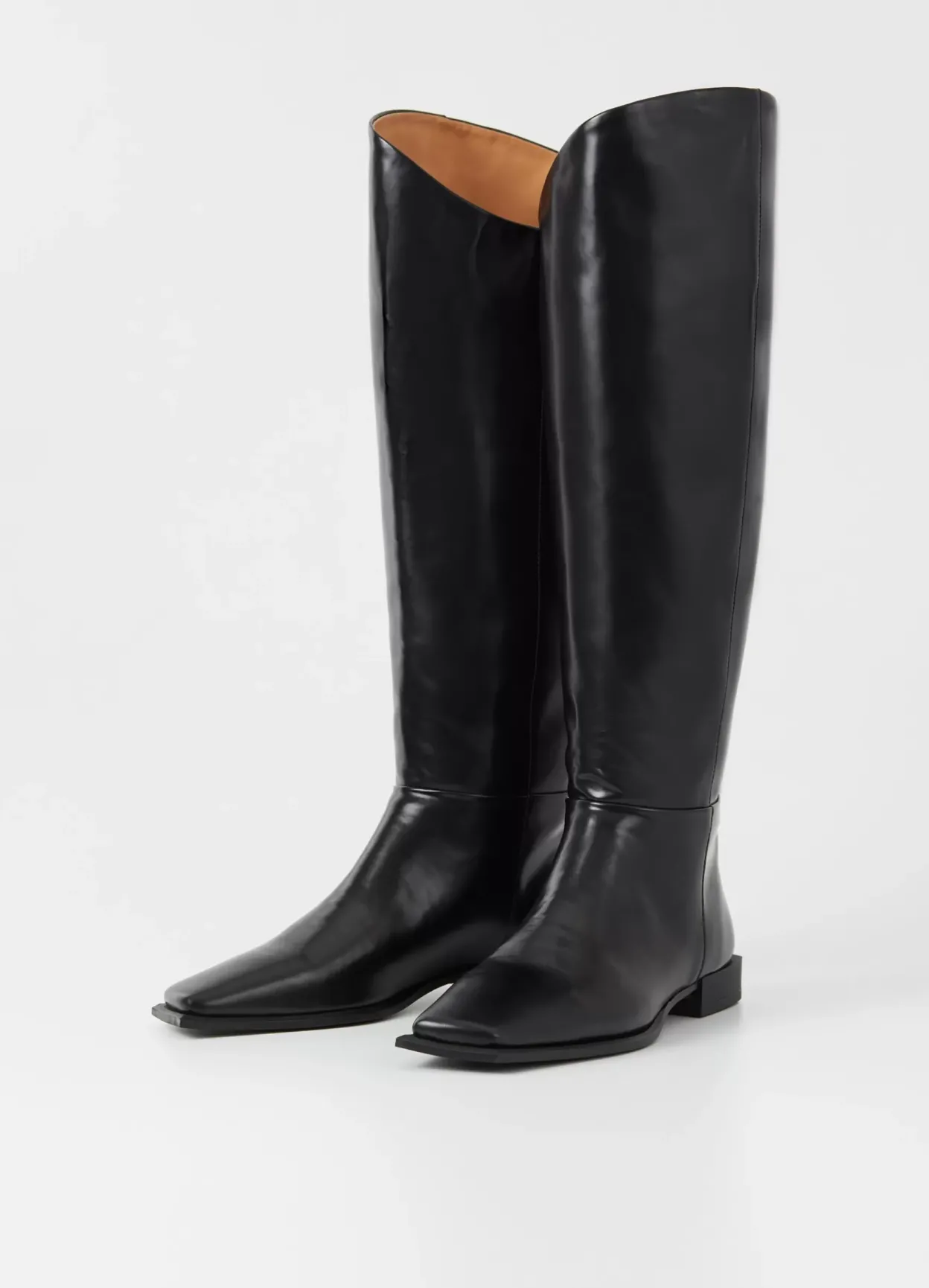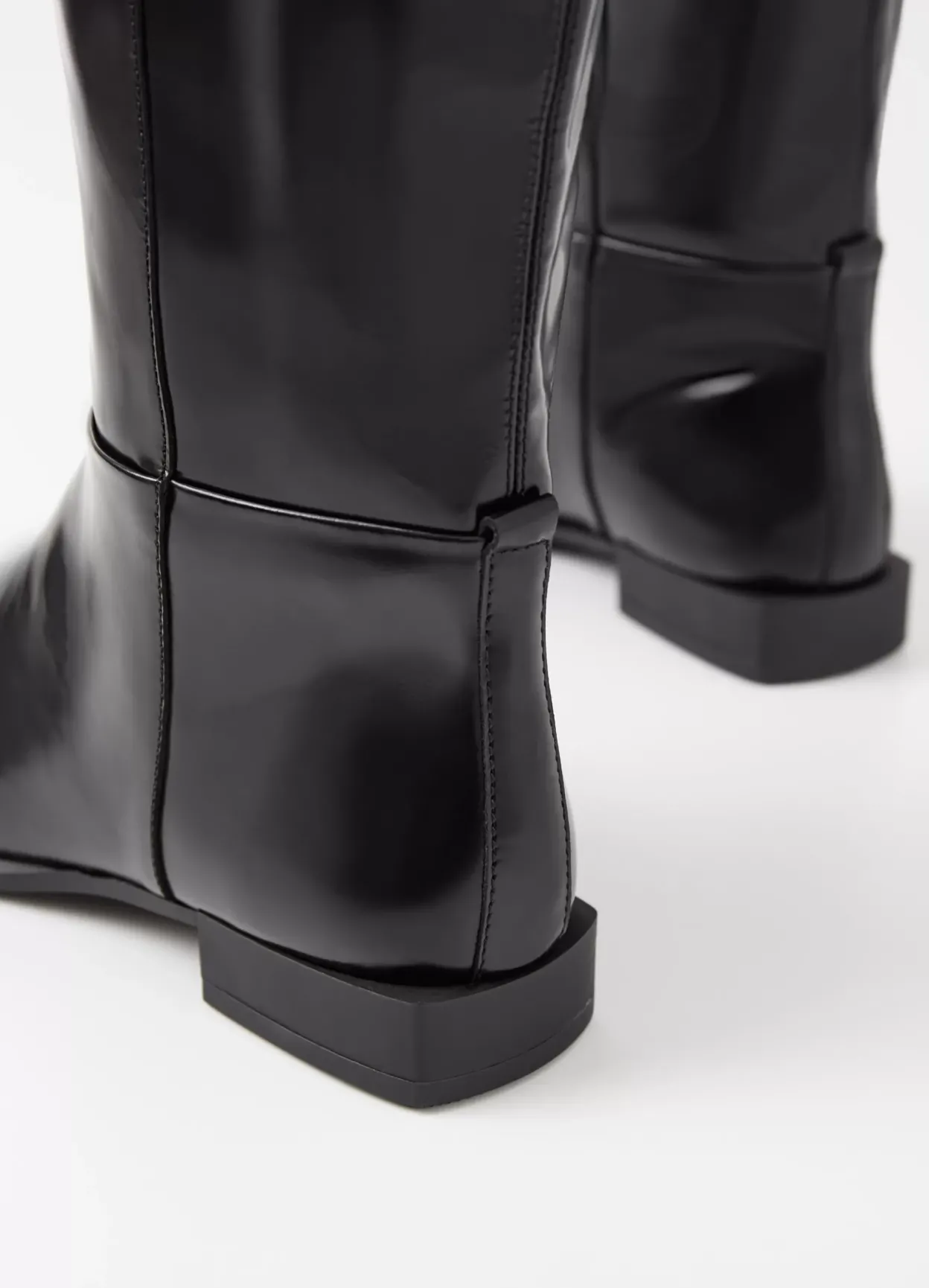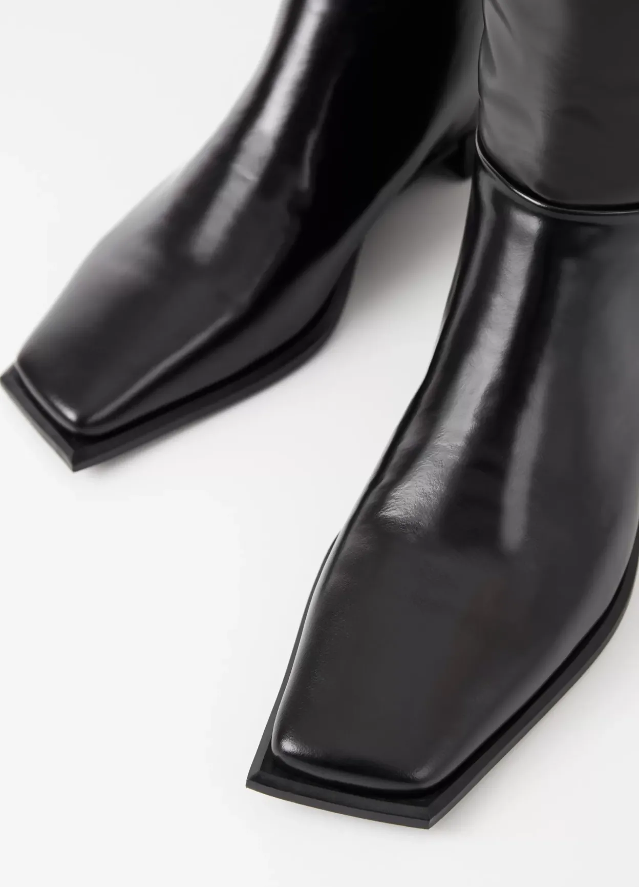 Salma er minimalistiske støvler med en moderne, asymmetrisk silhuet. Modellen er i sort lakeret skind med et skråt knæhøjt skaft, asymmetrisk tå og skindfór. Den lave hæl er på 26 mm.