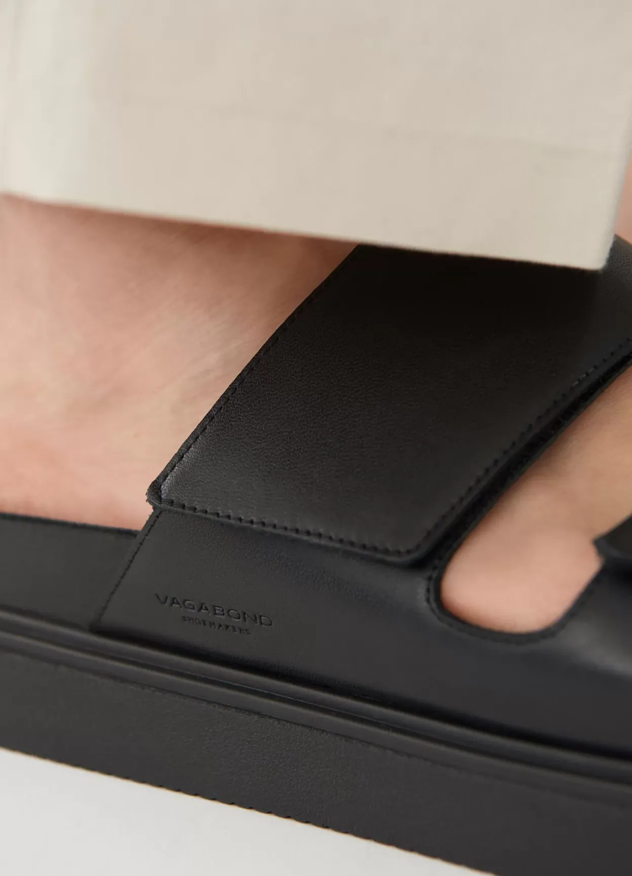 Seth er minimalistiske slip in sandaler med en ren silhuet. Modellen er i sort skind med justerbare remme, formet indersål og åben tå. Den solide gummisål er på 45 mm.