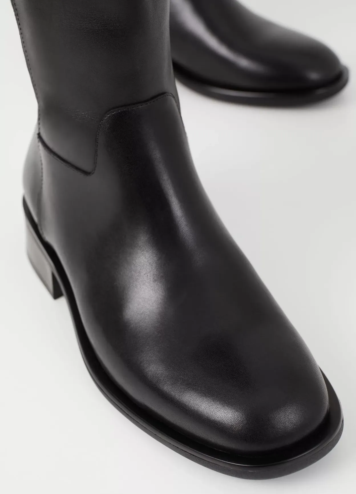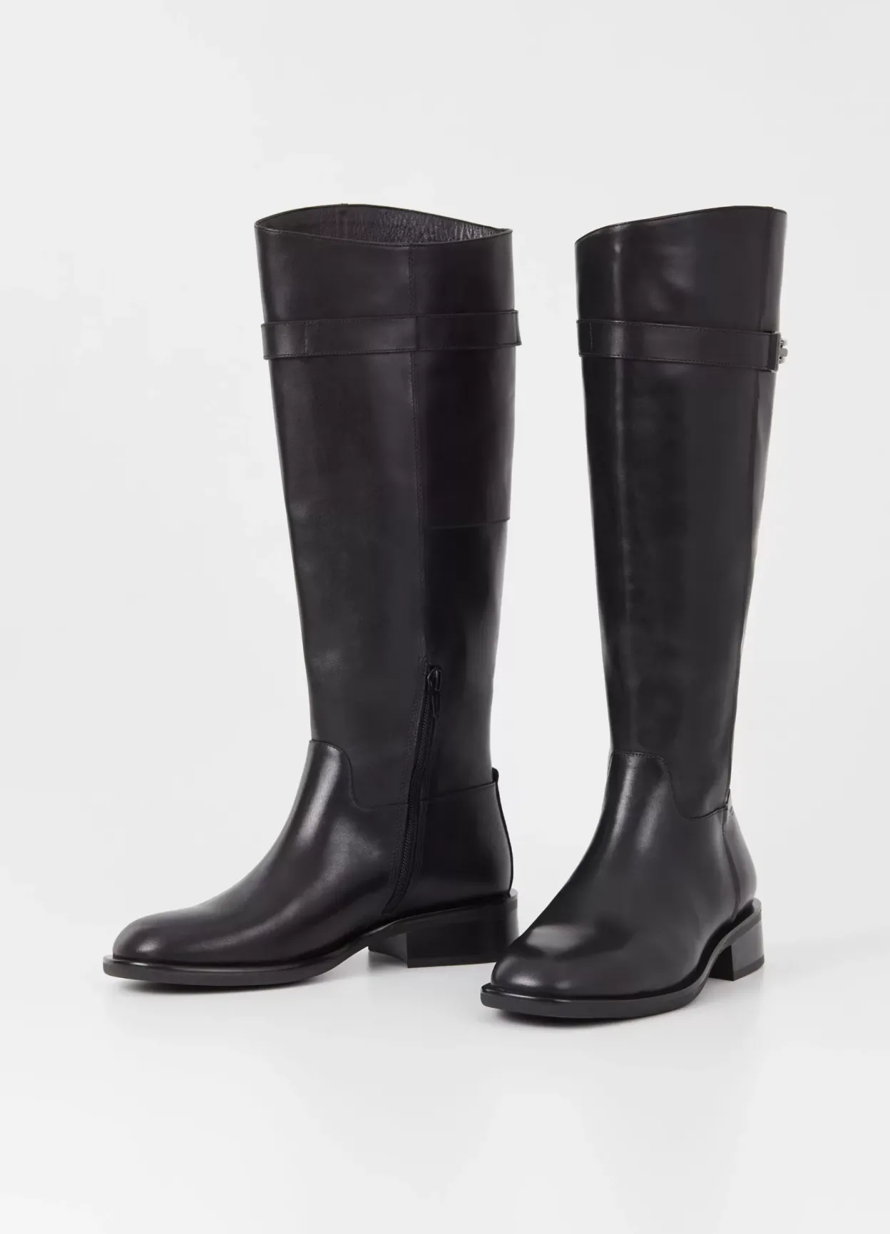 Sheila er knæhøje boots inspireret af klassiske ridestøvler. Modellen kommer i sort læder med en dekorativ strop med spænde øverst. Den lave hæl måler 38 mm. Detaljen: lynlås langs indersiden af skaftet.