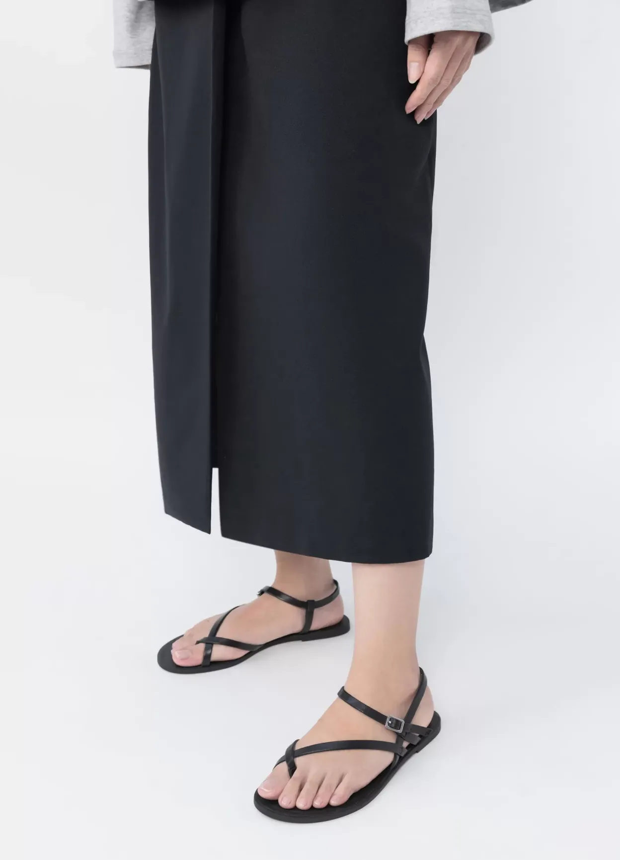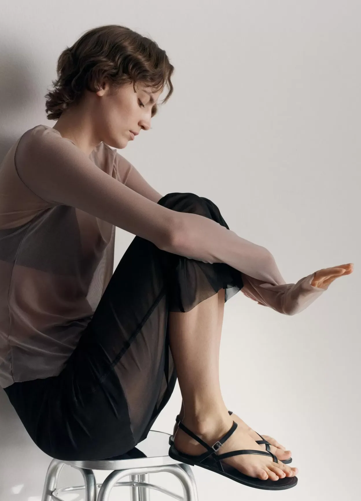 Tia 2.0 er minimalistiske sandaler designet med tynde remme, som går over foden. Modellen kommer med sort læder, tårem og justerbar ankelrem. Den slanke sål er 10 mm.
