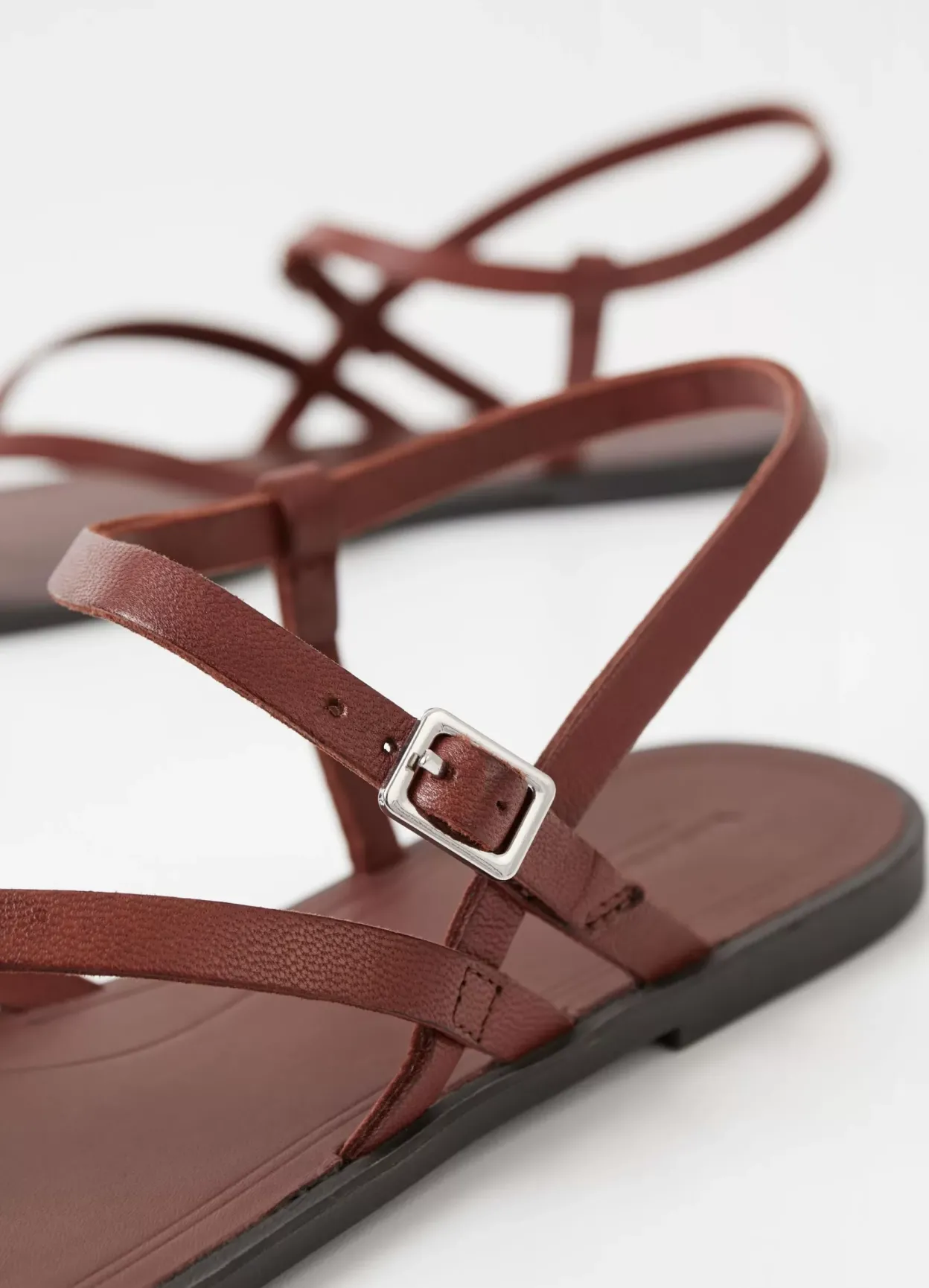 Tia 2.0 er minimalistiske remsandaler med et stilrent look. Modellen er lavet i cognacbrunt læder med smalle remme, som går over foden, justerbar ankel- og tårem. Den slanke ydersål er 10 mm.