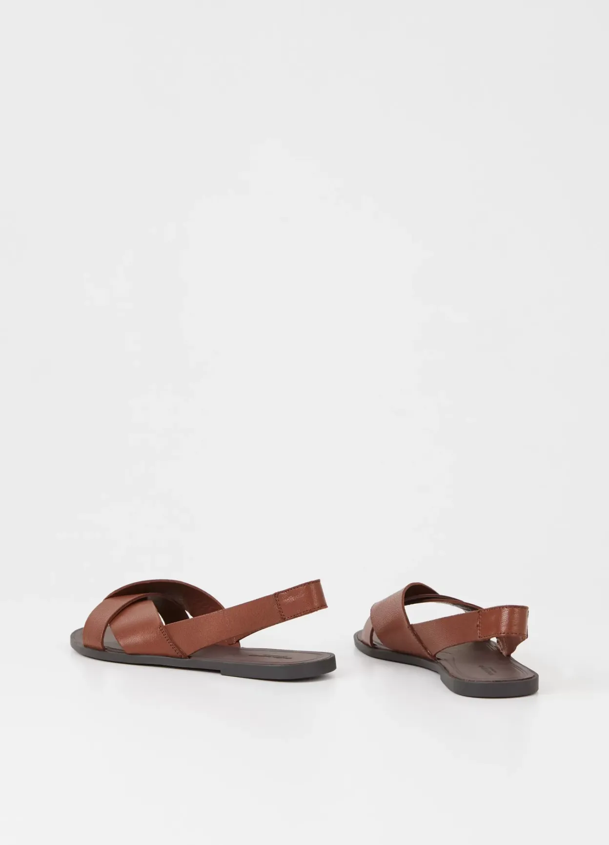 Tia 2.0 er minimalistiske sandaler med et stilrent design. Modellen er i cognacfarvet læder med flettede remme, åben tå og en elastisk hælrem. Den slanke sål er 10 mm.