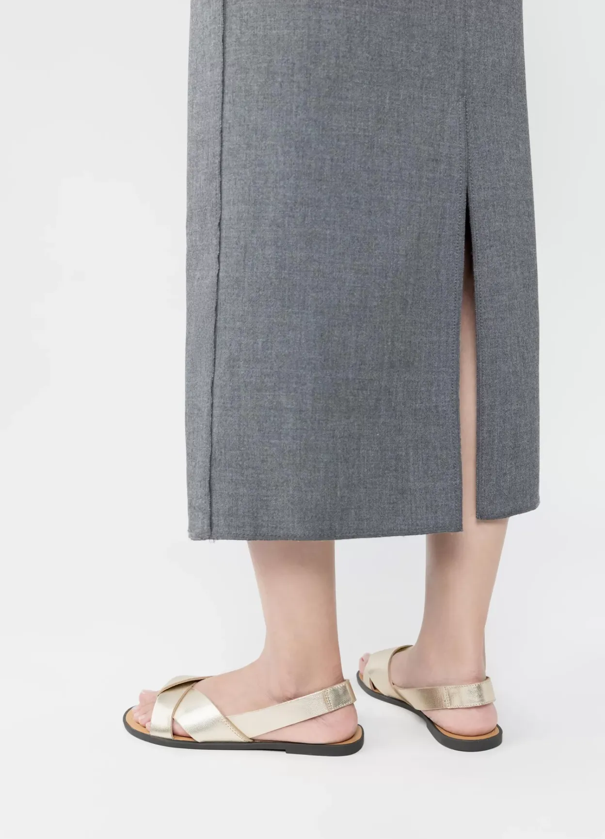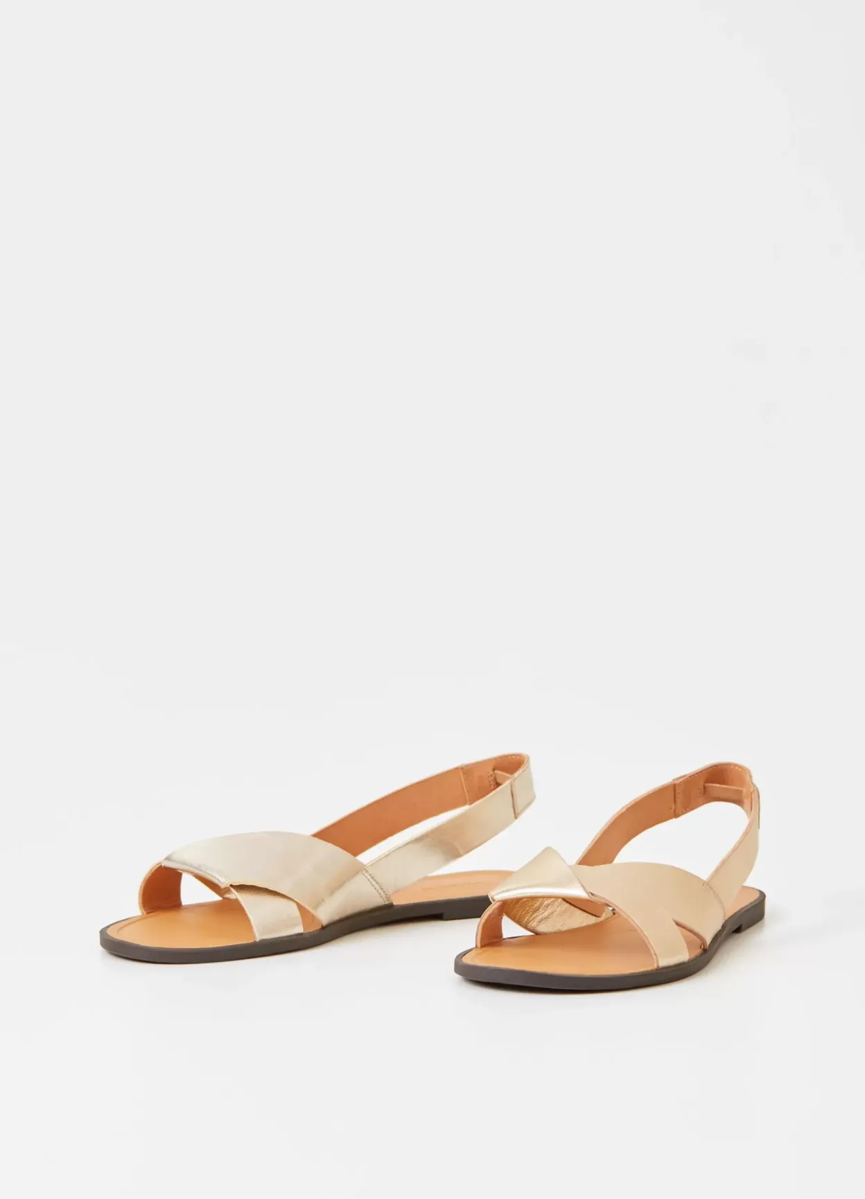 Tia 2.0 er stilfulde sandaler i et rent design. Modellen er lavet i guldfarvet læder med sammenflettede remme over foden, elastisk hælrem og åben tå. Den slanke sål er 10 mm.