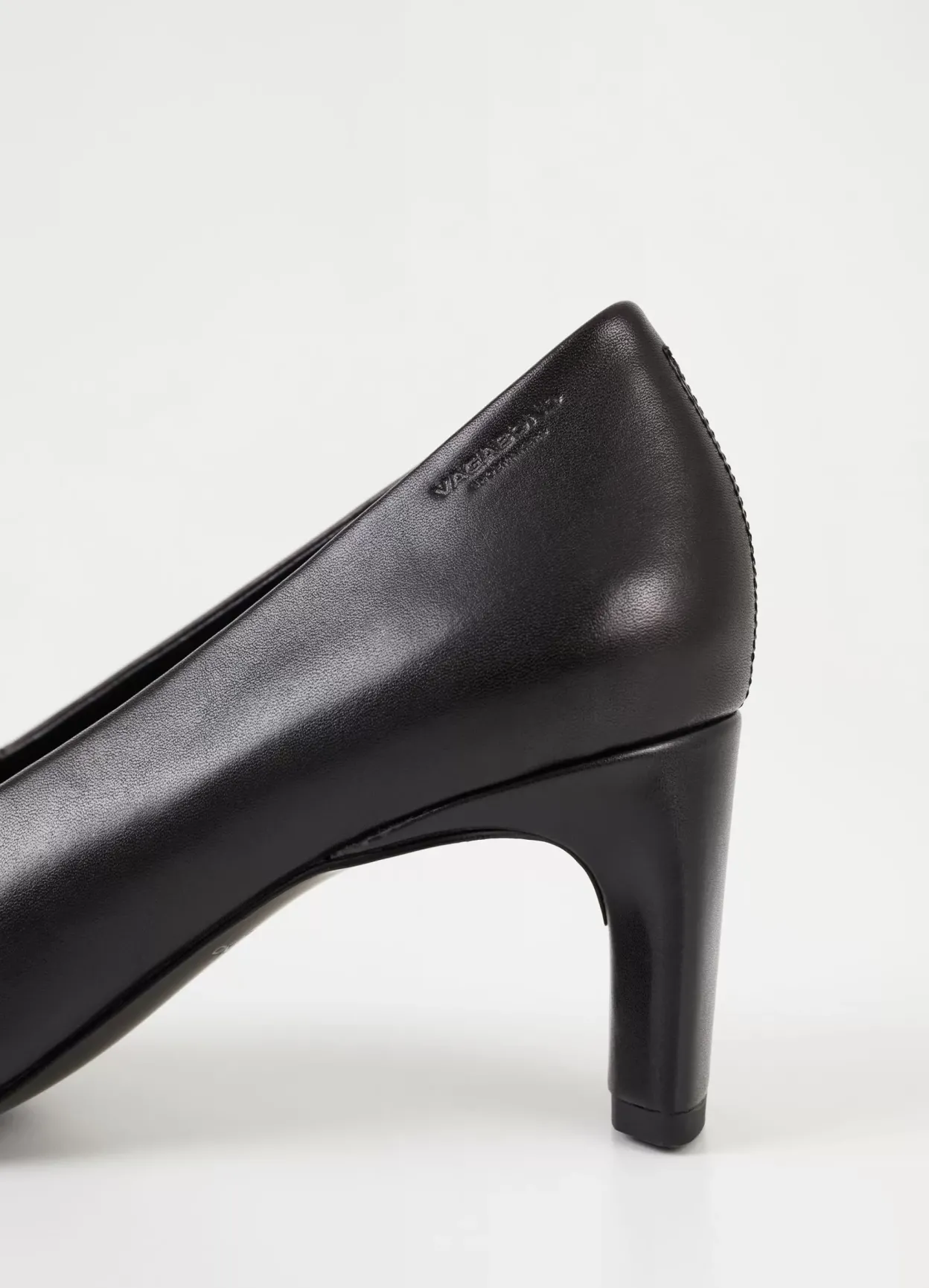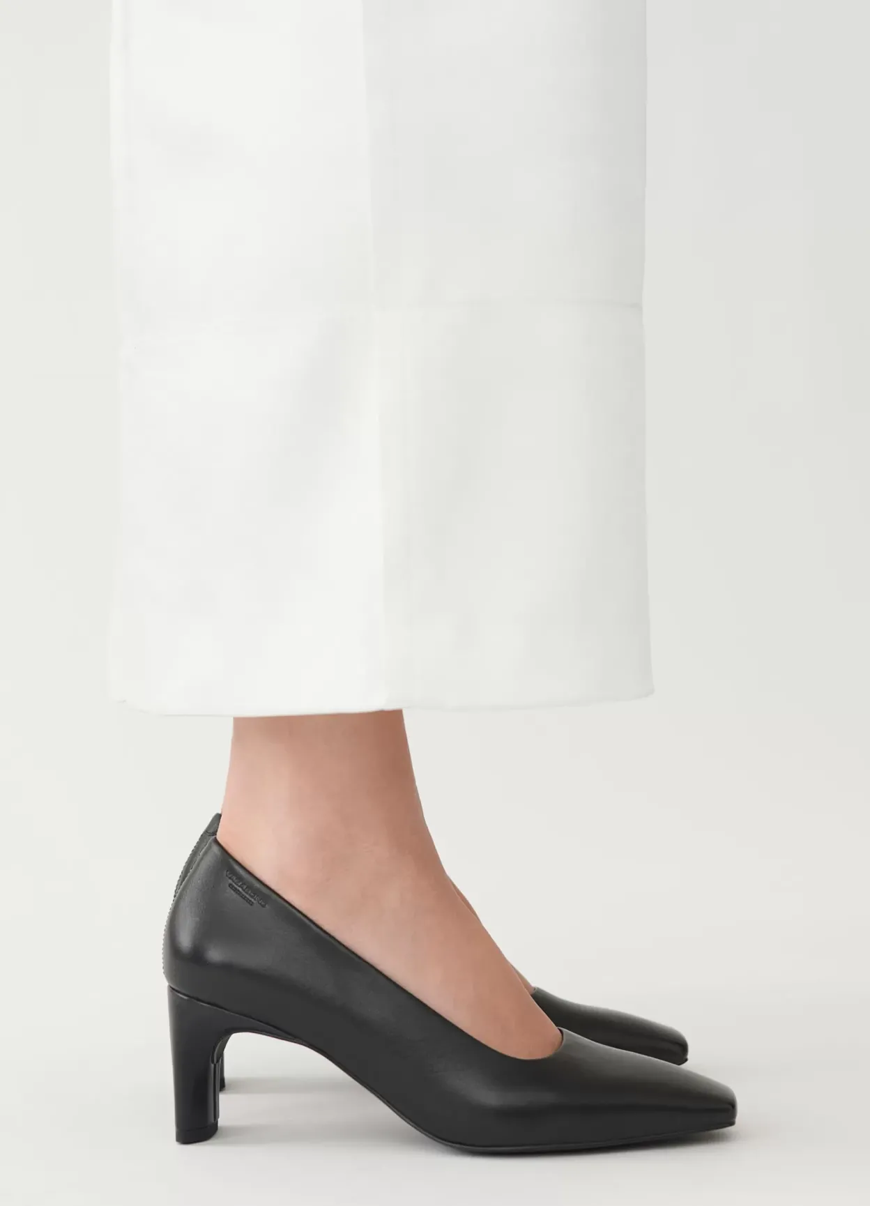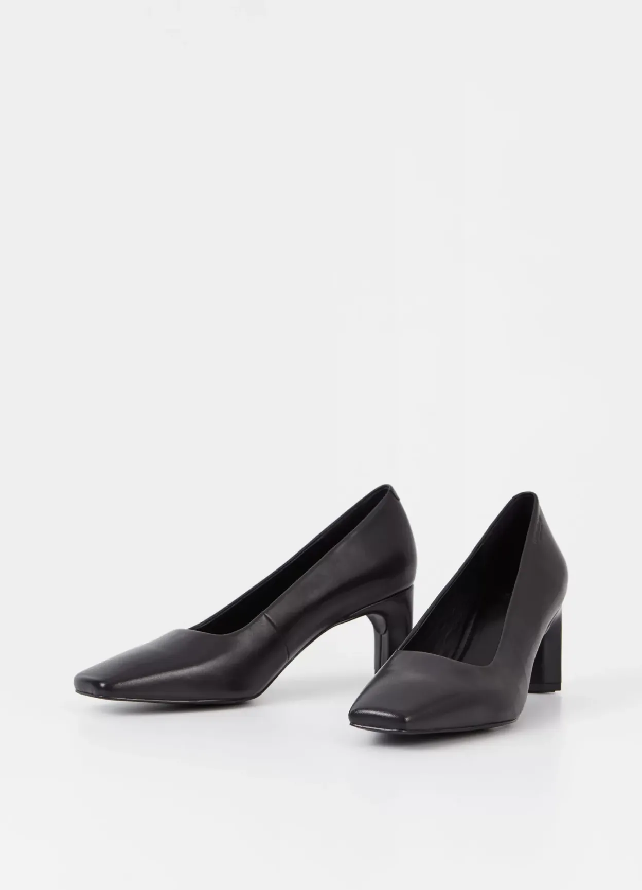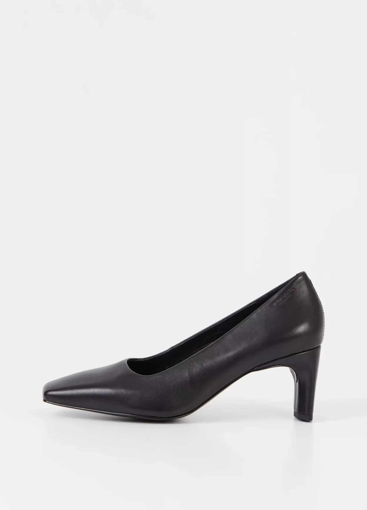 Vendela er tidløse pumps med et elegant look. Modellen er lavet i sort læder med firkantet tå, indersål i læder og læder/tekstilfor. Den smalle, karakteristiske hæl er 65 mm.