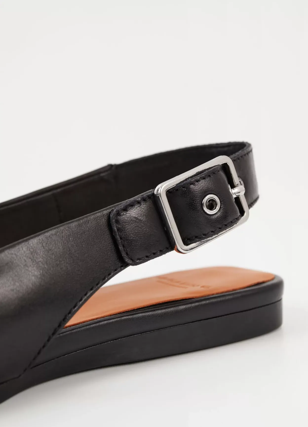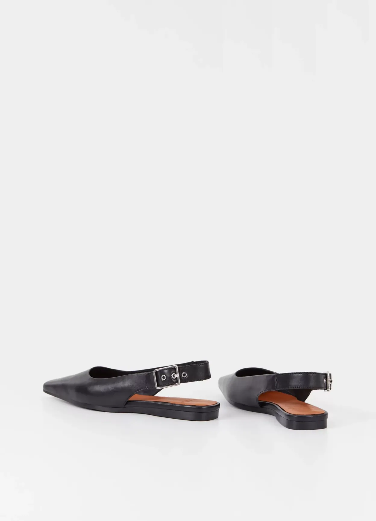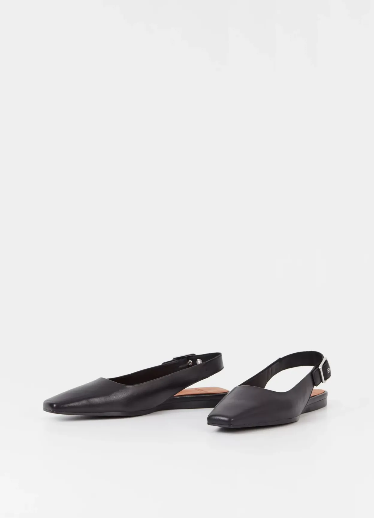 Wioletta er stilfulde slingbacks med et moderigtigt præg. Modellen er lavet i sort læder med spids tåform, justerbar hælrem og læderforing. Hælremmen lukkes med en sølvfarvet spænde i metal. Den lave hæl er 11 mm.