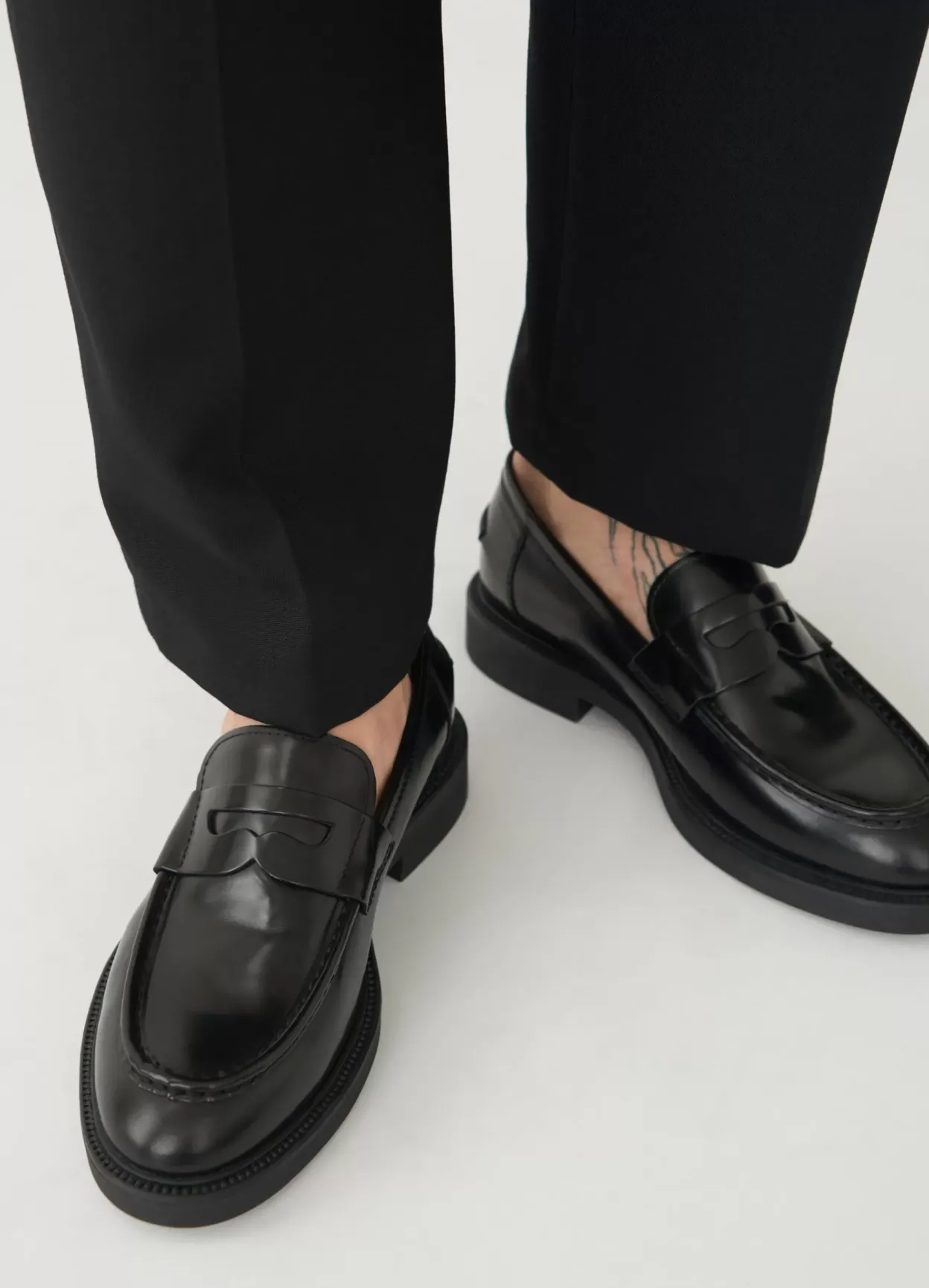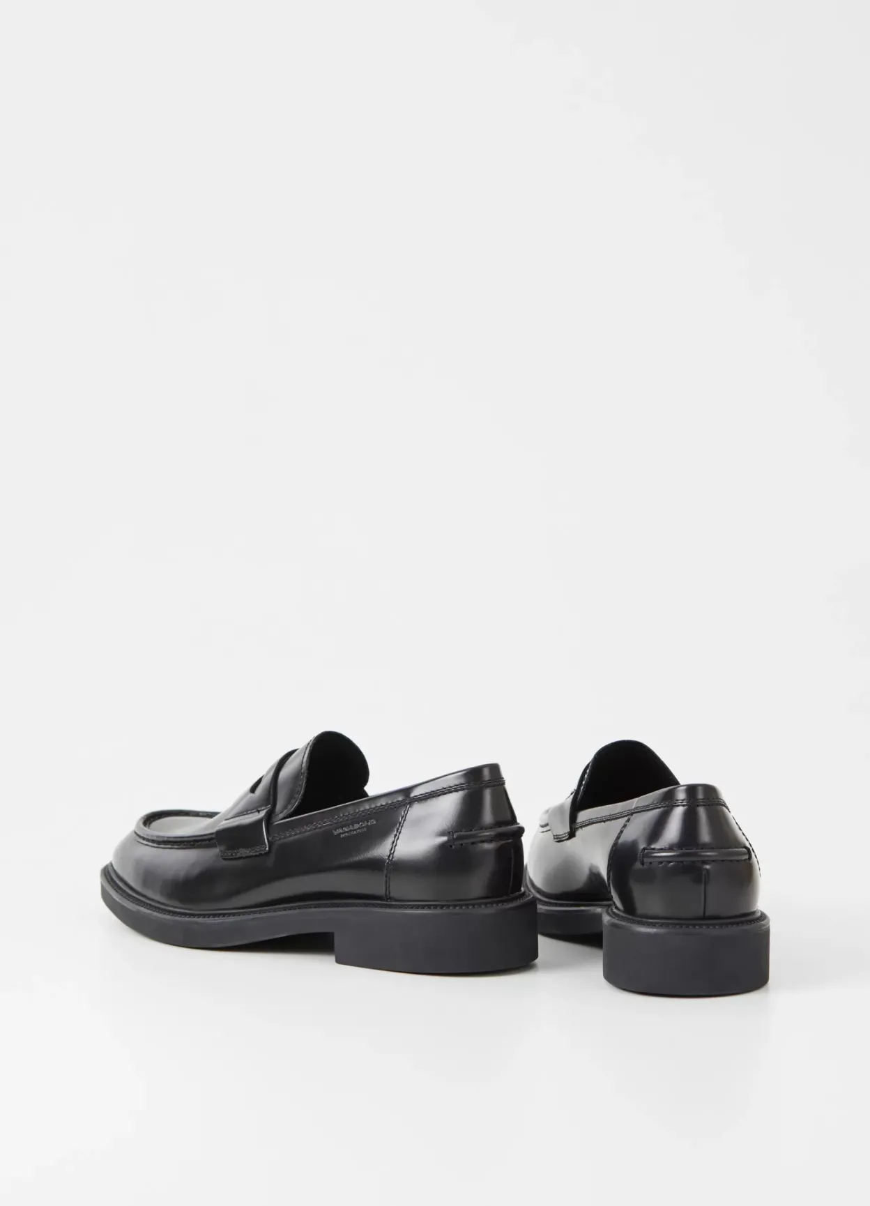 Alex M er moderne pennyloafers med et tidløst design. Modellen er i sort poleret læder, med et pennybånd på oversiden, moc-toe detaljer og en robust sål på 33 mm.