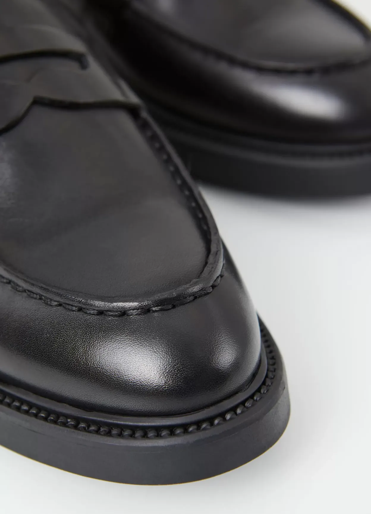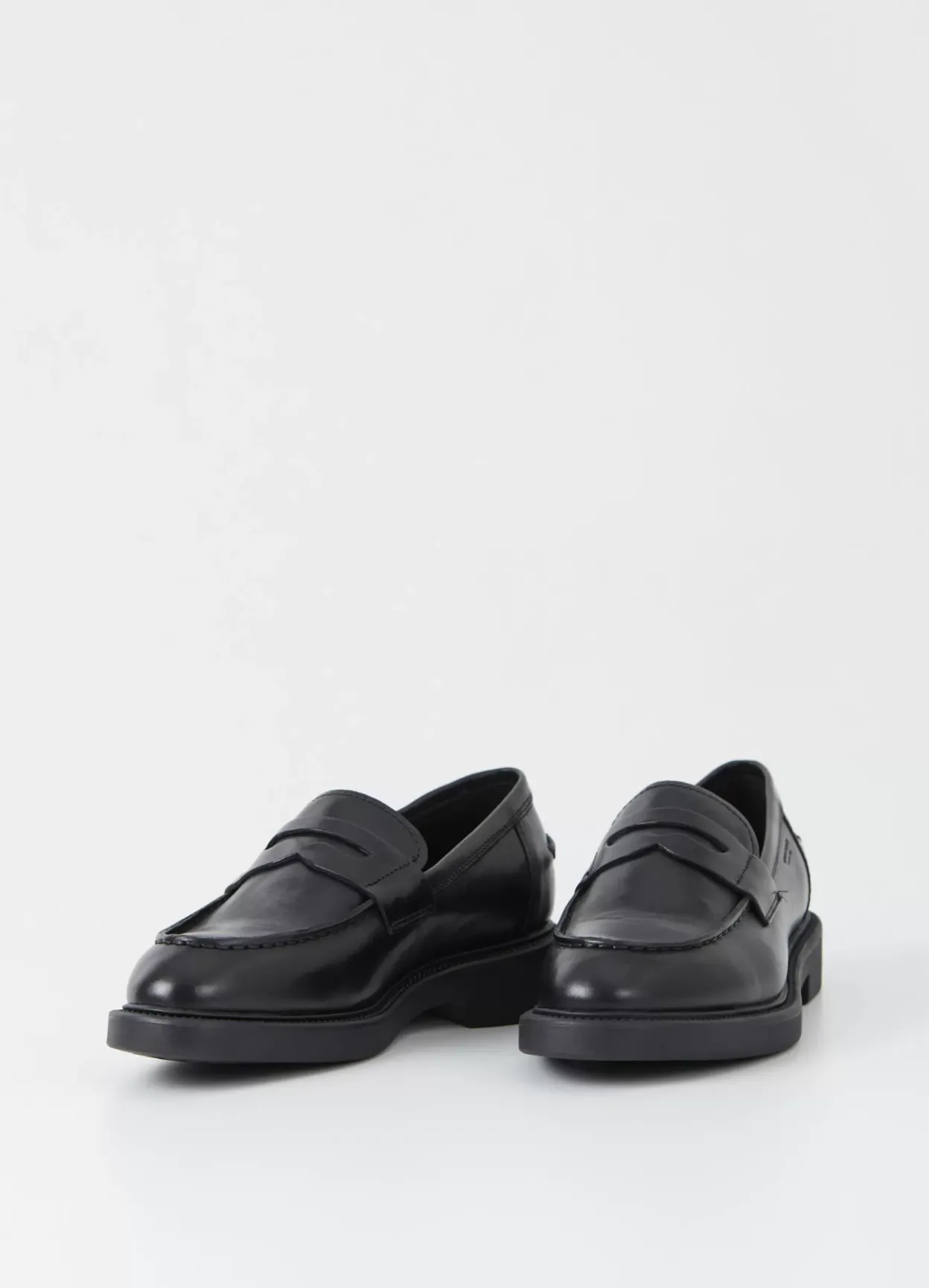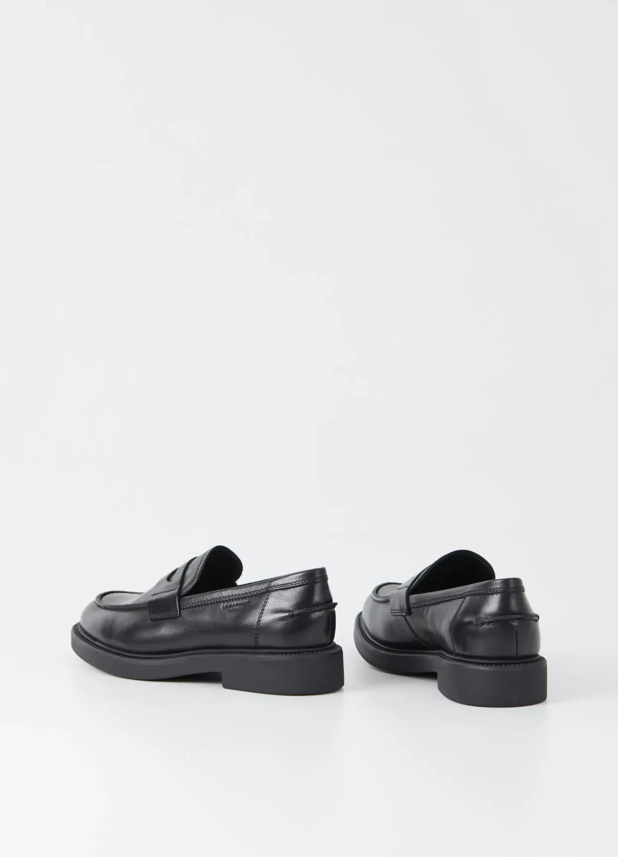 Alex W er yderst anvendelige pennyloafers, som kommer i smooth sort læder, moc-toe-detaljer, mandelformet tå og en traditionel penny-detalje på overdelen. De moderne model står på en robust gummisål på 33 mm. Dertil kommer en synlig syning langs med ydersålen.