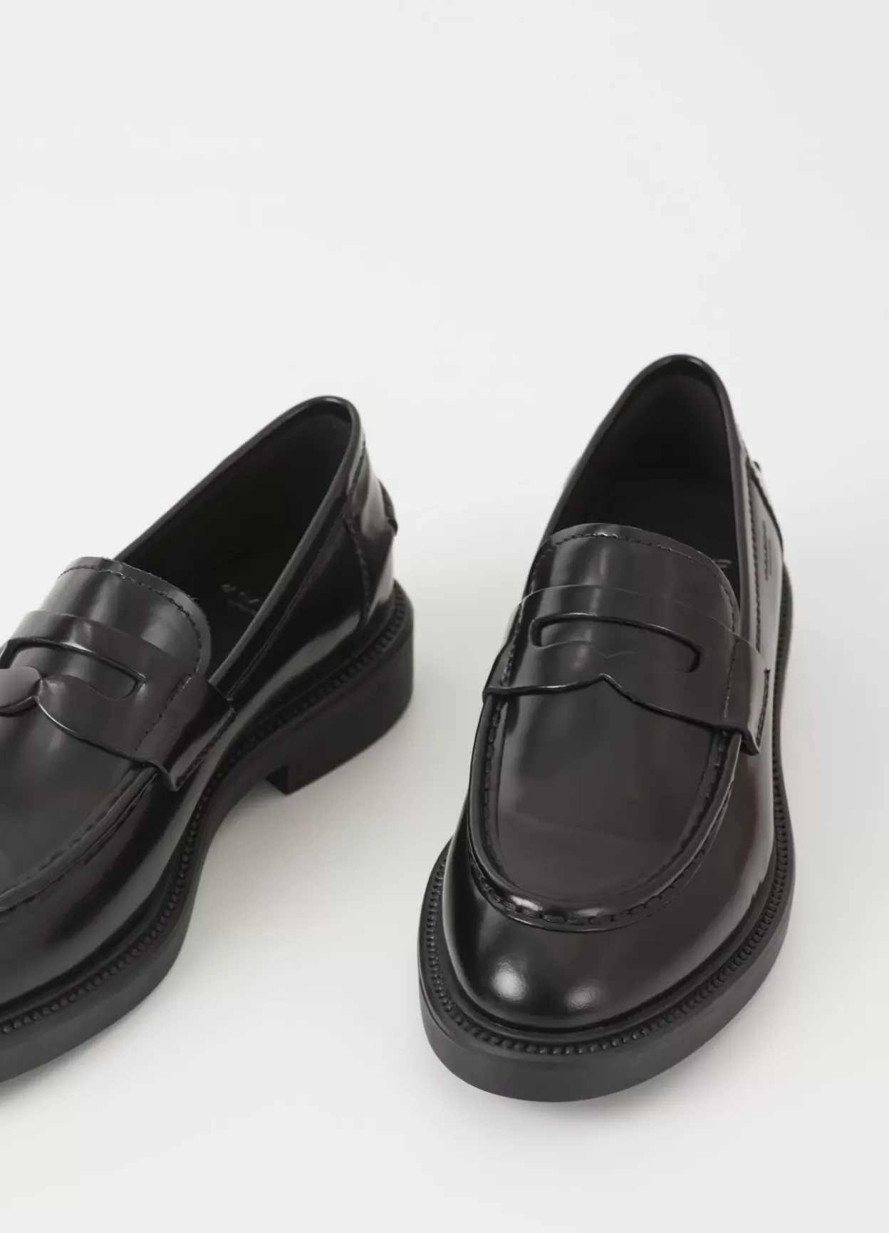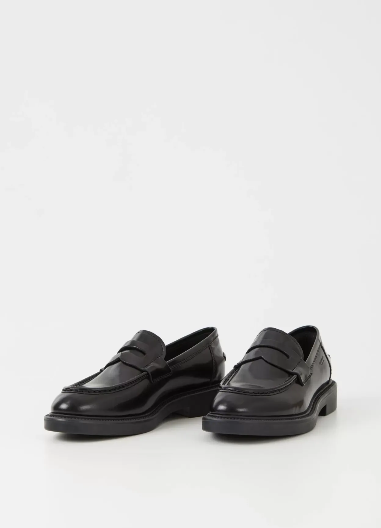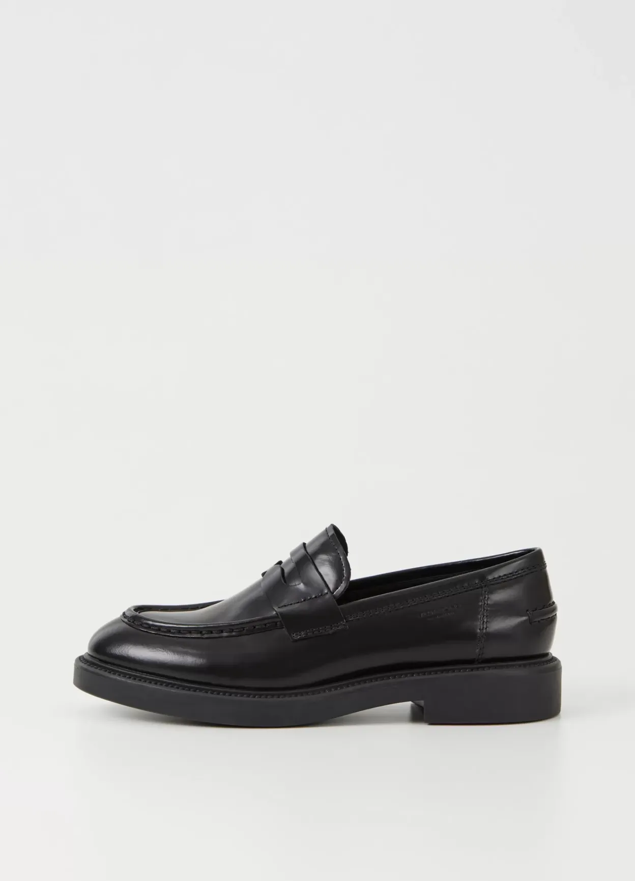 Alex er en tidløs penny-loafer i sort poleret skind med moc-toe-detaljer, mandelformet tå og en klassisk penny-rem på oversiden. Skoen står på en robust gummisål og en 33 mm lav hæl. Derudover kommer modellen med synlige syninger langs ydersålen.