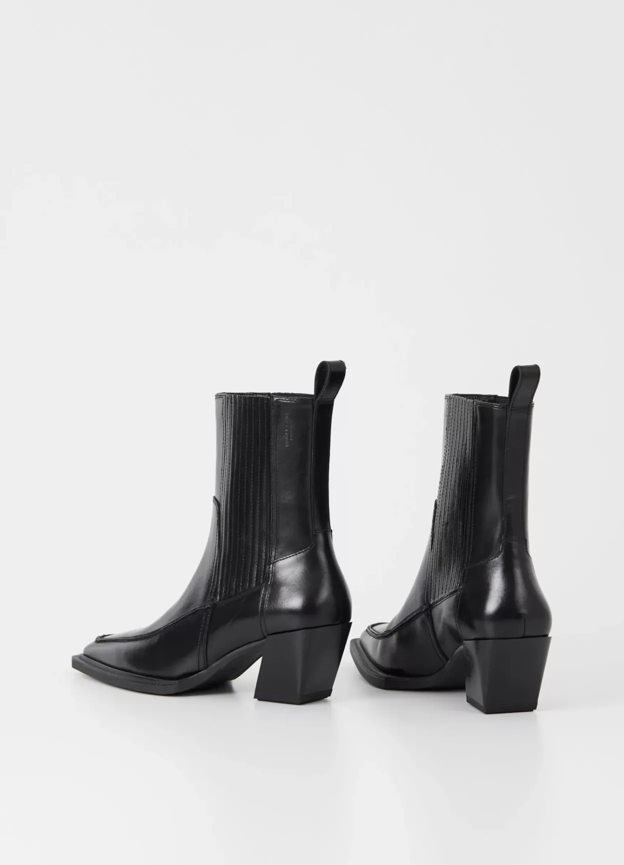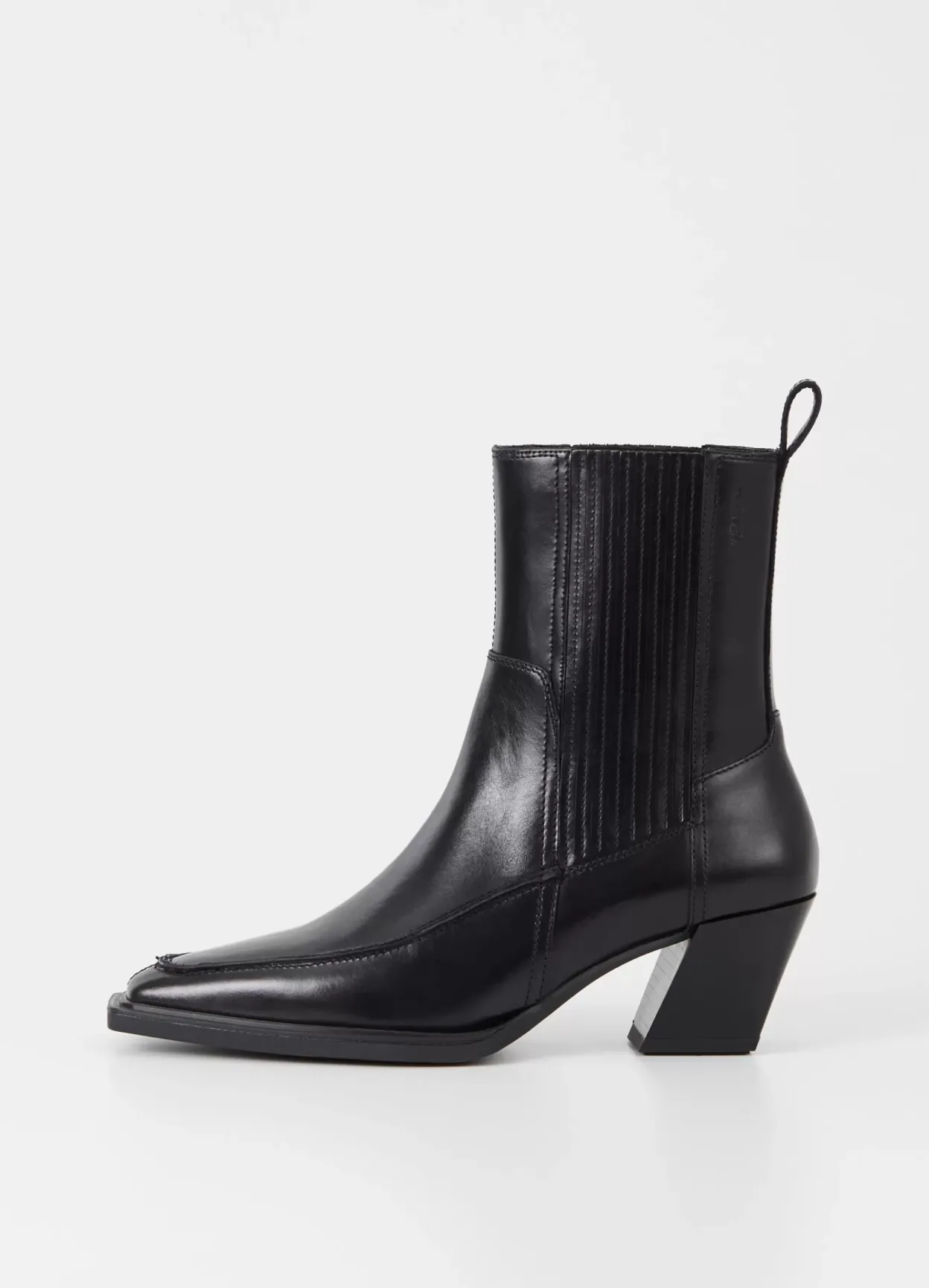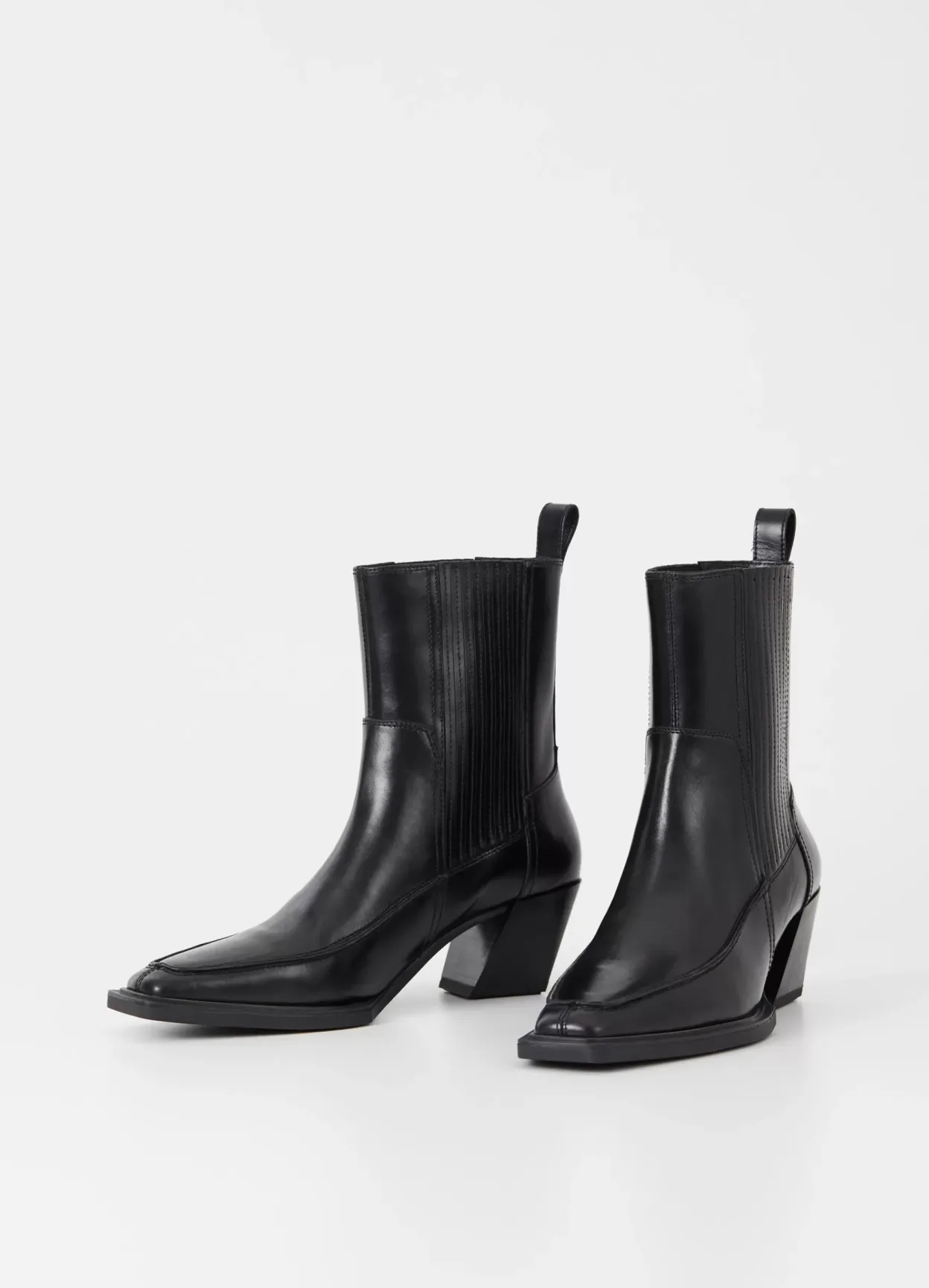 Alina er sæsonens westerninspirerede ankelstøvler med en moderne silhuet. Støvlerne er i sort skind med en spids tåform, plisserede elastikpaneler og detaljerede sømme. Den asymmetriske blokhæl er 62 mm.