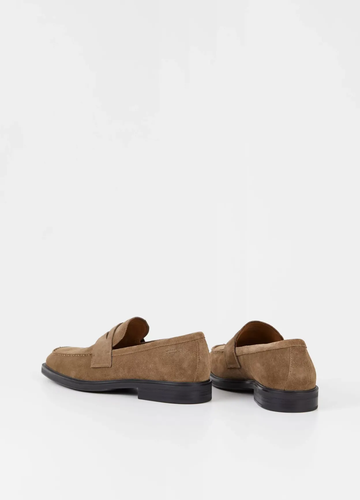 Andrew er elegante penny loafers med et tidløst udseende. Modellen er lavet i beige ruskind med klassisk pennyrem over foden samt rund tå med moc-toe detaljer. Hælen er 30 mm.
