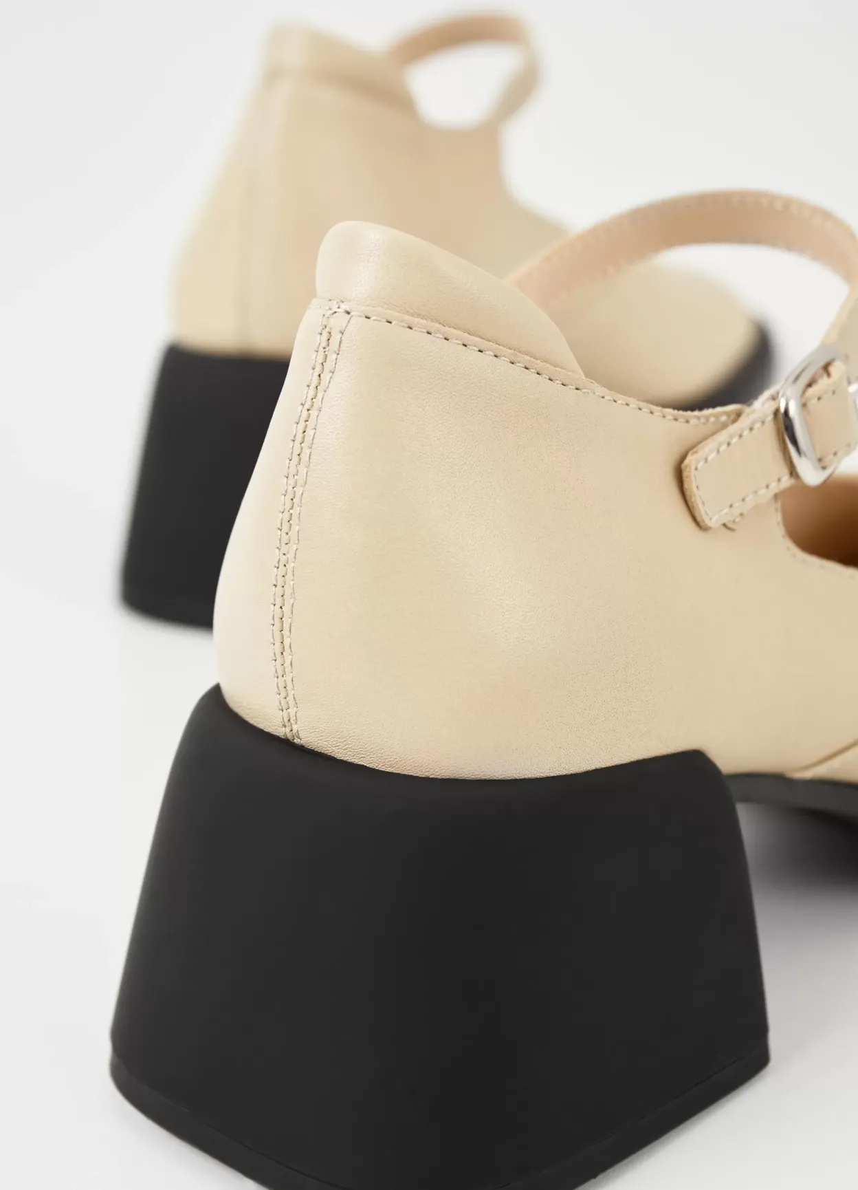 Ansie er stilrenet pumps med en moderne silhuet. Modellen er i offwhite læder med rund tå og en dekorativ ankelrem med spænde. Blokhælen går lidt ud af og er 59 mm høj.