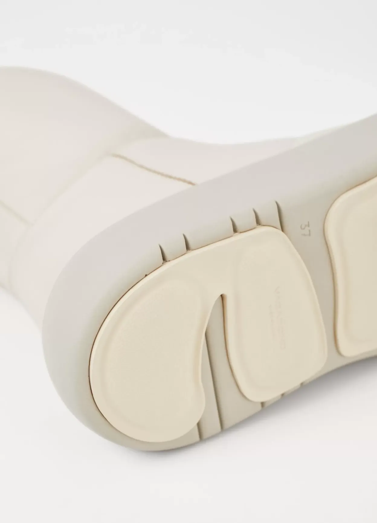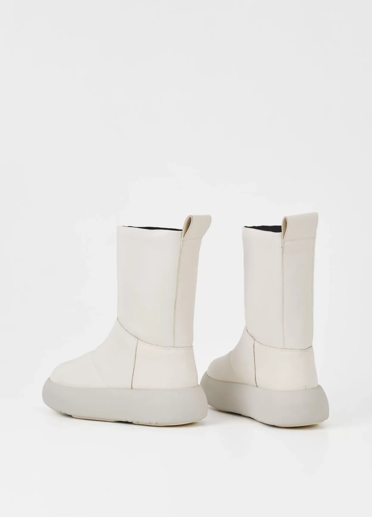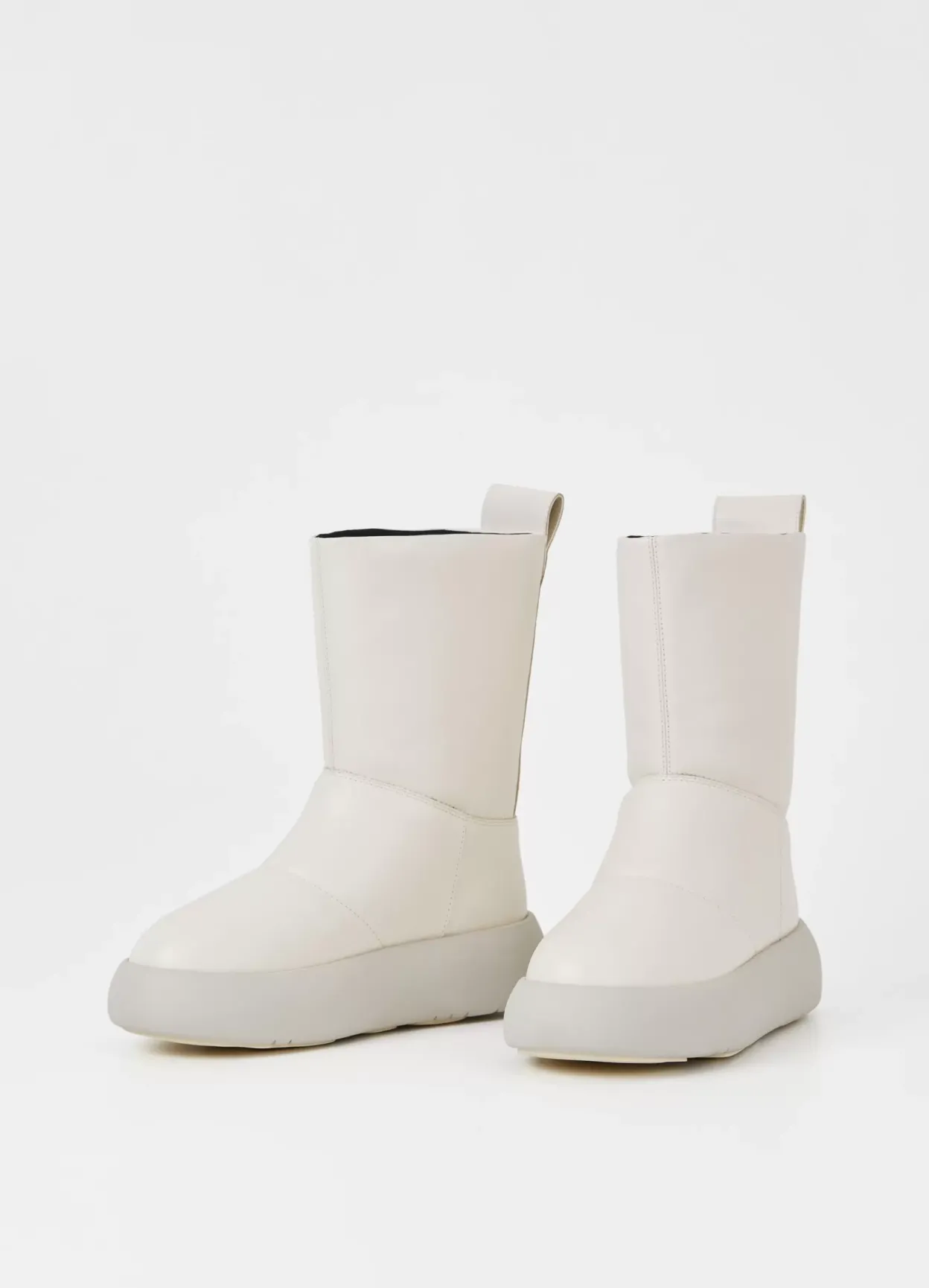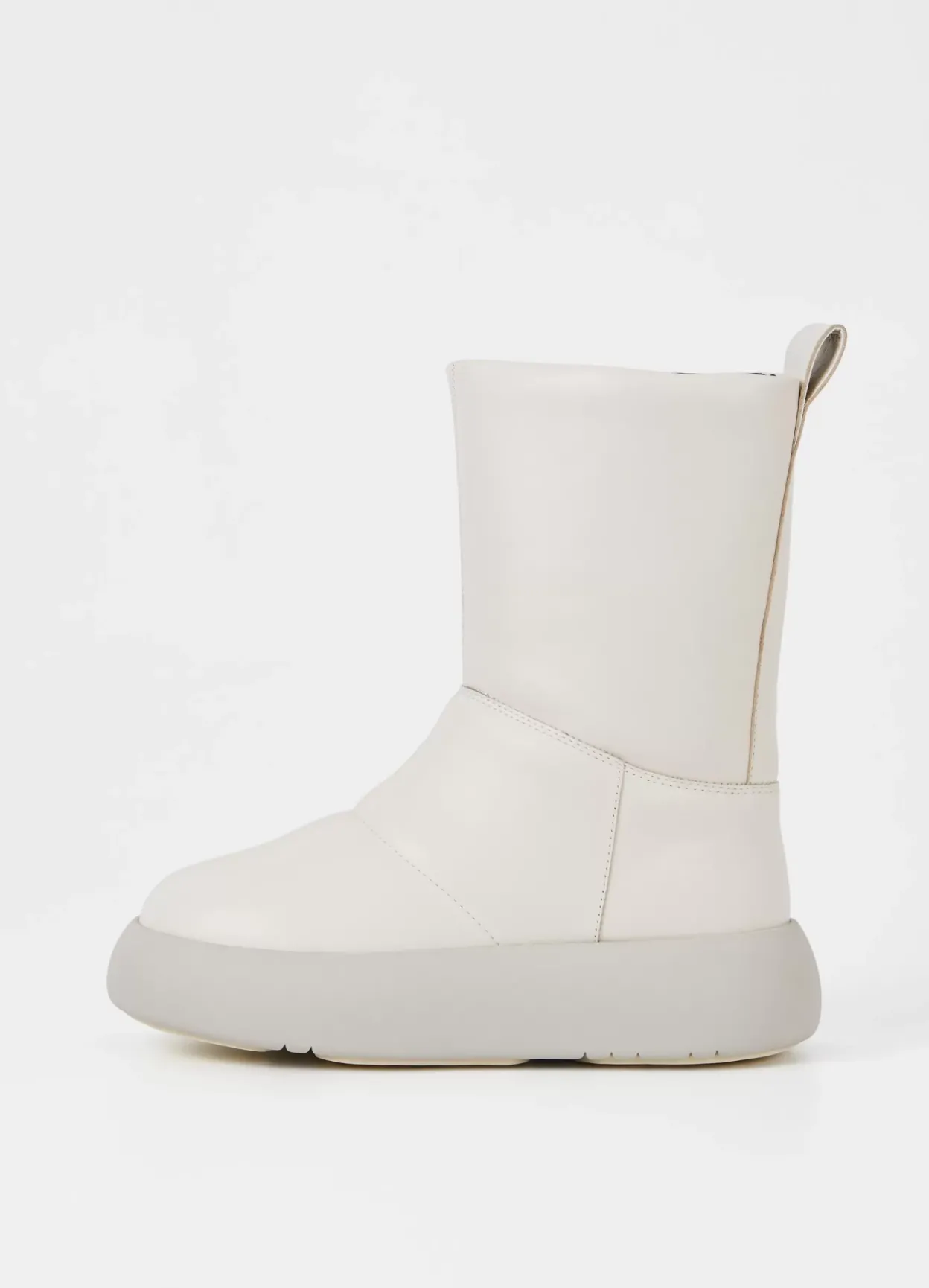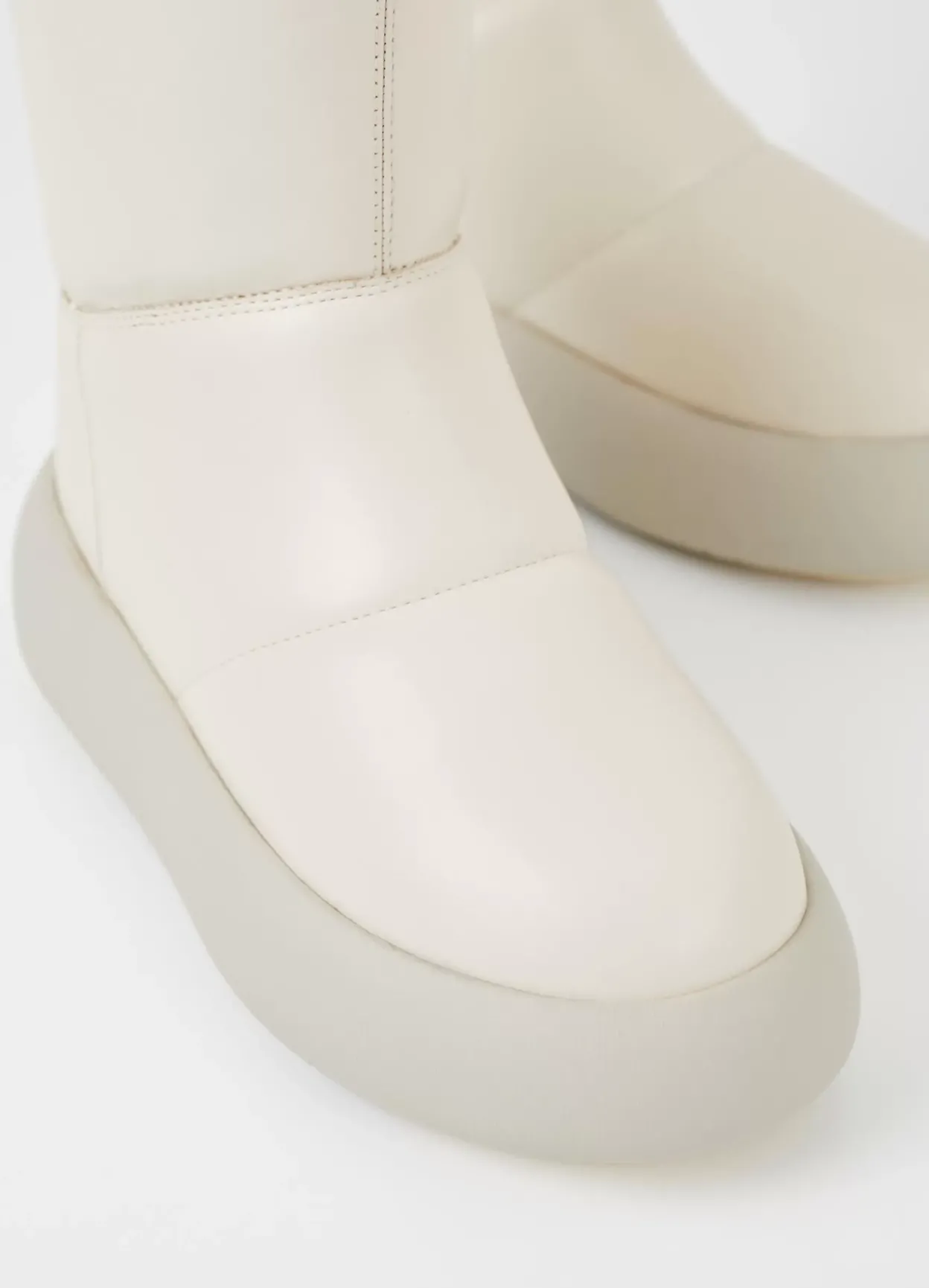 Aylin er polstrede snow boots med et moderigtigt design og mellemhøht skafte. Modellen er lavet i off-white læder med dekorative søm og en bred hælstrop. Modellen har en solid platformsål i lysegrå, som giver et monokromt look. Højden på sålen er 54 mm.