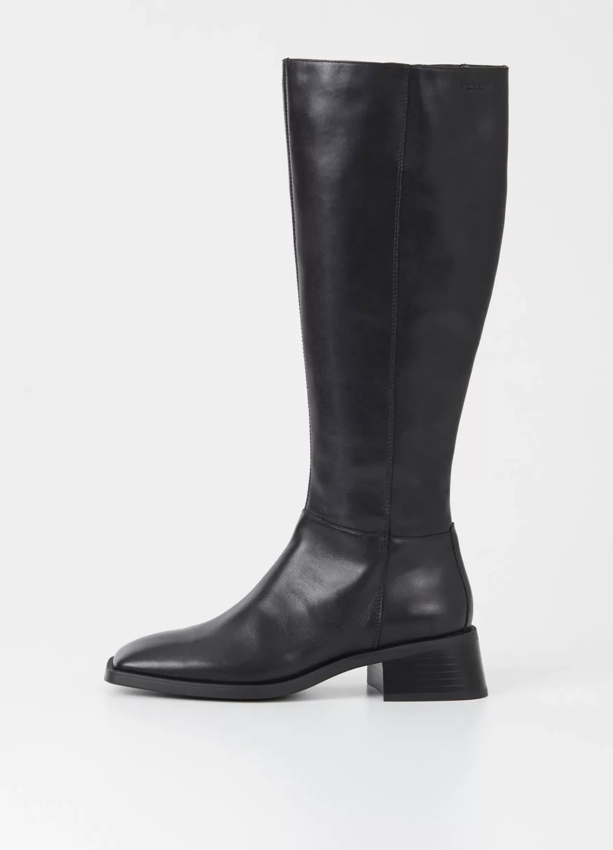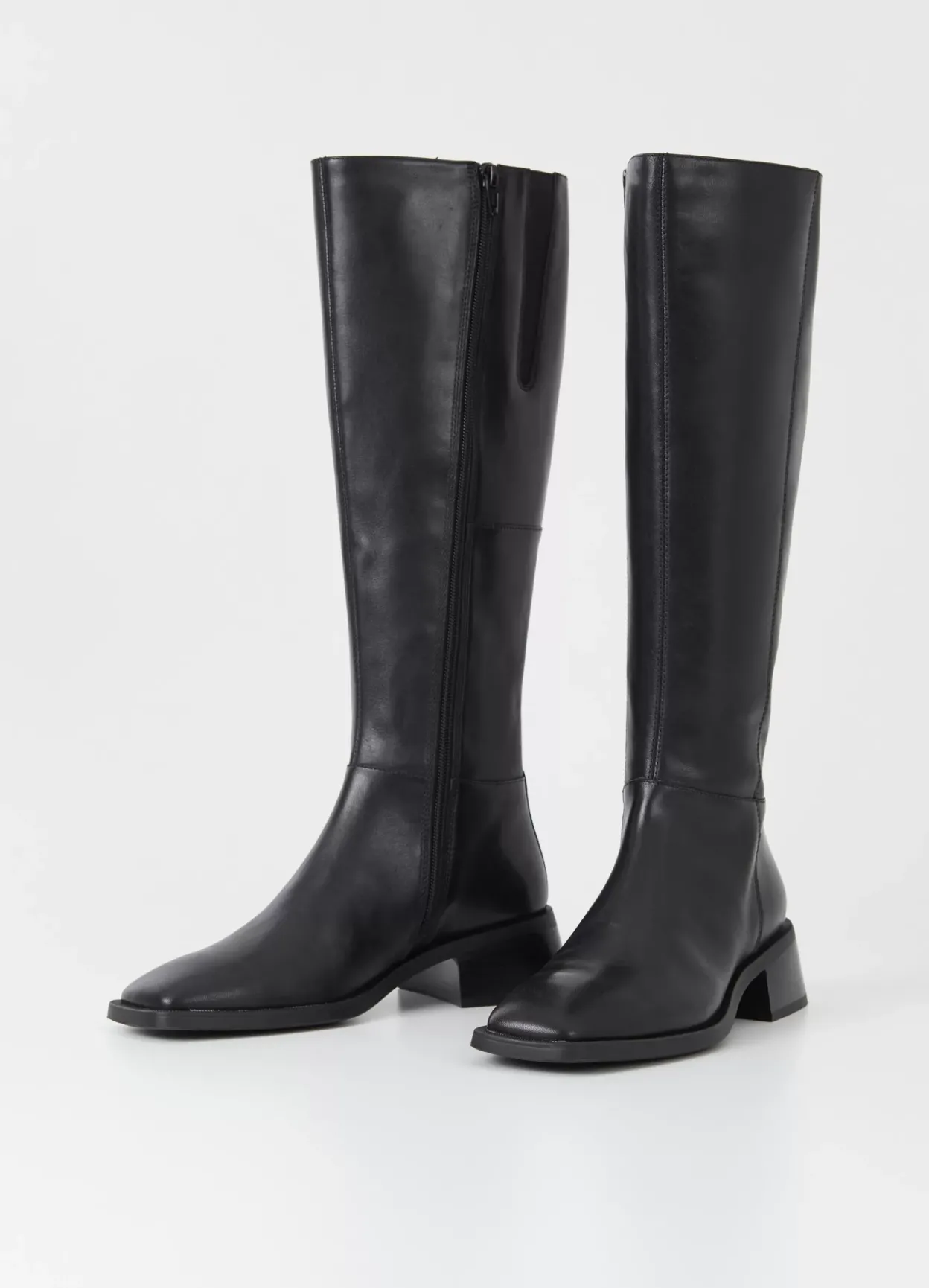 Blanca er tidløse støvler med en moderne silhuet. Modellen er i sort læder med firkantet tåform, knæhøjt skaft og lynlås på indersiden. Støvlerne har hæle med svaj på 47 mm.