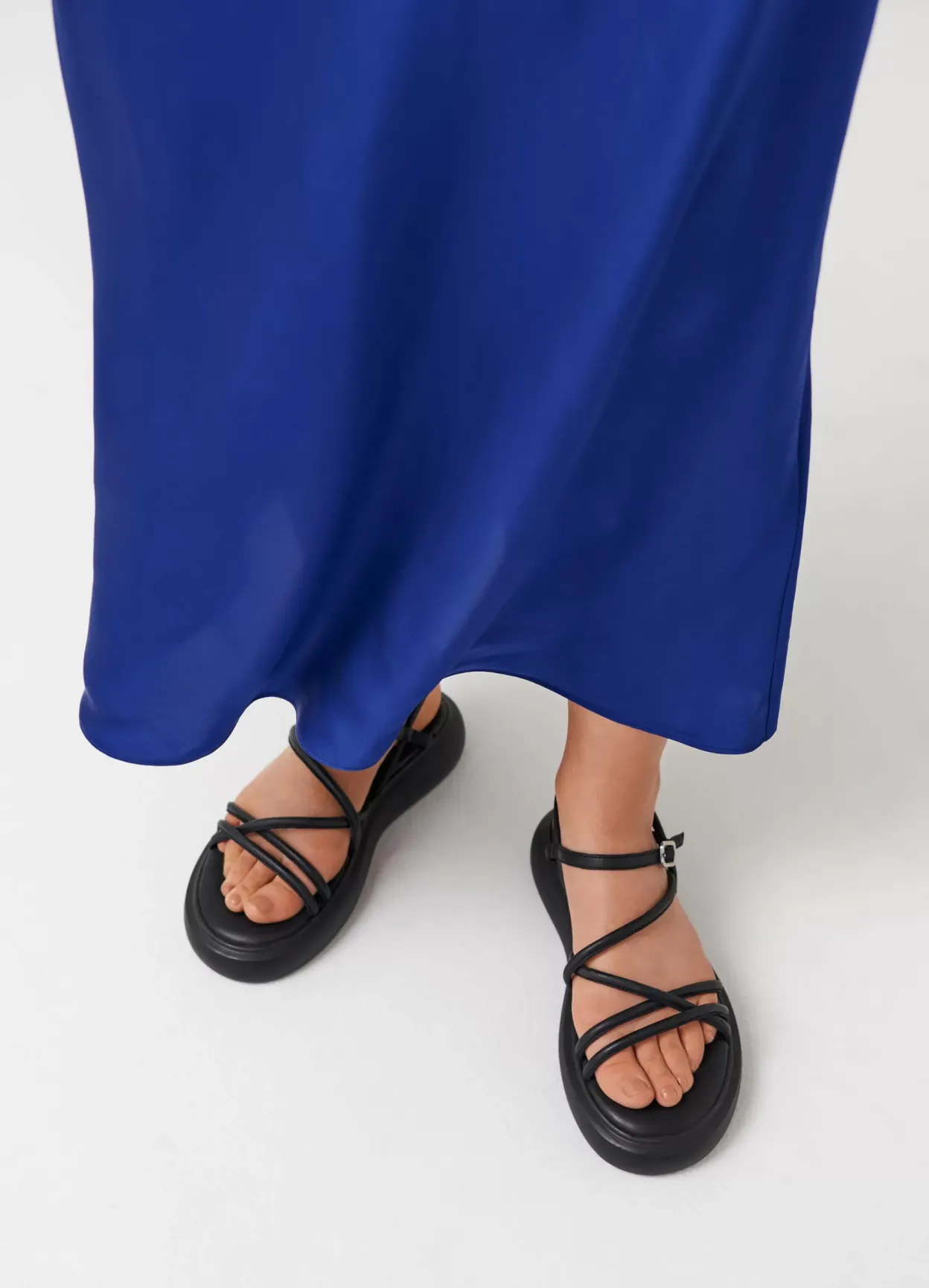Blenda er minimalistiske remsandaler med en moderne silhuet. Oversiden er i sort læder med smalle, runde remme, som går over foden samt justerbare ankelremme. Indersålen er polstret og ydersålen er 40 mm.