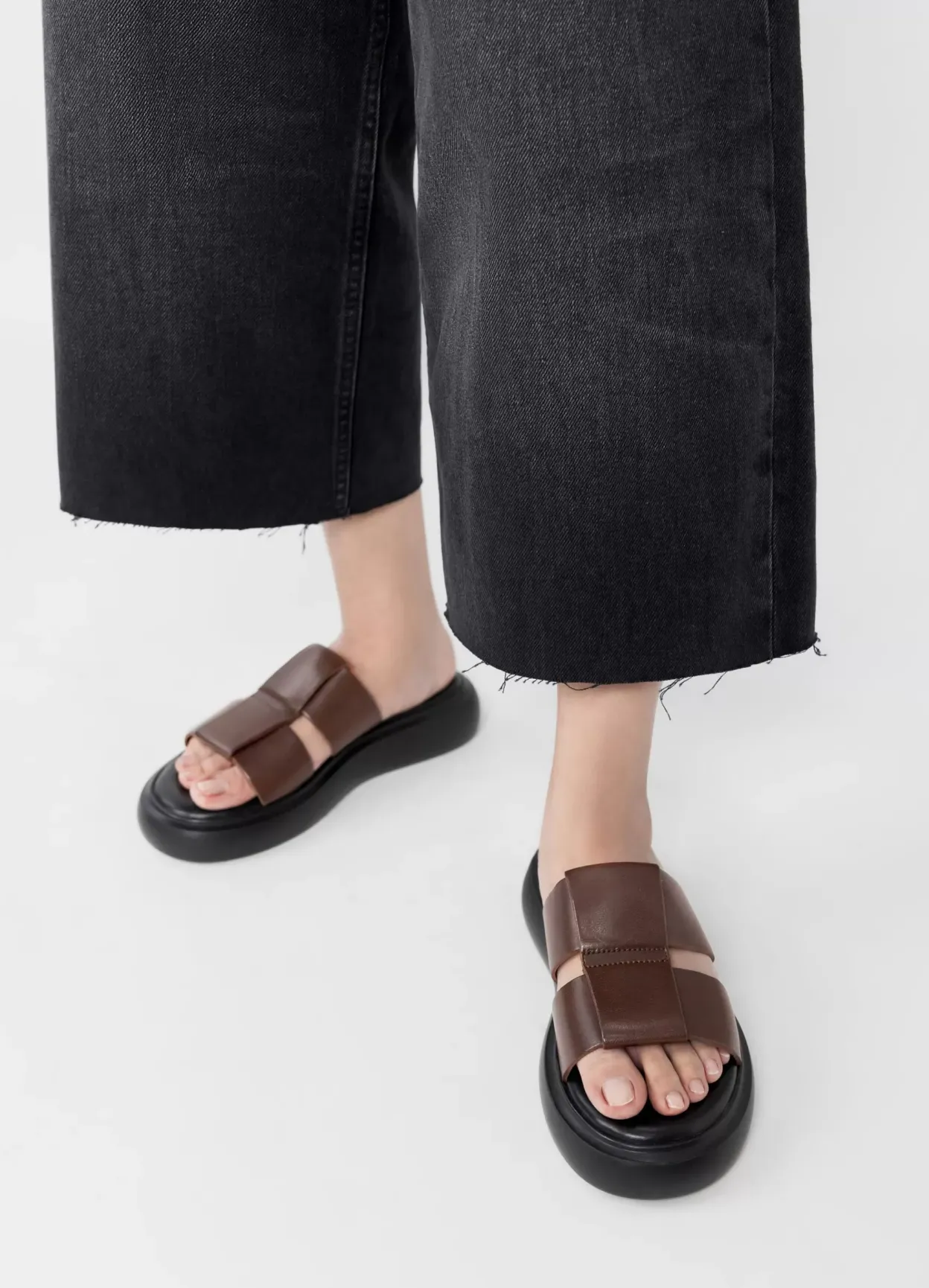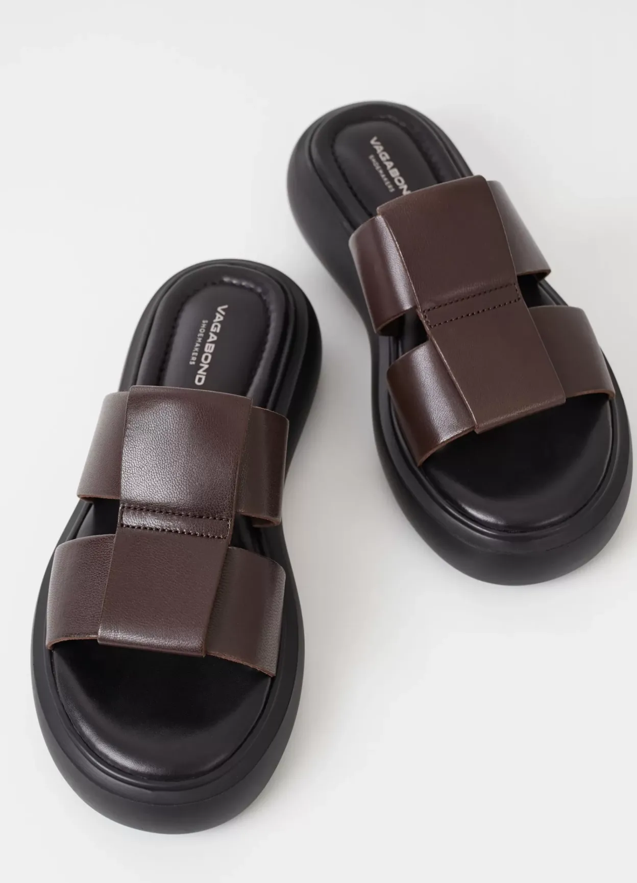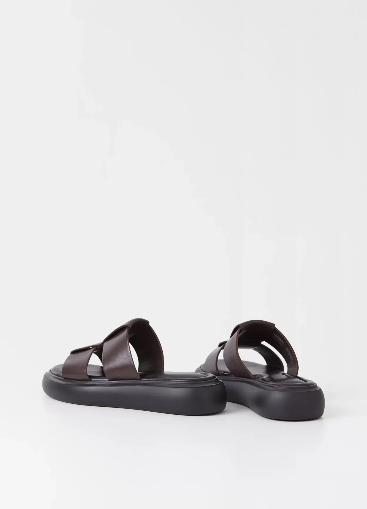 Blenda er elegante slip-in sandaler med en rund silhuet. Modellen er lavet i mørkebrunt læder med brede sammenflettede remme over foden samt en solid ydersål på 40 mm.