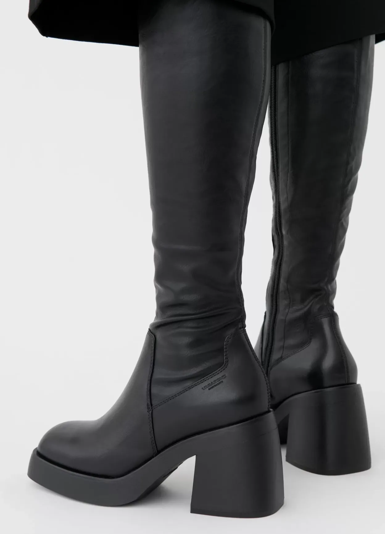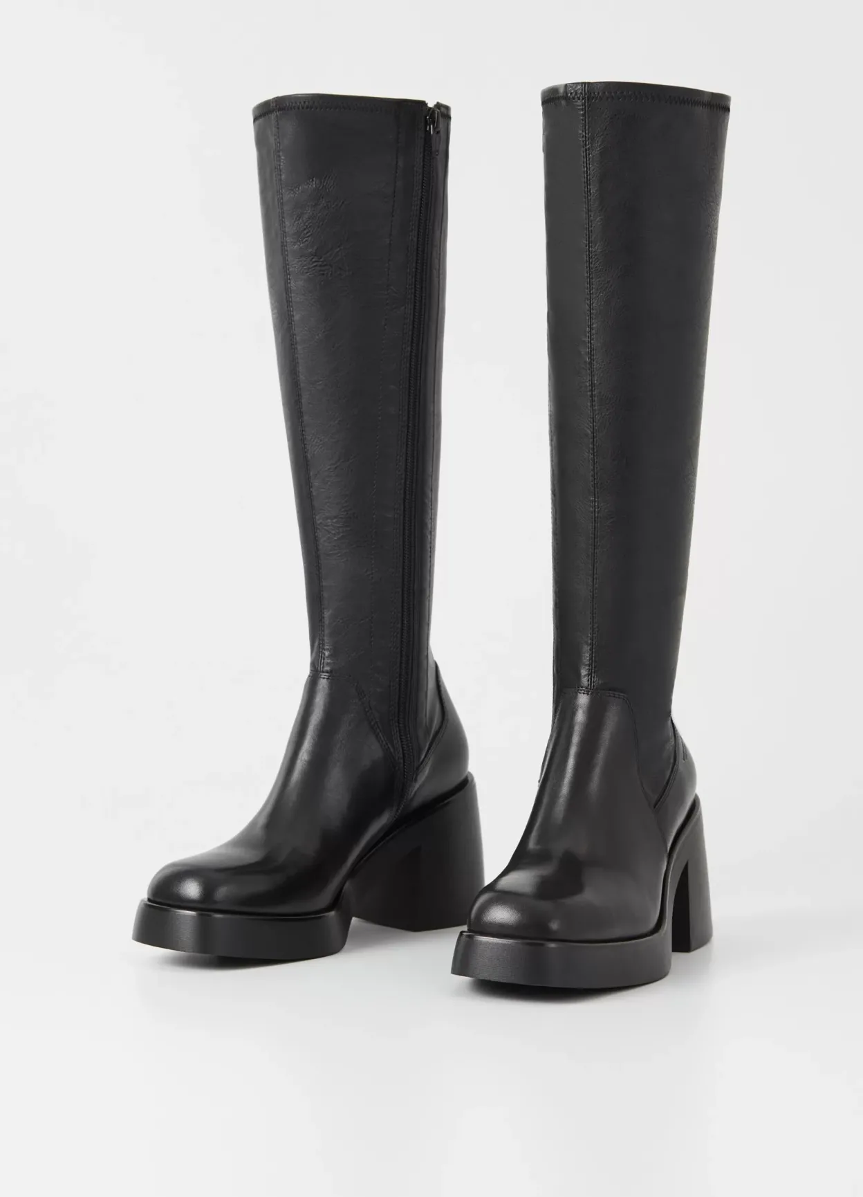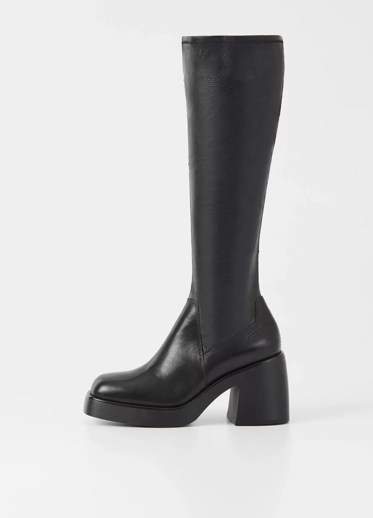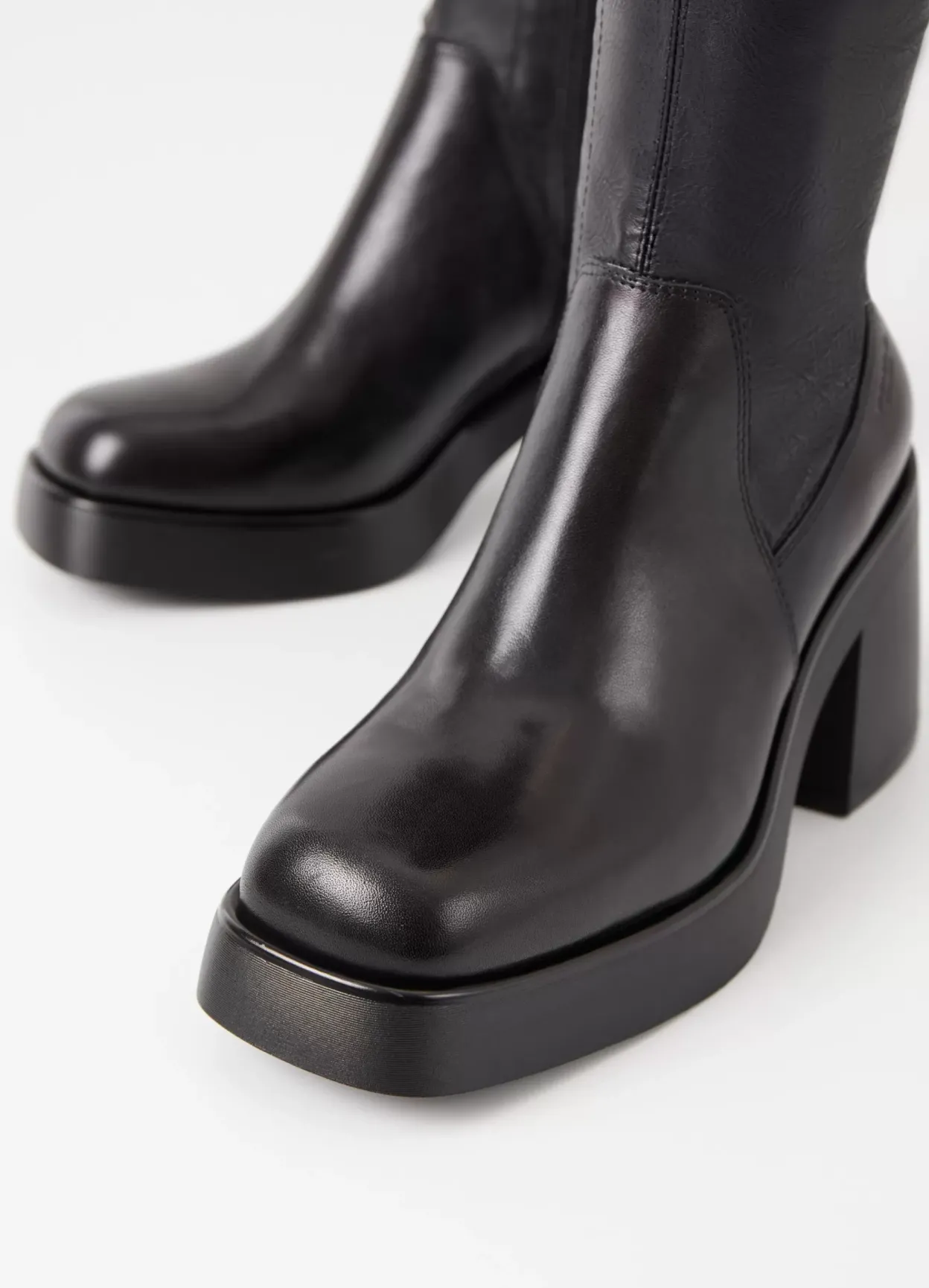 Plateau-støvlen Brooke har en moderne, chunky silhuet. Modellen er i sort læder/syntetisk materiale med et elastisk skaft, lynlås og firkantet tå. Den robuste ydersål har 87 mm kraftige blokhæle.