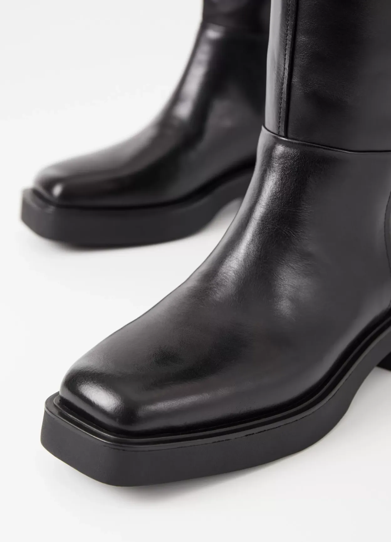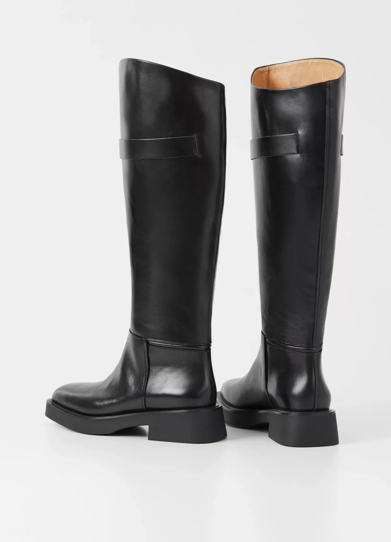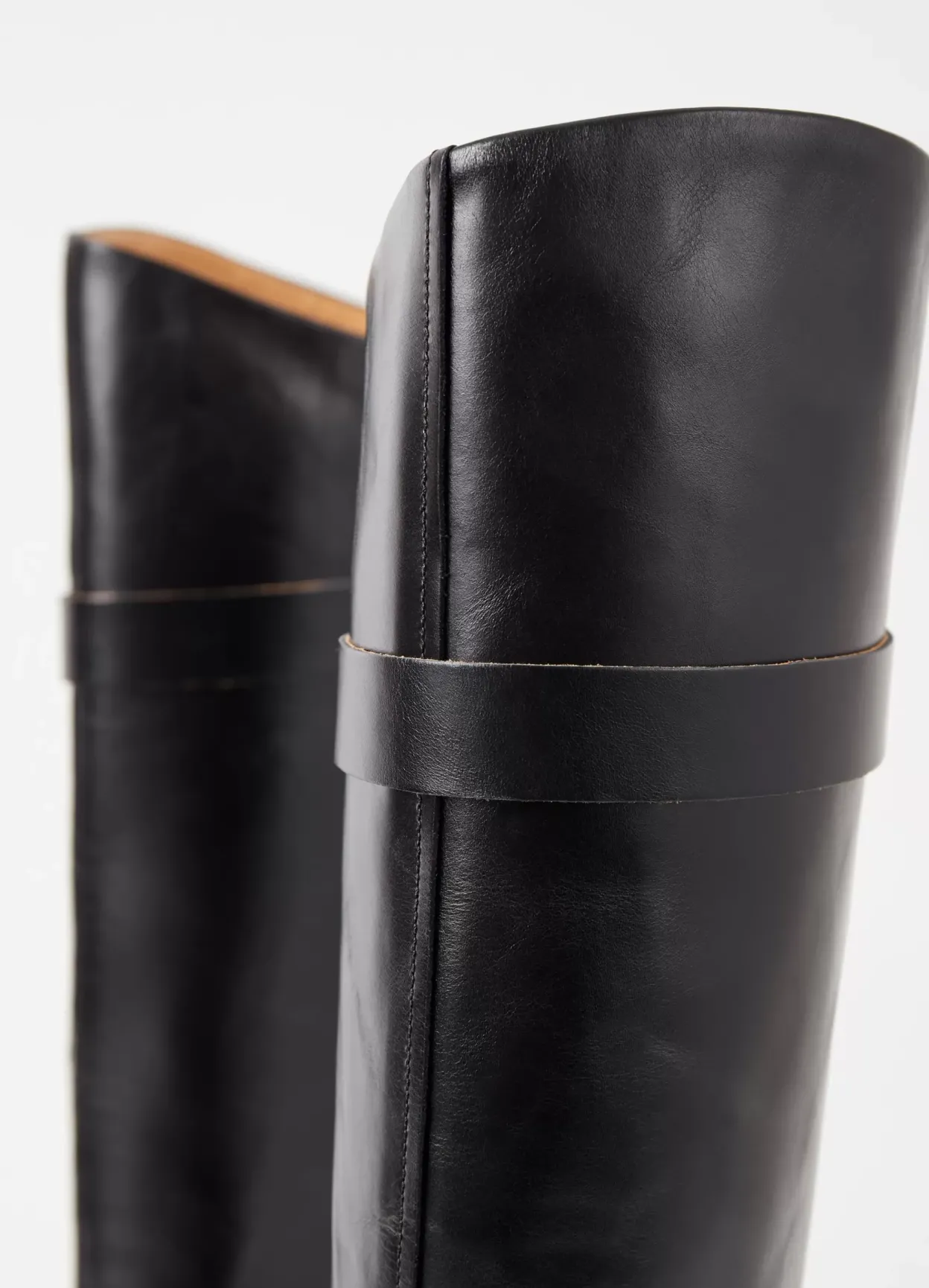 Carmen er en ny version af den klassiske ridestøvle. Modellen er lavet i sort læder, og kommer med firkantet tå og et knæhøjt skafte med en dekorativ læderstrop øverst. Den robuste ydersål har en 40 mm lav hæl. Detaljen: blødt for i læder.