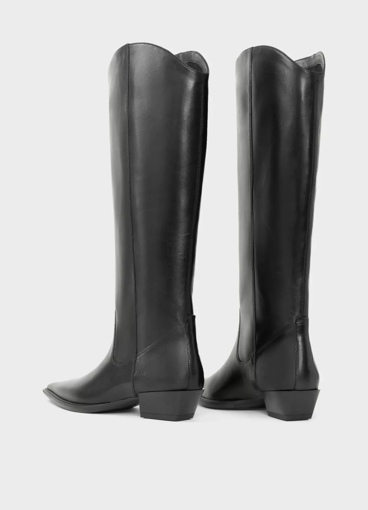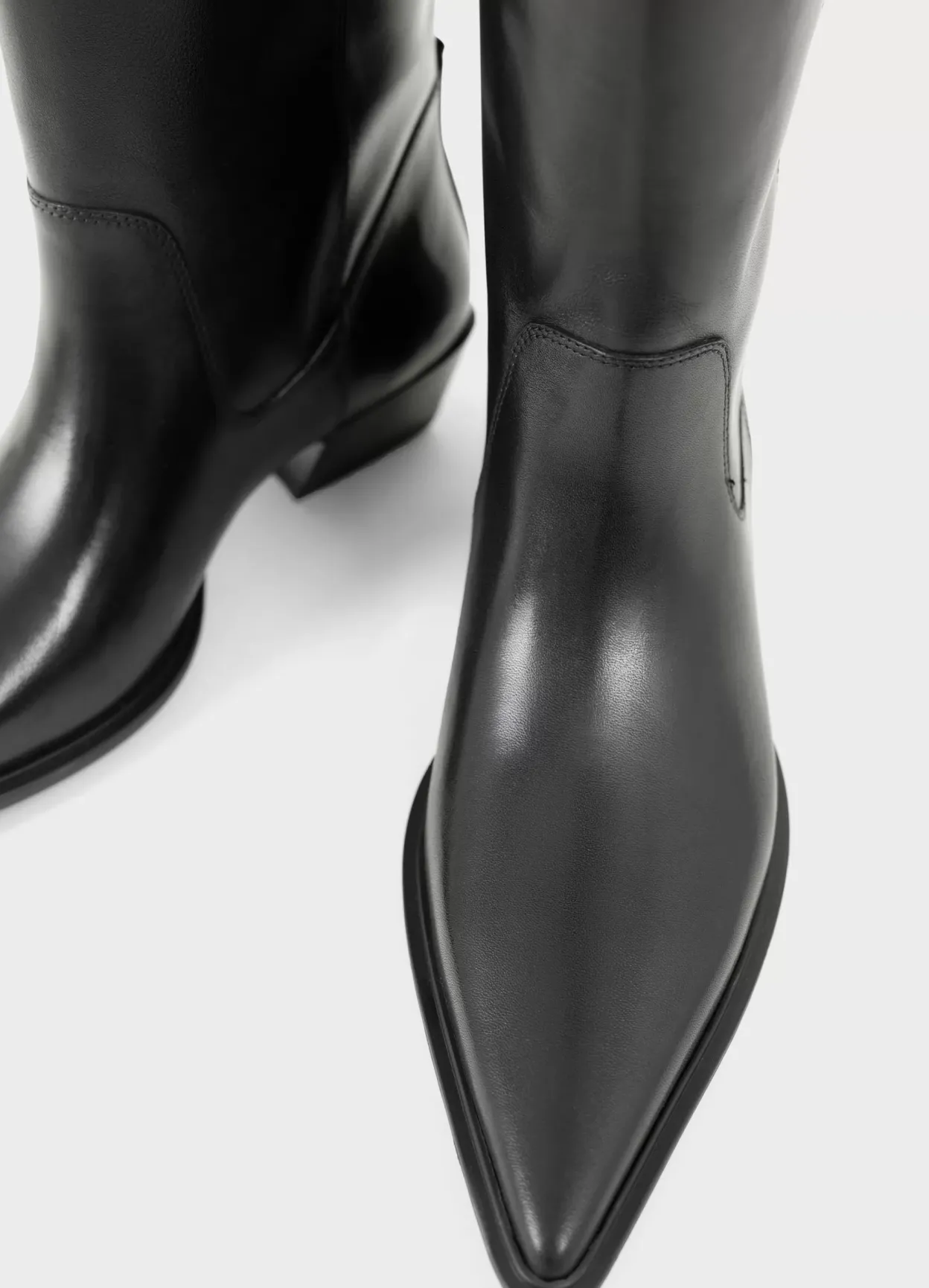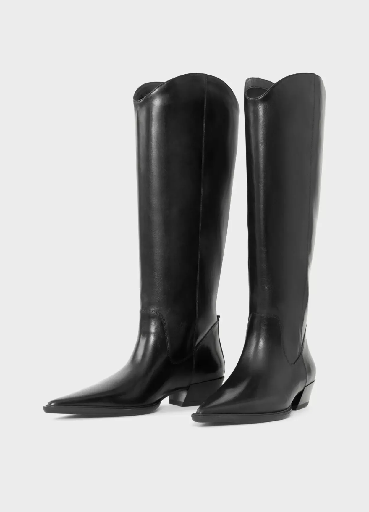 Cassie er western-inspirerede støvletter med knæhøjt skafte. Modellen er lavet i sort læder med buet kant øverst samt spids tå. Den vinklede hæl er 40 mm. Pull-on design.