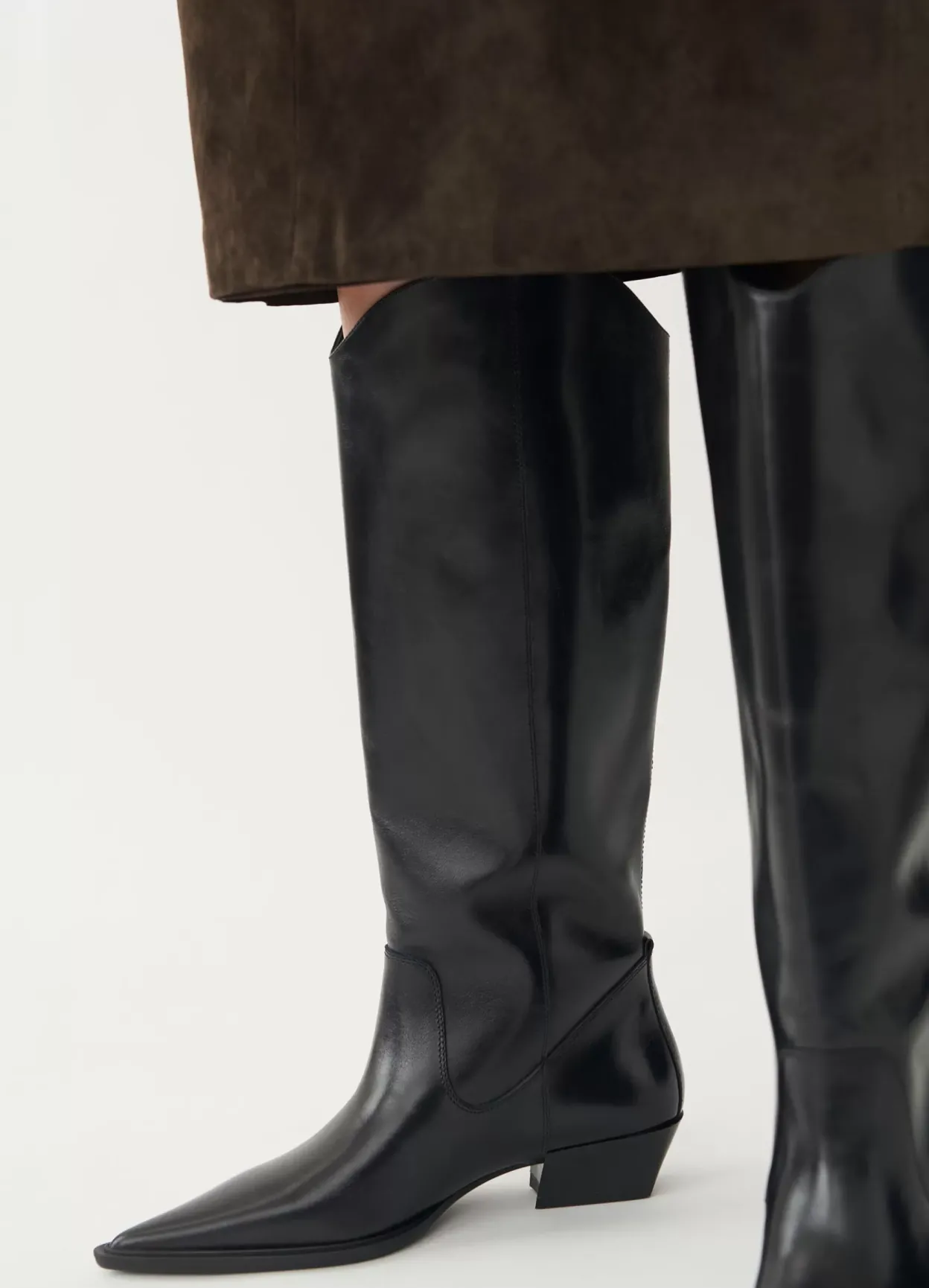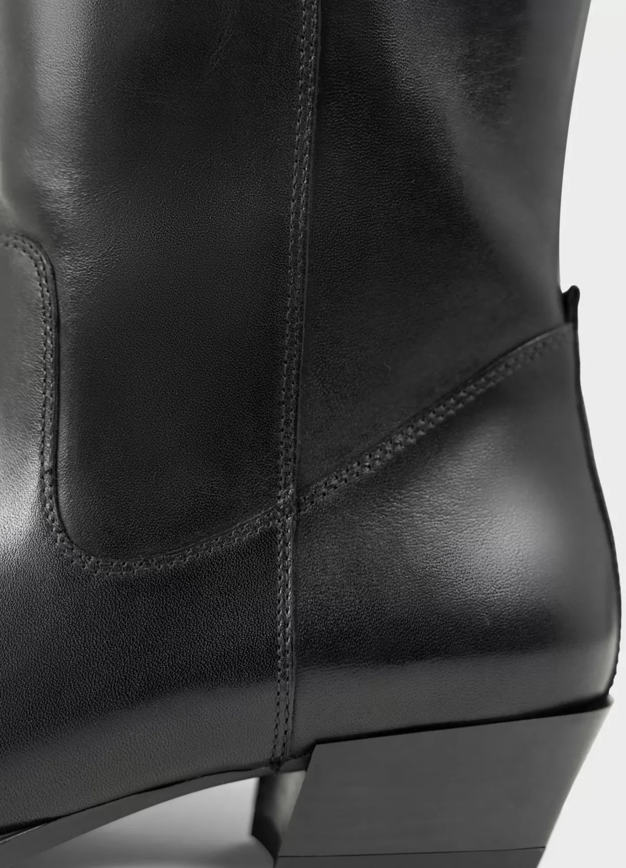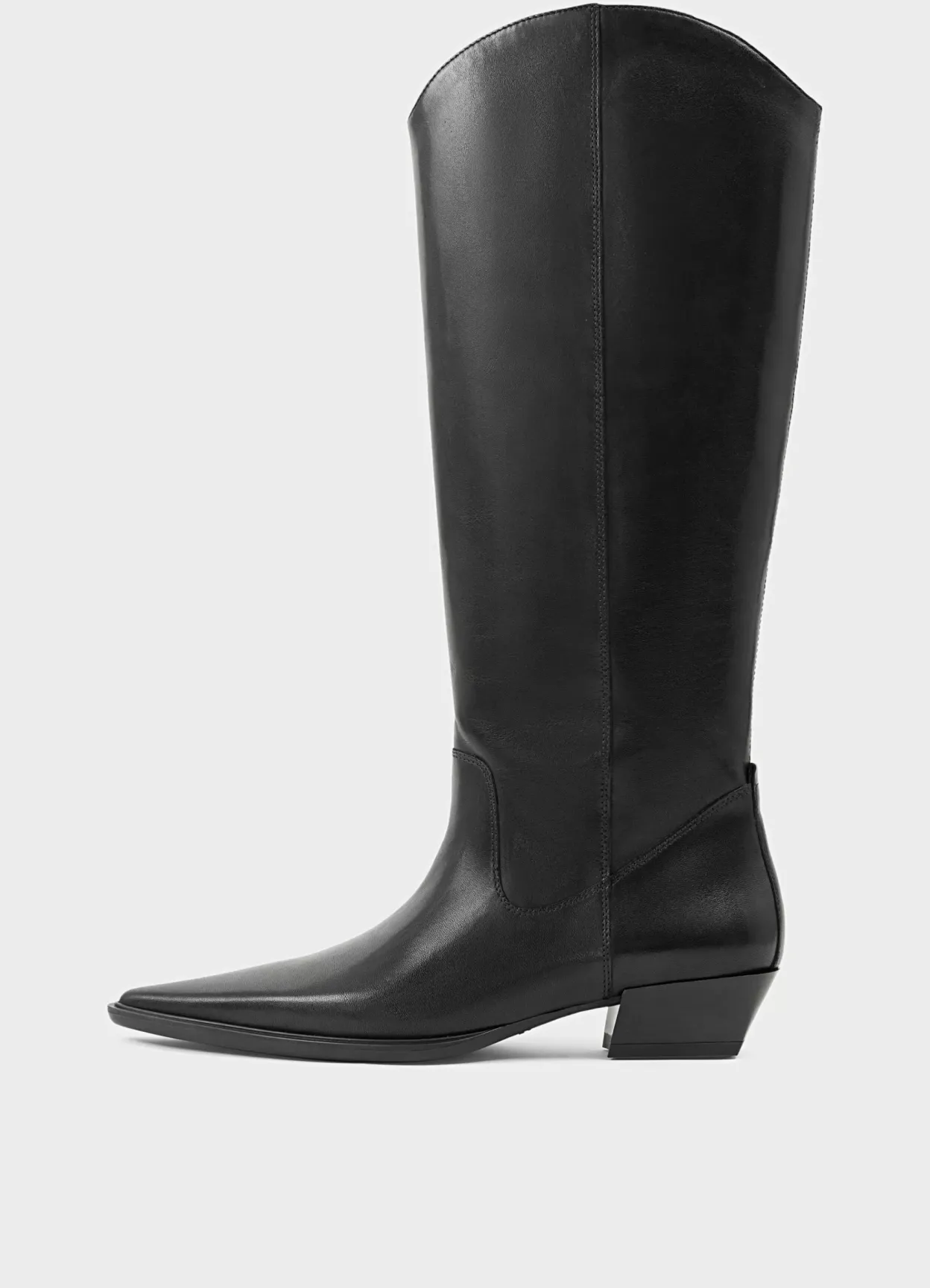 Cassie er western-inspirerede støvletter med knæhøjt skafte. Modellen er lavet i sort læder med buet kant øverst samt spids tå. Den vinklede hæl er 40 mm. Pull-on design.