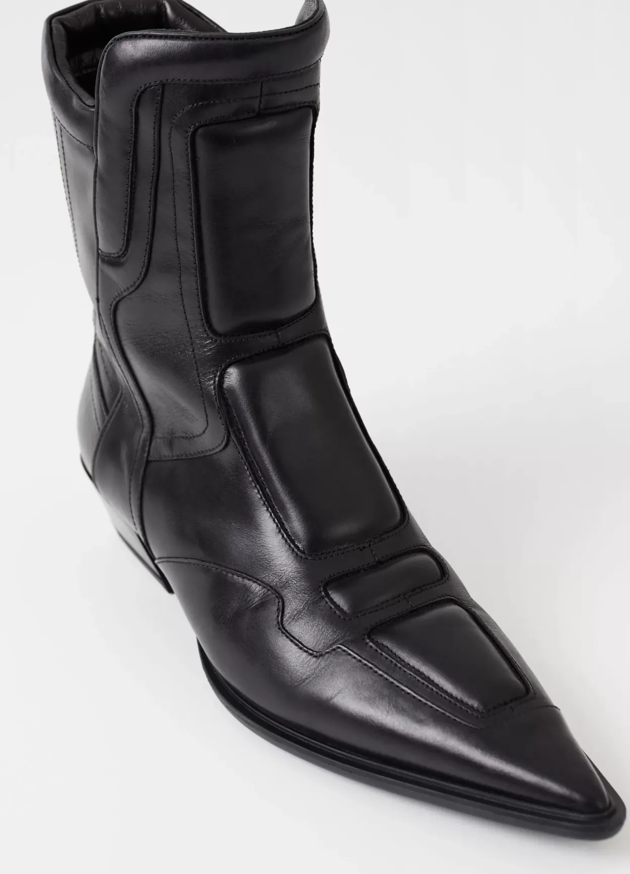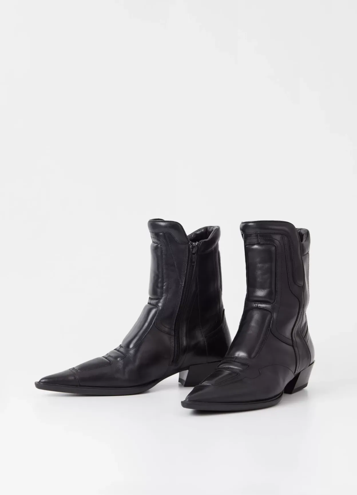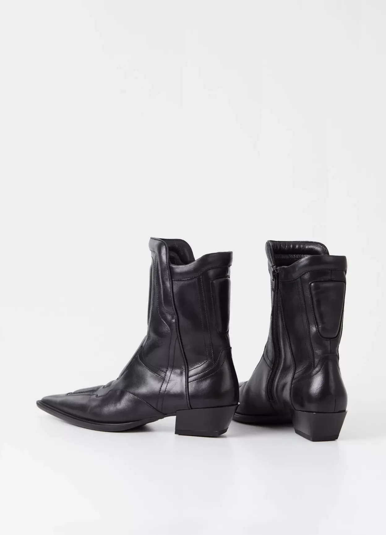 Cassie er biker-inspirerede boots med en spids silhuet. Modellen er lavet i sort læder med dekorative sømme og polstrede detaljer – som skaber et unikt look. Detaljen: mellemhøjt skafte med lynlås langs med indersiden og en spids tåform. Hælen erl 40 mm.