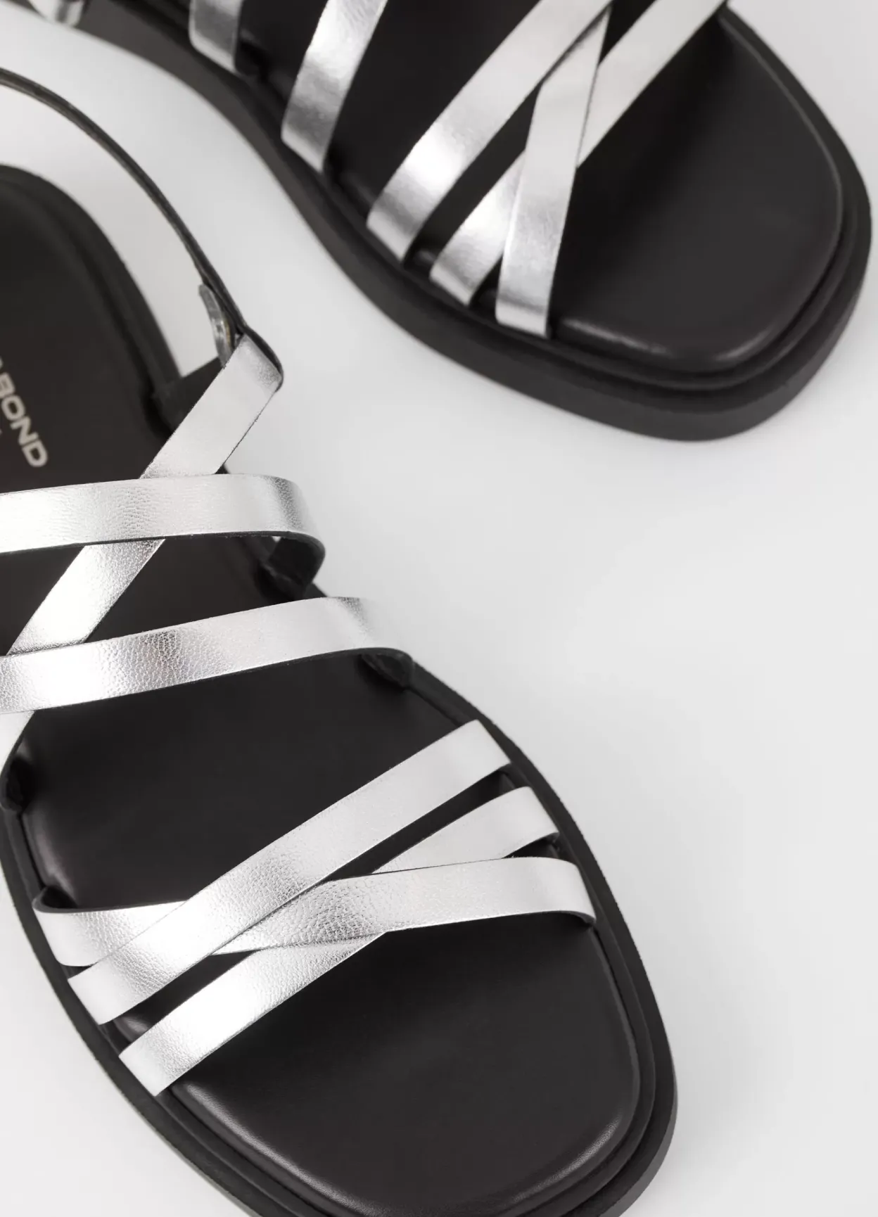 Connie er stilfulde sandaler i et minimalistisk design. Modellen er lavet i sølvfarvet læder med smalle, krydsende remme over foden samt hælrem med sølvfarvet spænde. Sålen er 20 mm. Detaljen: polstret indersål i læder og firkantet tåform.