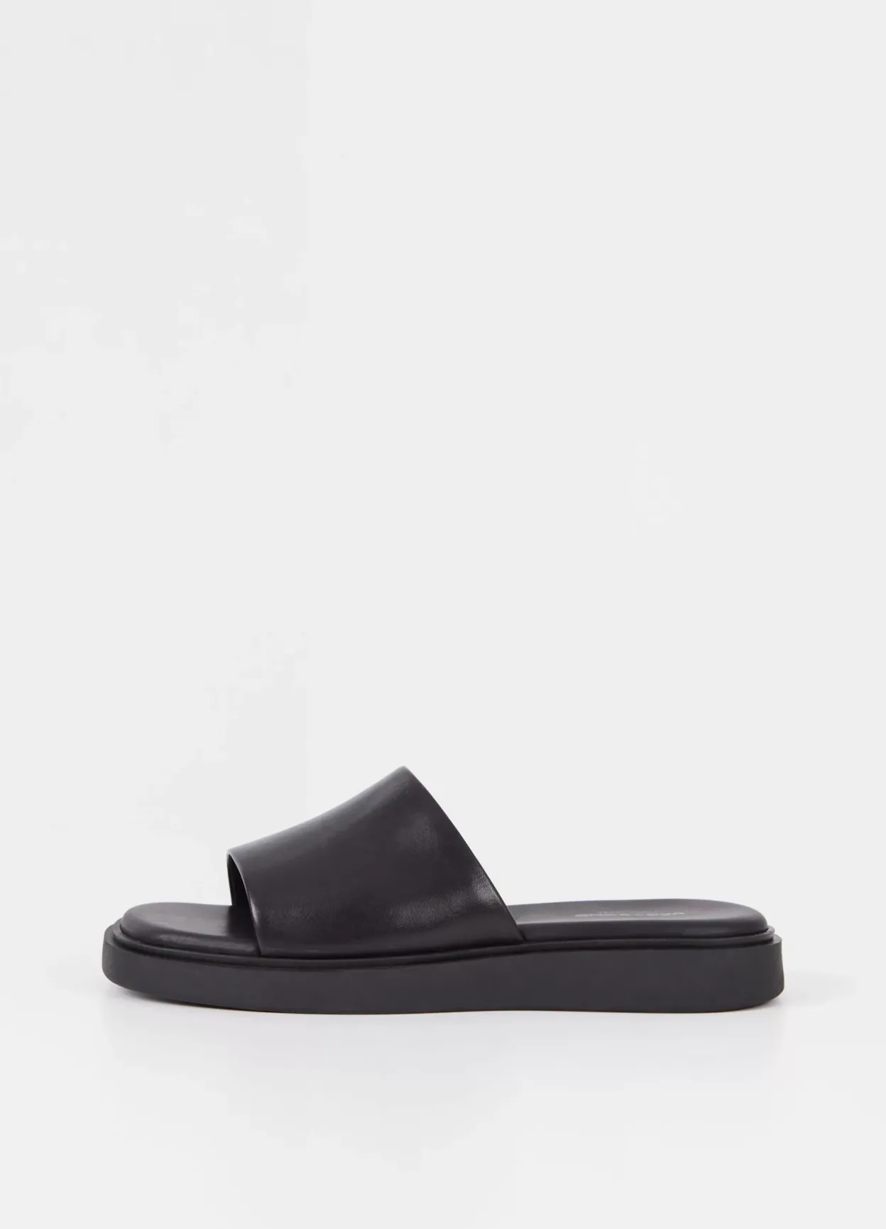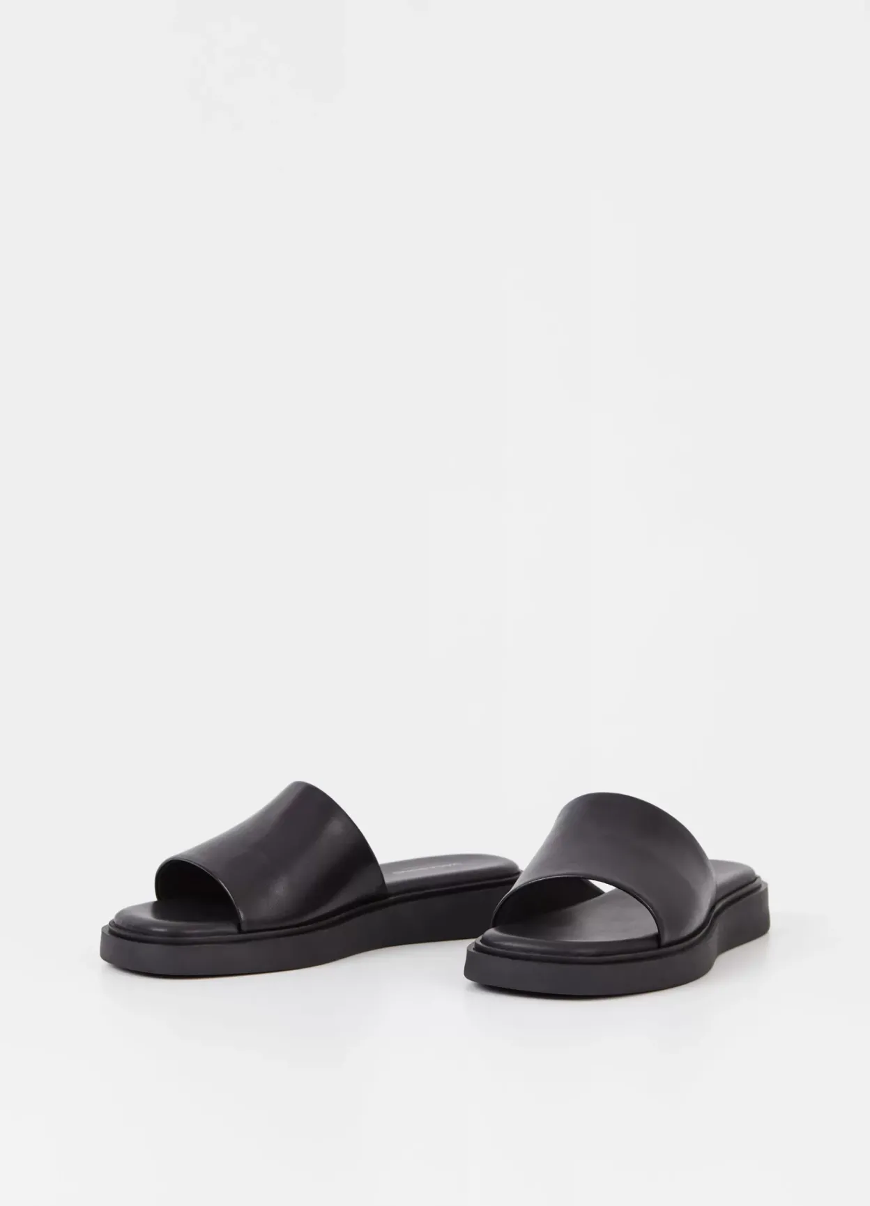 Connie er minimalistiske slip-in sandaler i et tidløst design. Modellen er lavet i sort læder med en bred rem over foden samt firkantet tåform. Sålen måler 20 mm. Detaljen: let polstret indersål i læder.