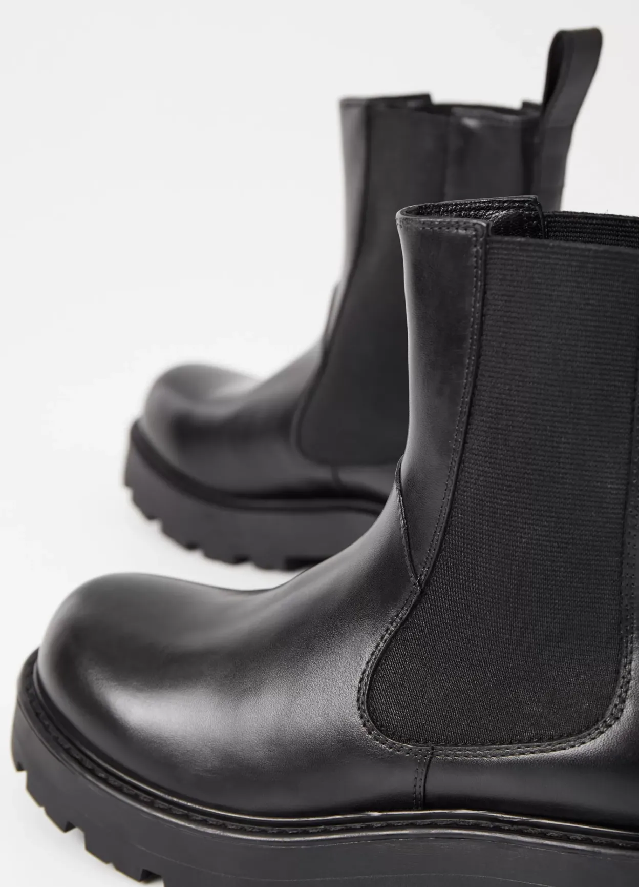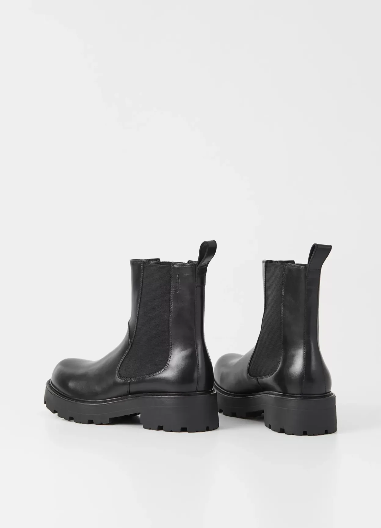 Cosmo 2.0 er chunky Chelsea-støvler i et bikerinspireret design. Modellen er i sort læder med elastiske paneler i skaftet, hælstroppe og rund tå. Støvlen har en robust ydersål med en hæl på 45 mm.