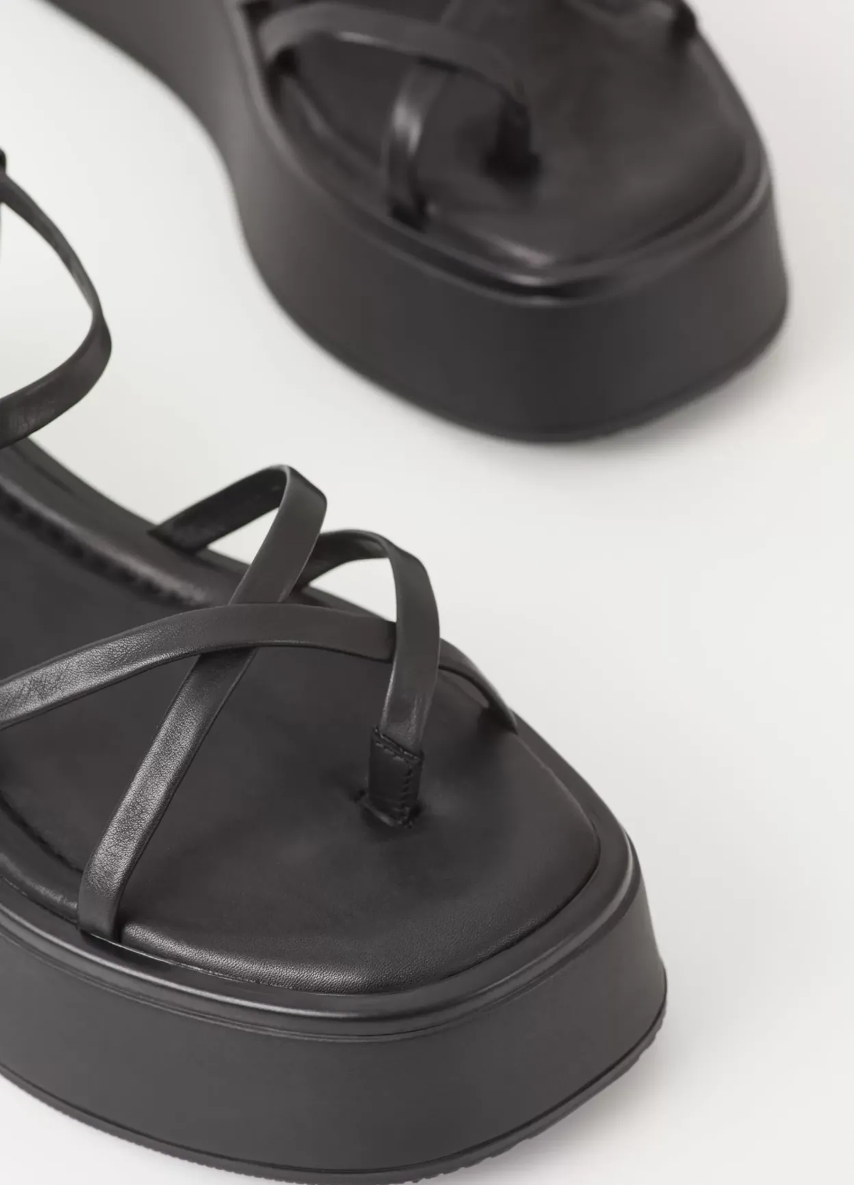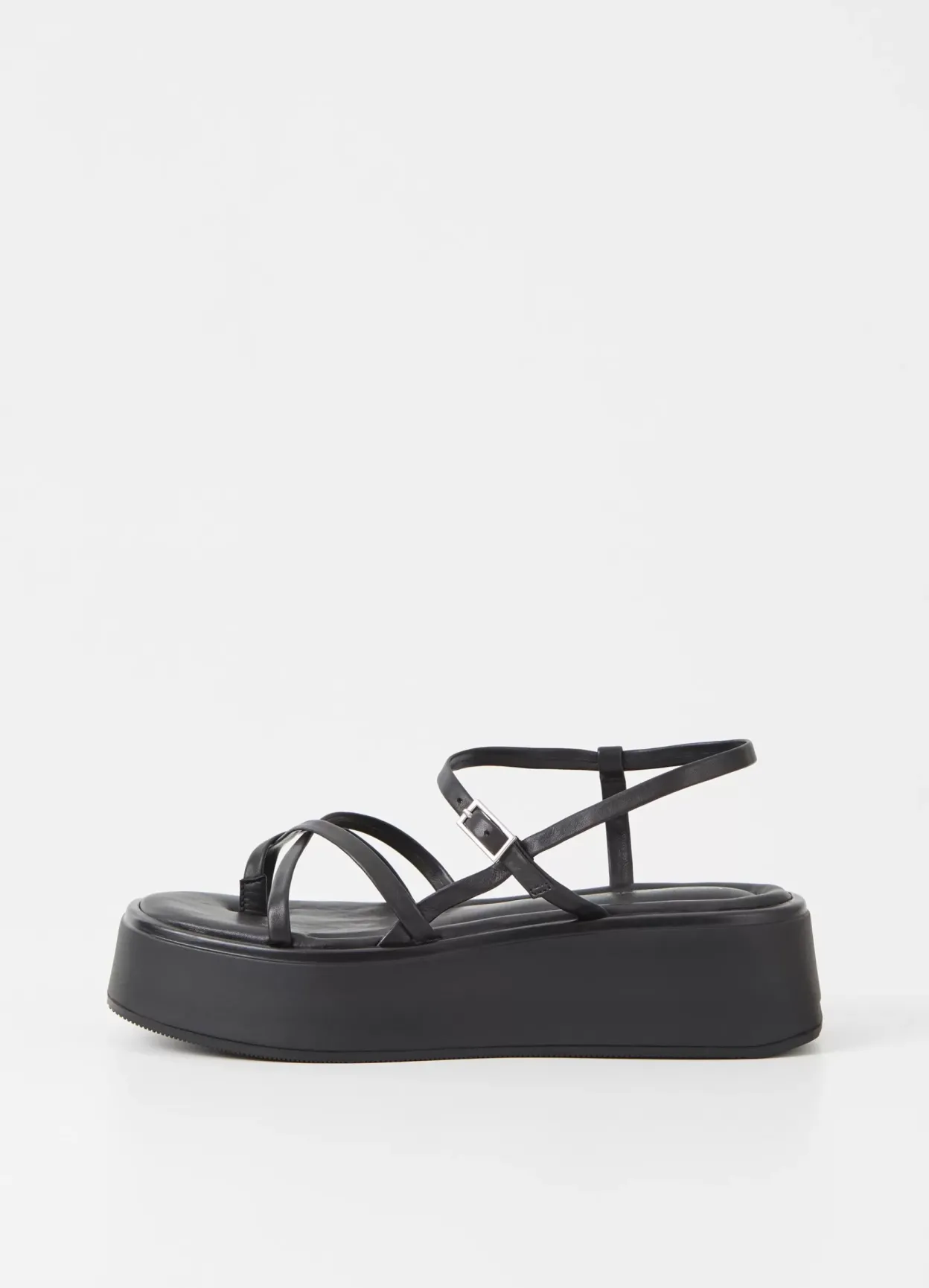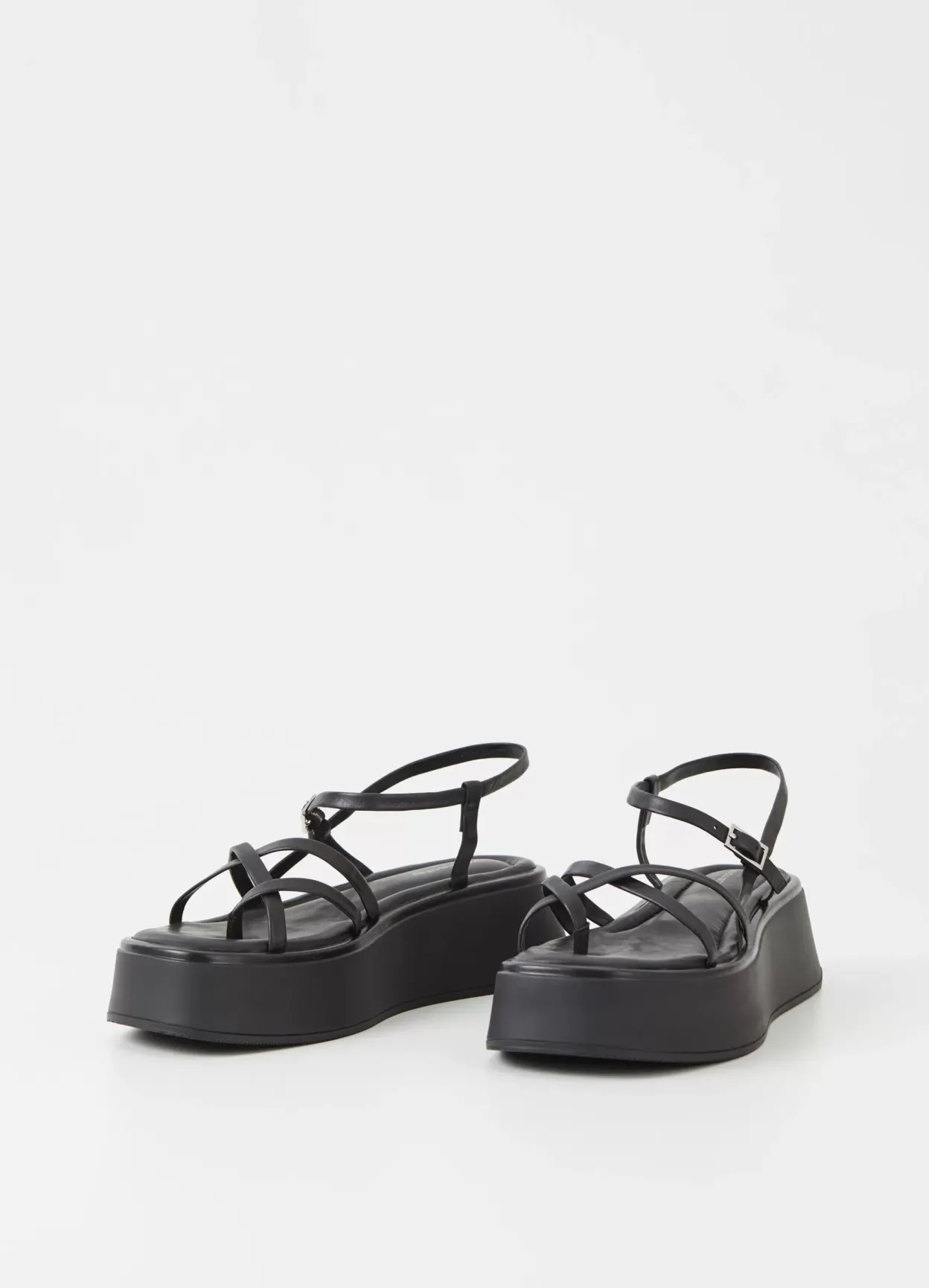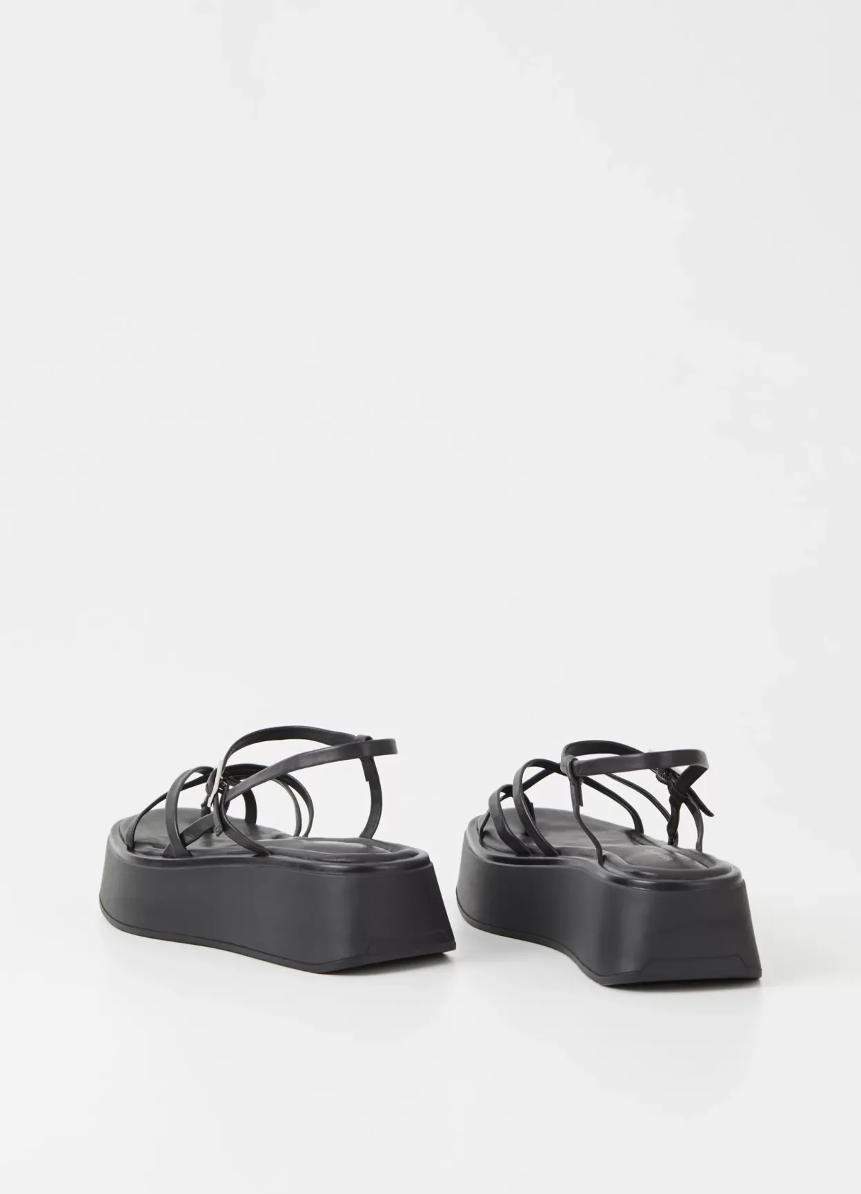 Courtney er moderne remsandaler med en kraftig plateausilhuet. Modellen er i sort læder med tynde remme i læder, polstret indersål og lukning med spænde. Plateausålen går let udaf og er på 50 mm.