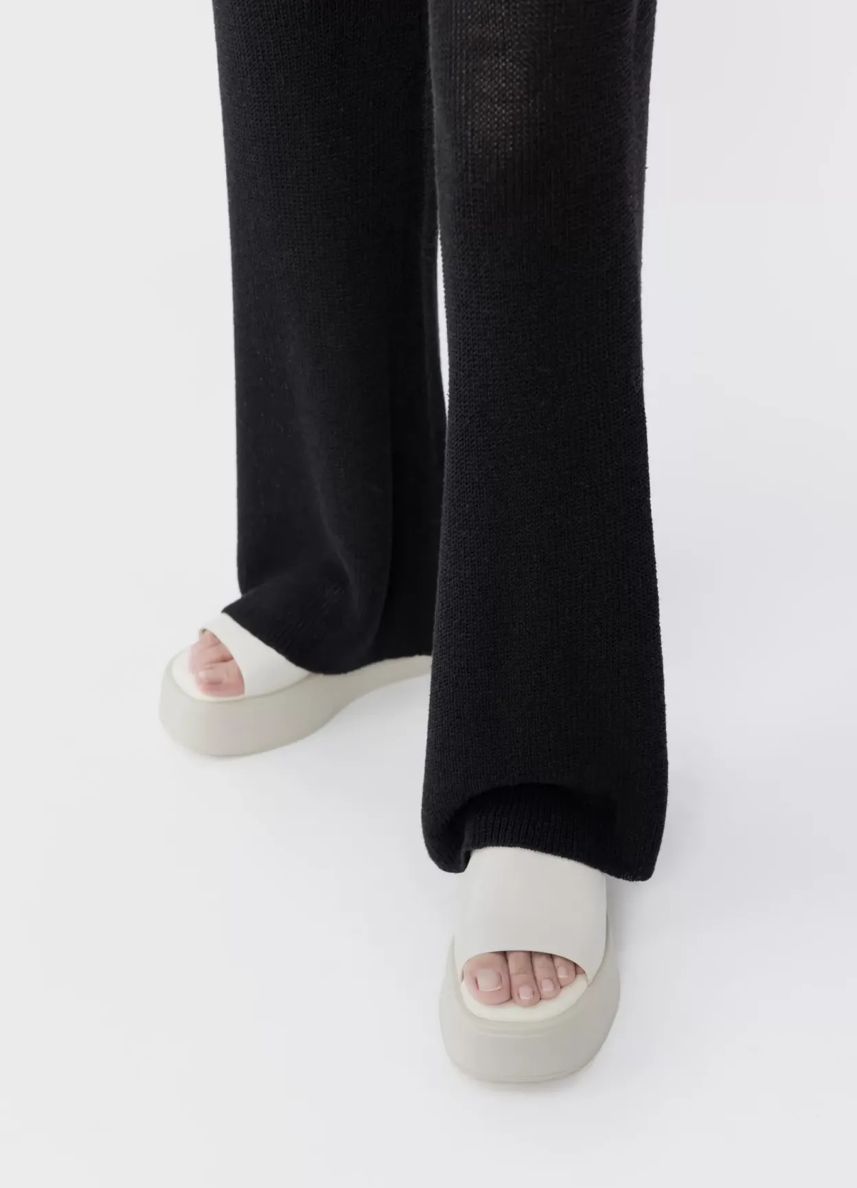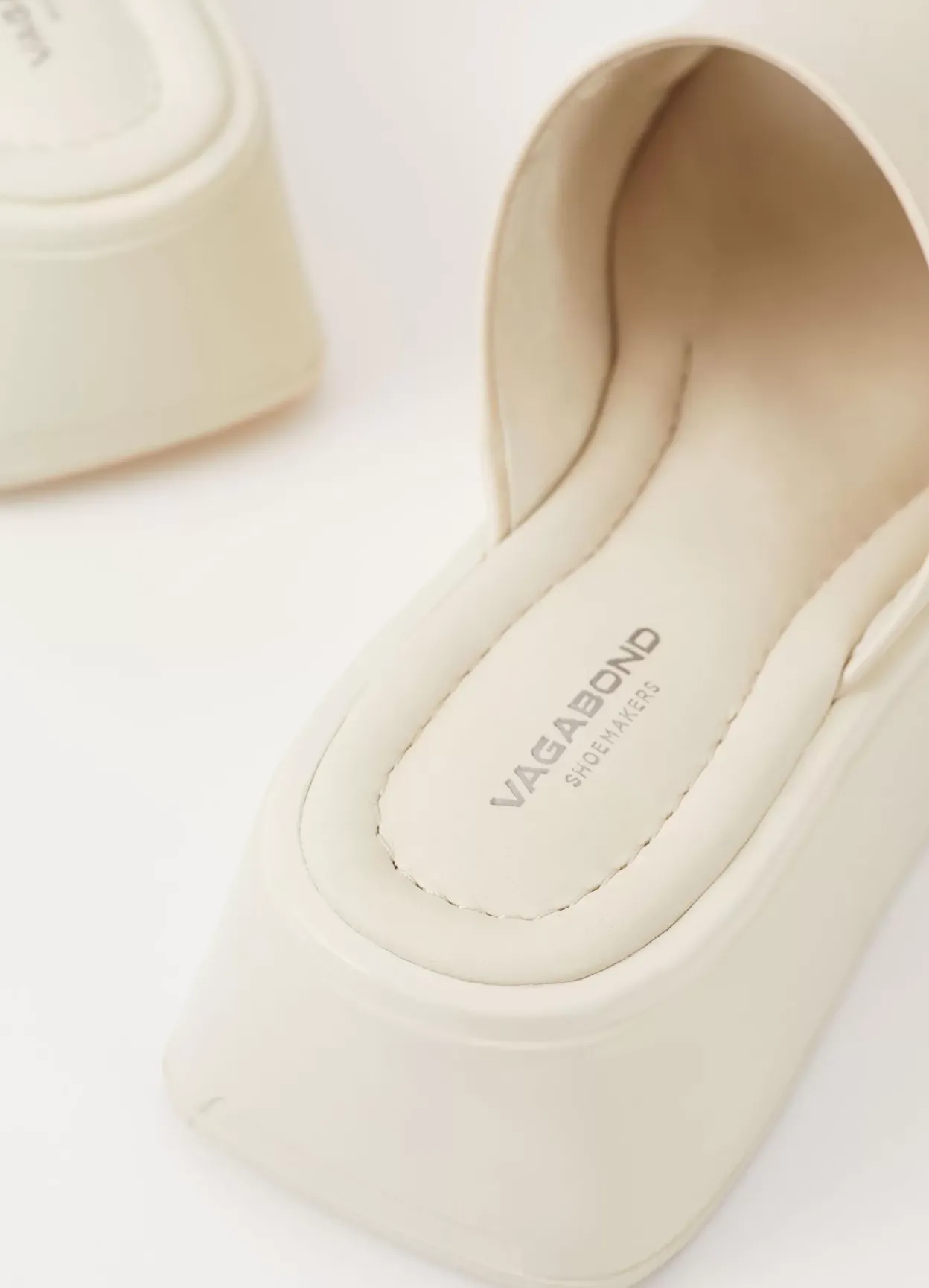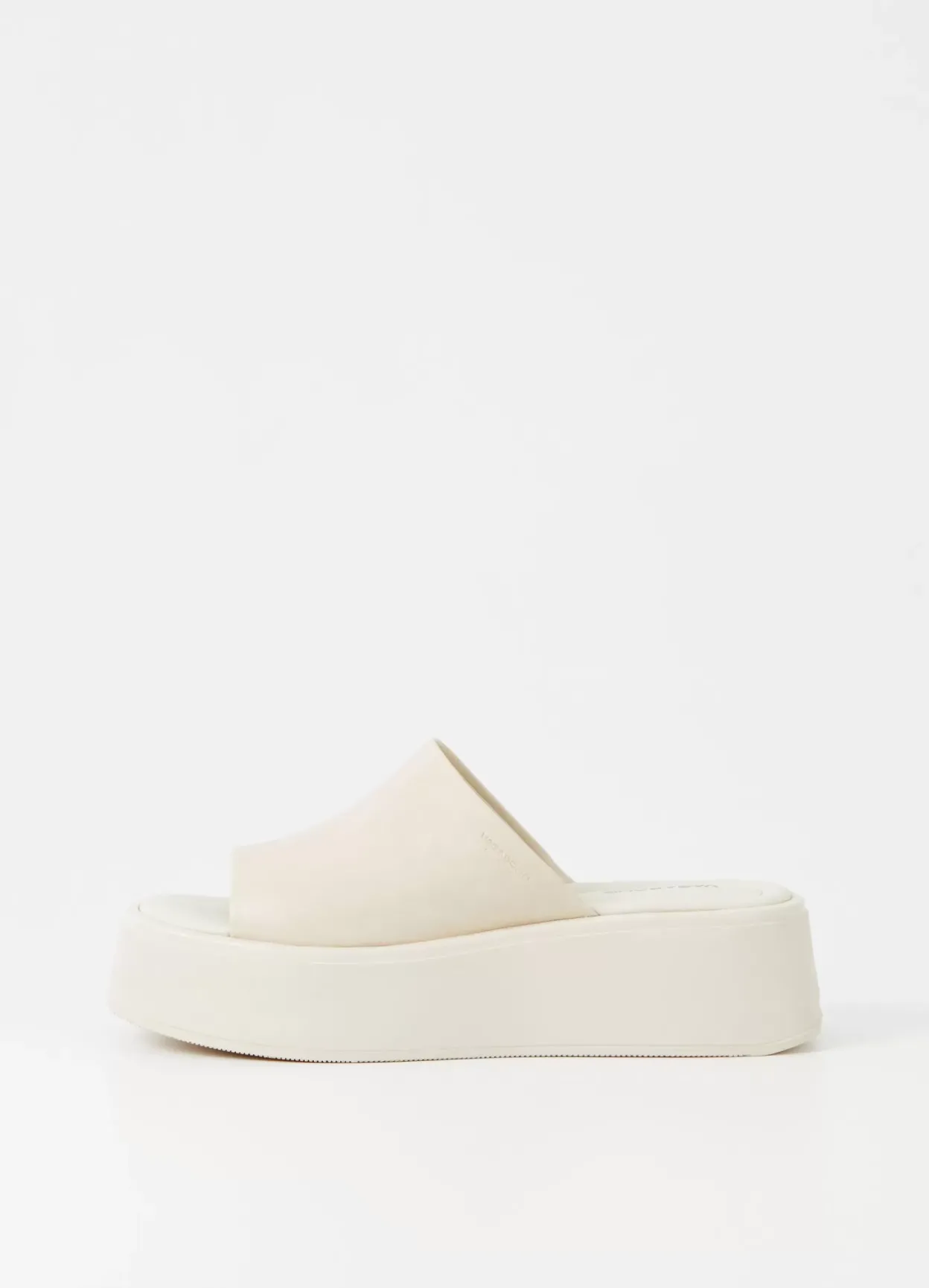 Courtney er en minimalistisk slip-in sandal med et 90’er inspireret design. Modellen er i blødt offwhite læder med en bred rem på oversiden, polstret indersål og firkantet tå. Den solide plateausål er på 50 mm.