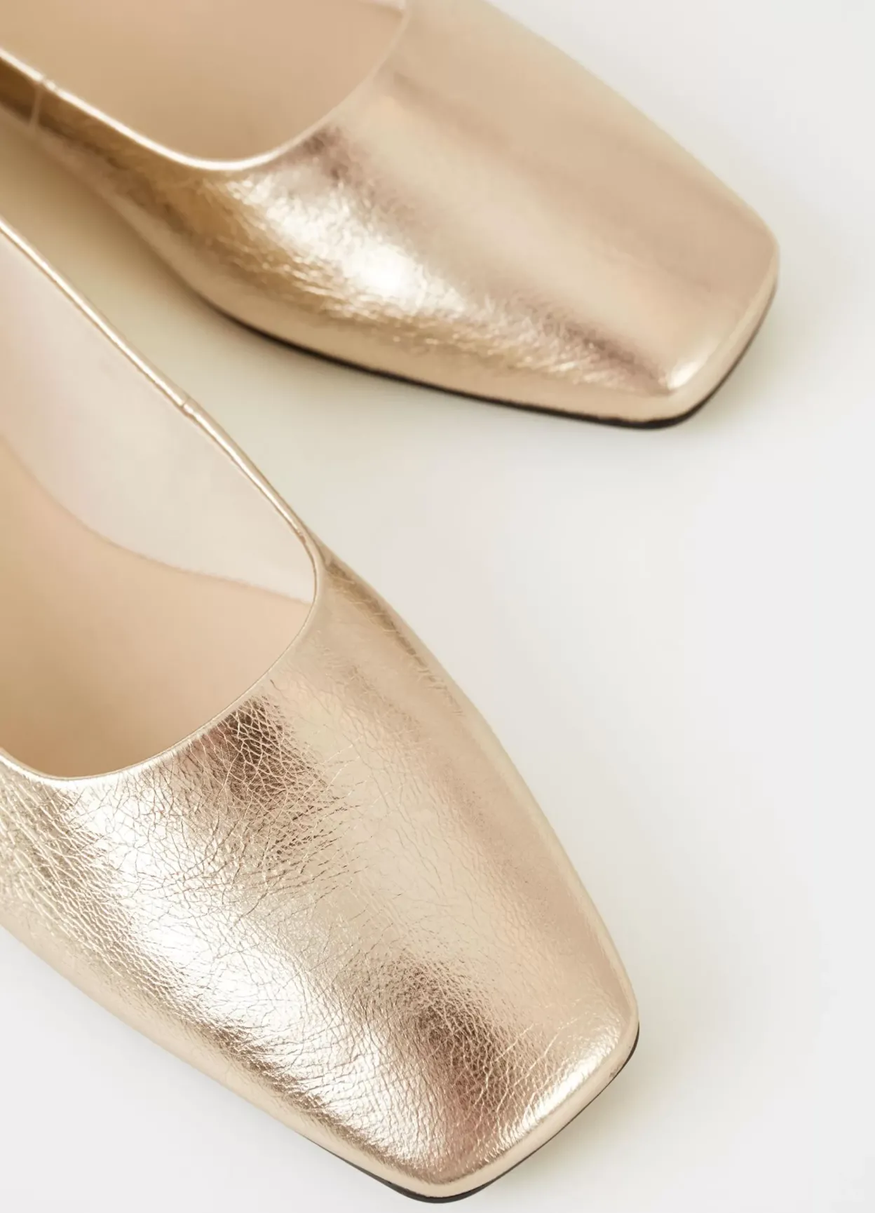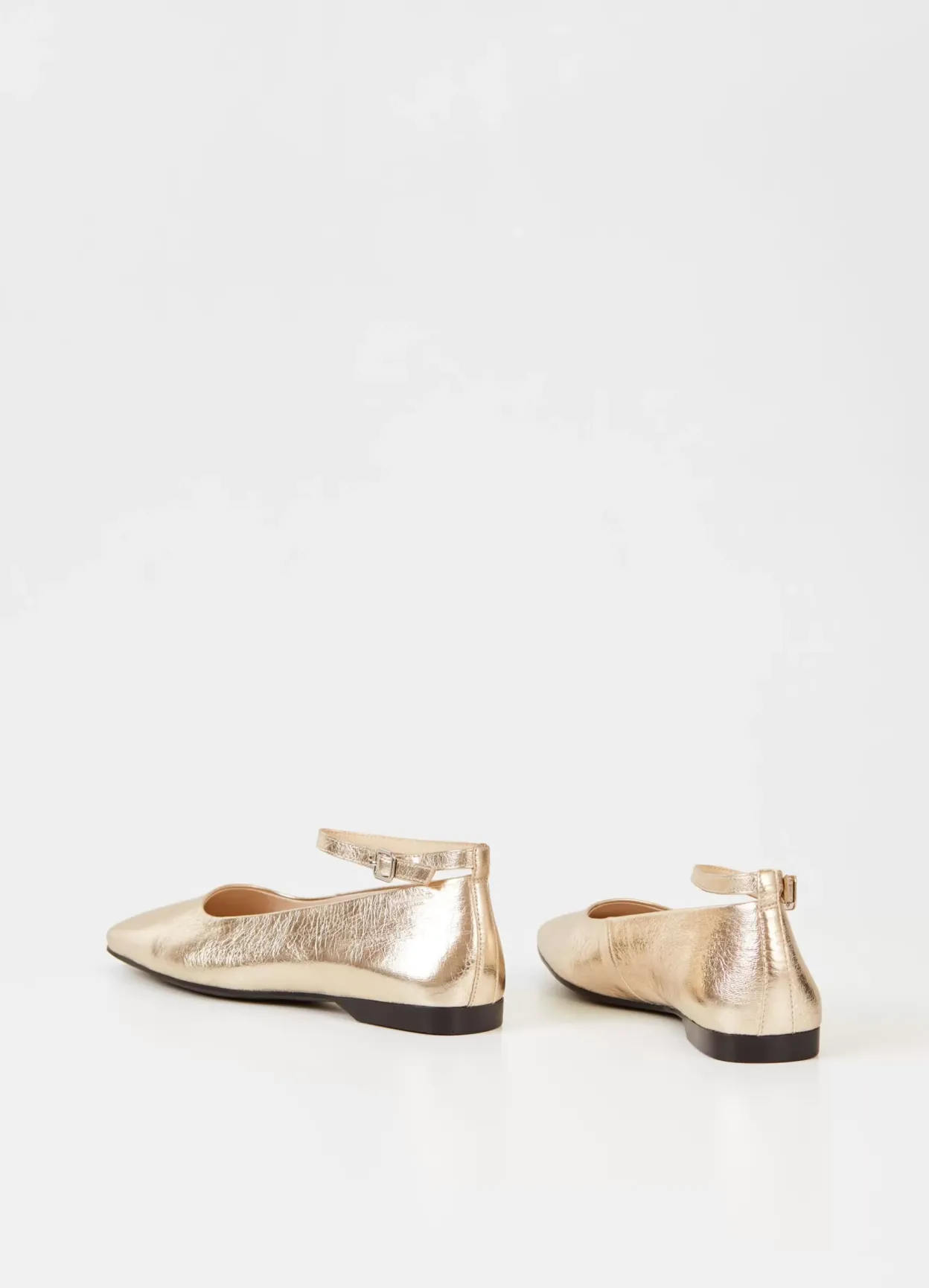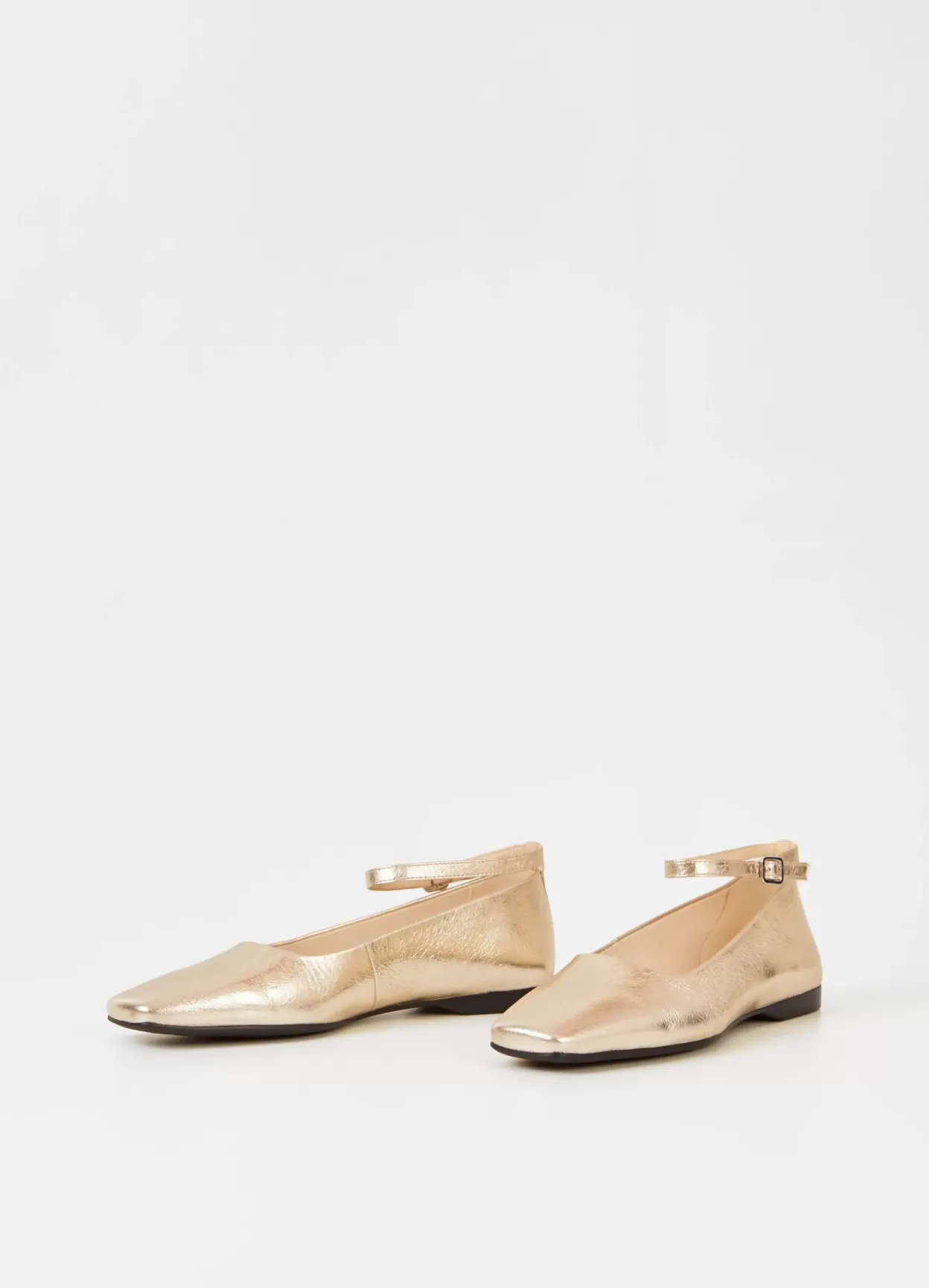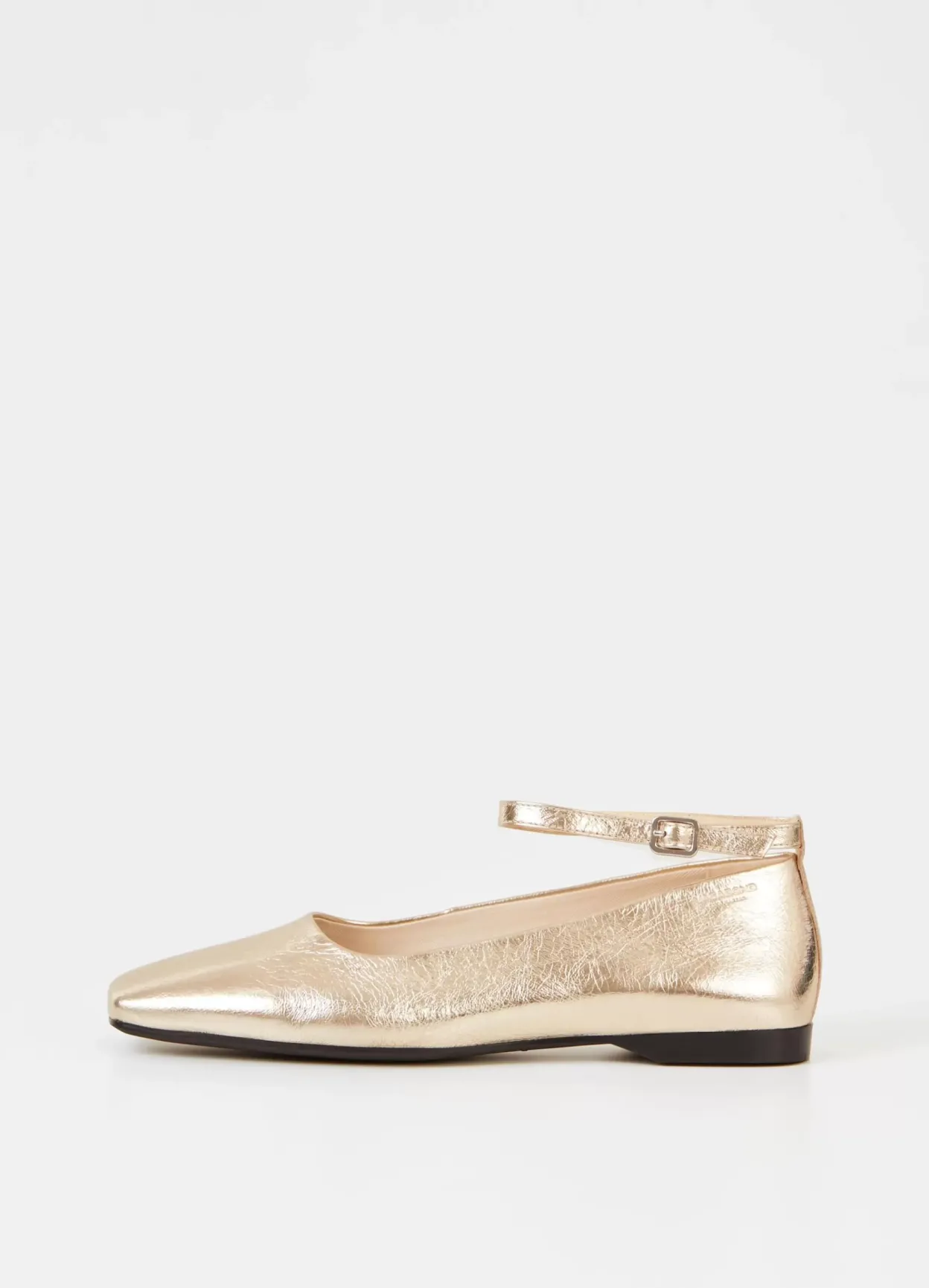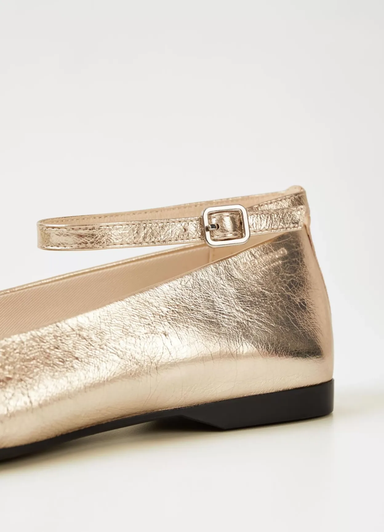 Delia er ballerinasko med et elegant udtryk. Modellen er lavet i guldfarvet læder med firkantet tå og justerbar ankelrem med sølvfarvet spænde. Den lave hæl er 12 mm. Detaljen: indersål i læder.