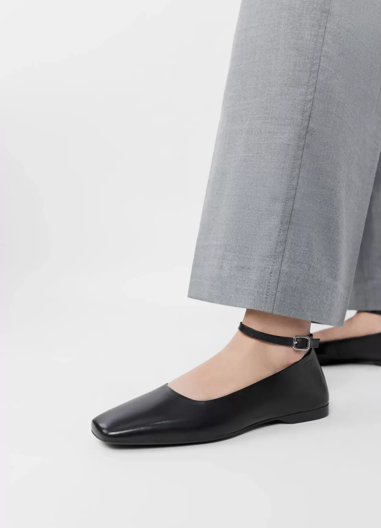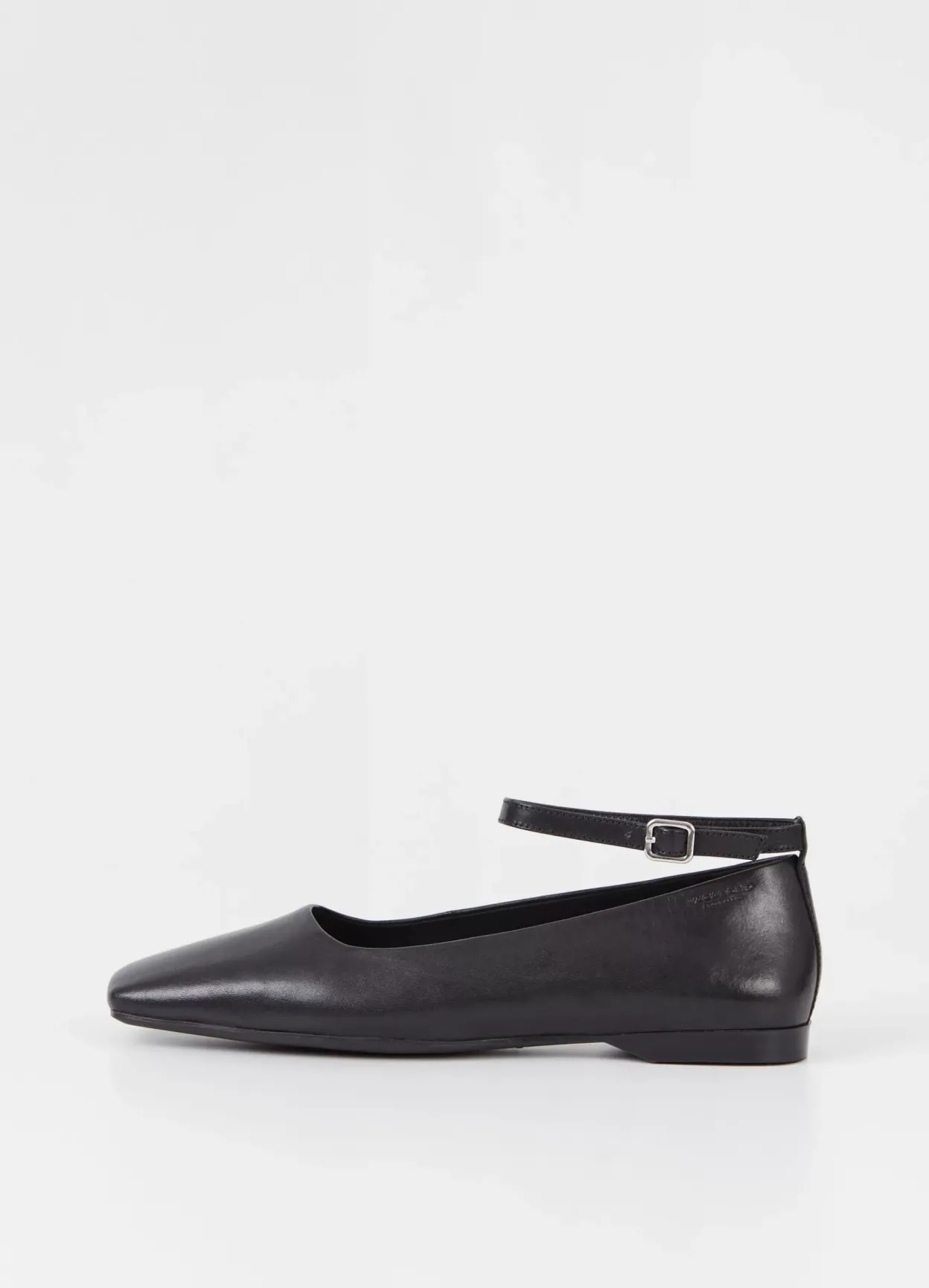 鈥婦elia er ballerinasko med et sofistikeret udtryk. Modellen er lavet i sort læder med firkantet tå og justerbar ankelrem med sølvfarvet spænde. Den lave hæl er 12 mm. Detaljen: indersål i læder.
