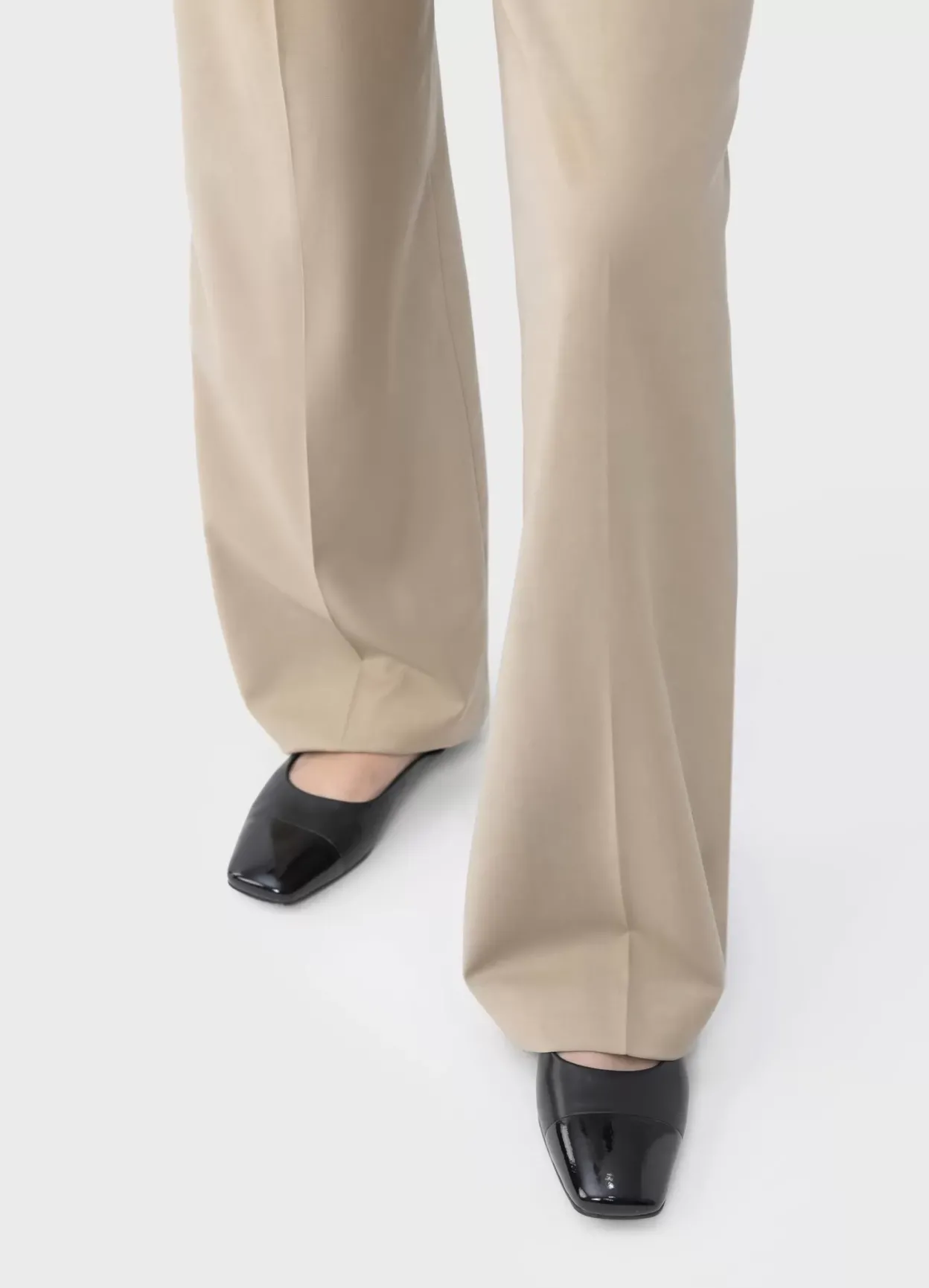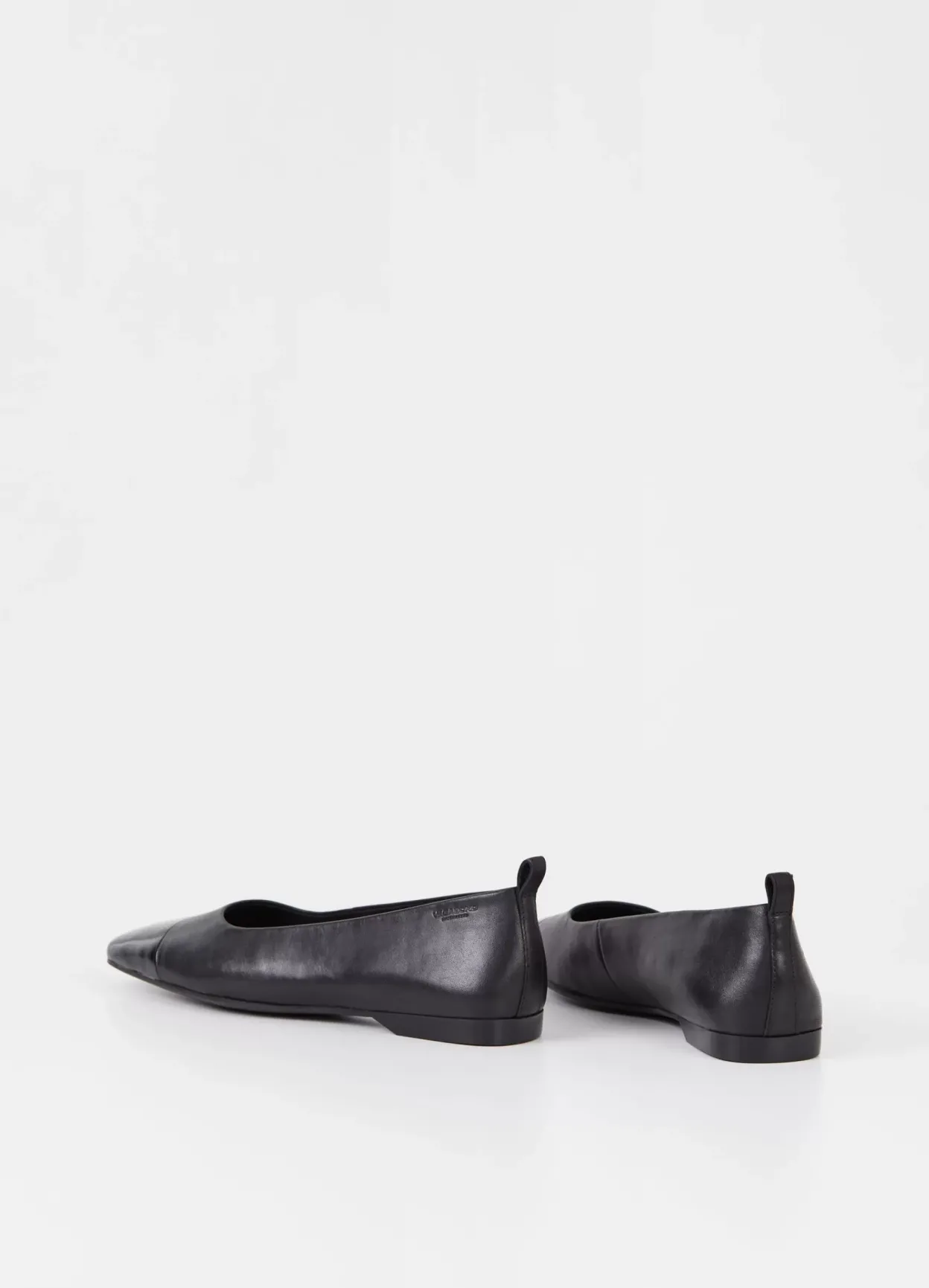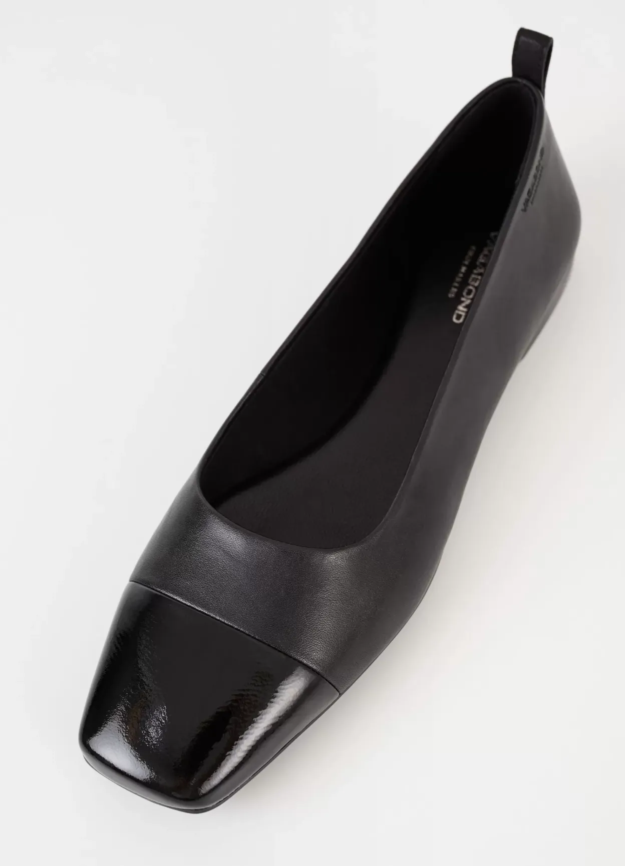 Delia er elegante flats i et tidløst design. Modellen er lavet i sort læder med tå i laklæder og indersål i læder. Den lave hæl er 12 mm. Detaljen: hælstrop.