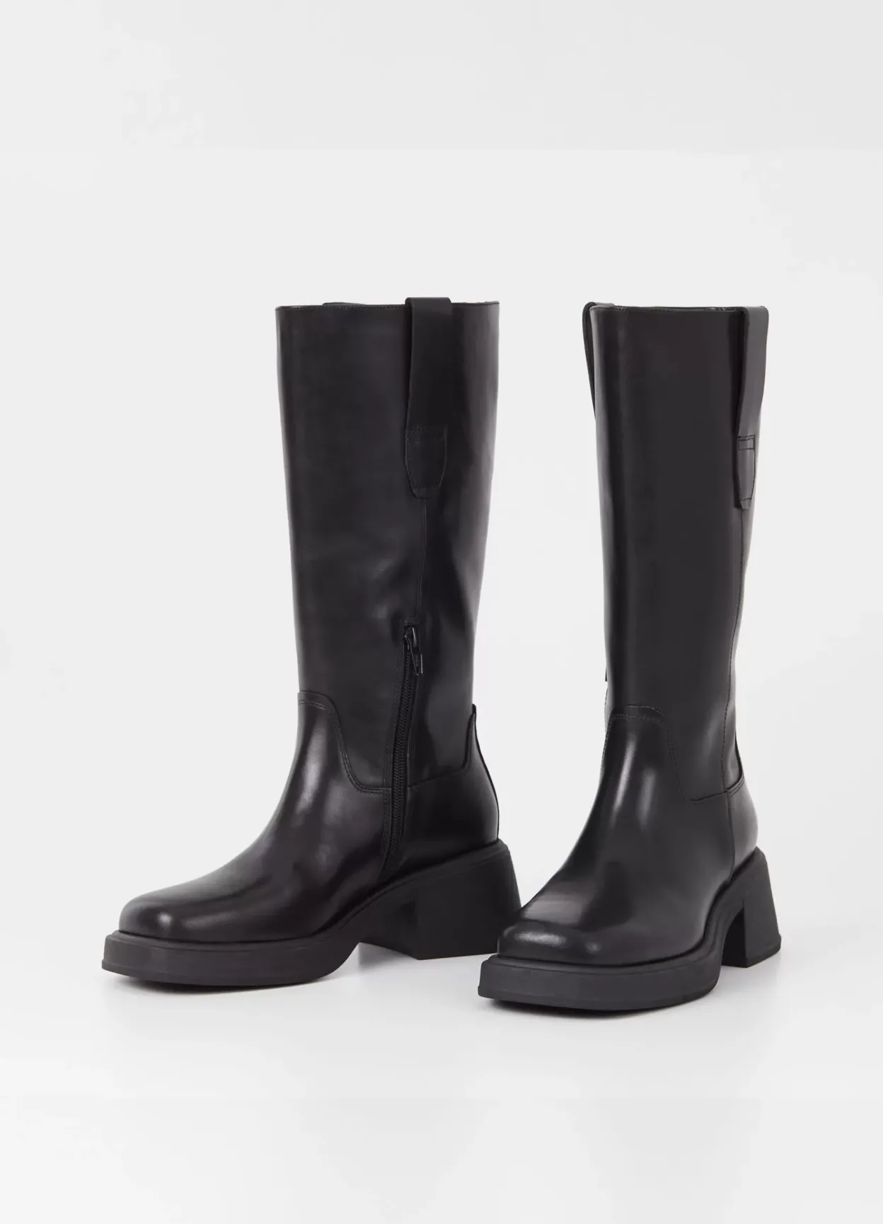 Dorah er høje platformstøvler med et moderne look. De er lavet i sort læder, kantet tåform, lynlås på siden og hælstrop. Hælen er på 59 mm.