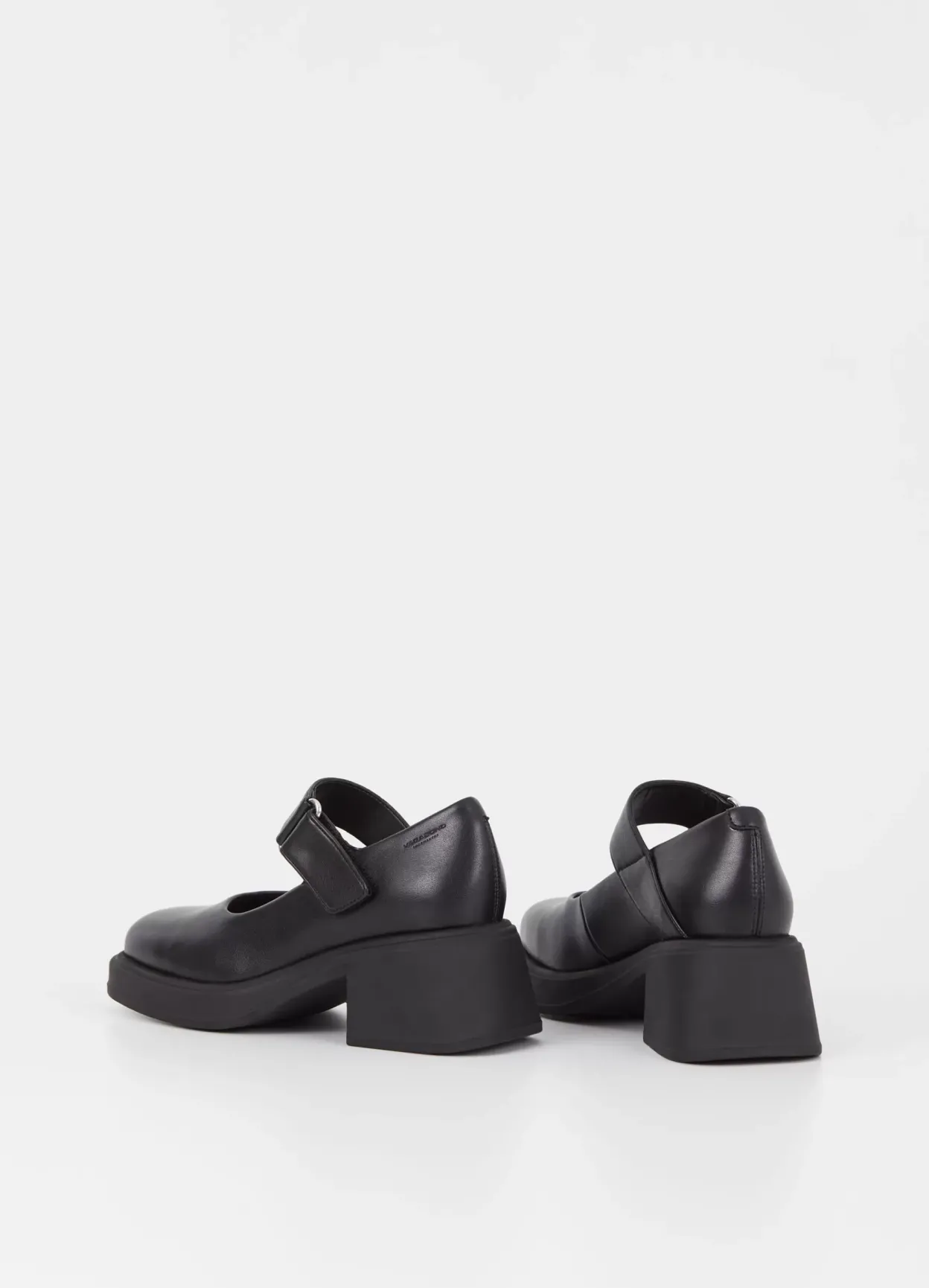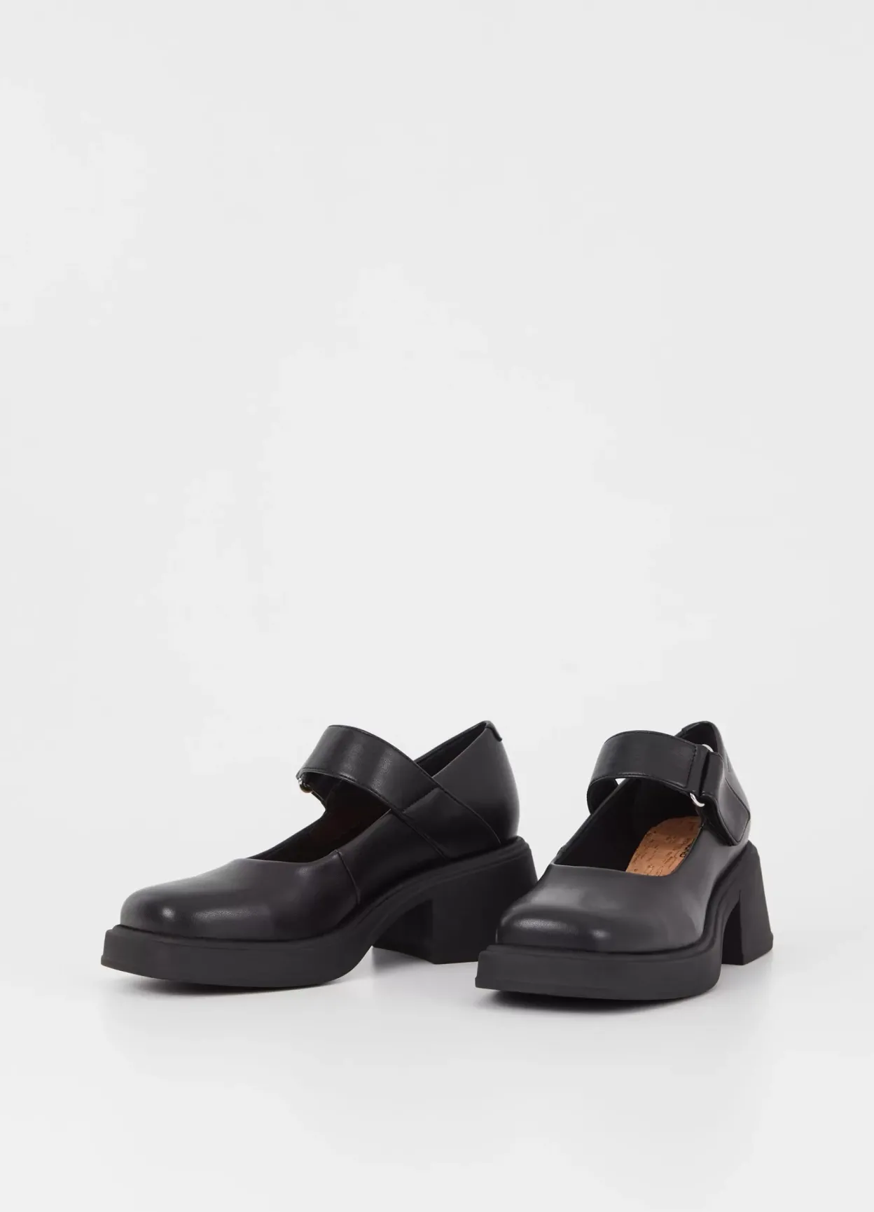 Dorah er Mary Jane-sko med plateau foran. Modellen er en del af vores non-animal kollektion, og er lavet af sort syntetisk PU-materiale uden animalsk oprindelse. Detaljen: firkantet tåform og justerbar ankelrem. Blokhælen er 59 mm.