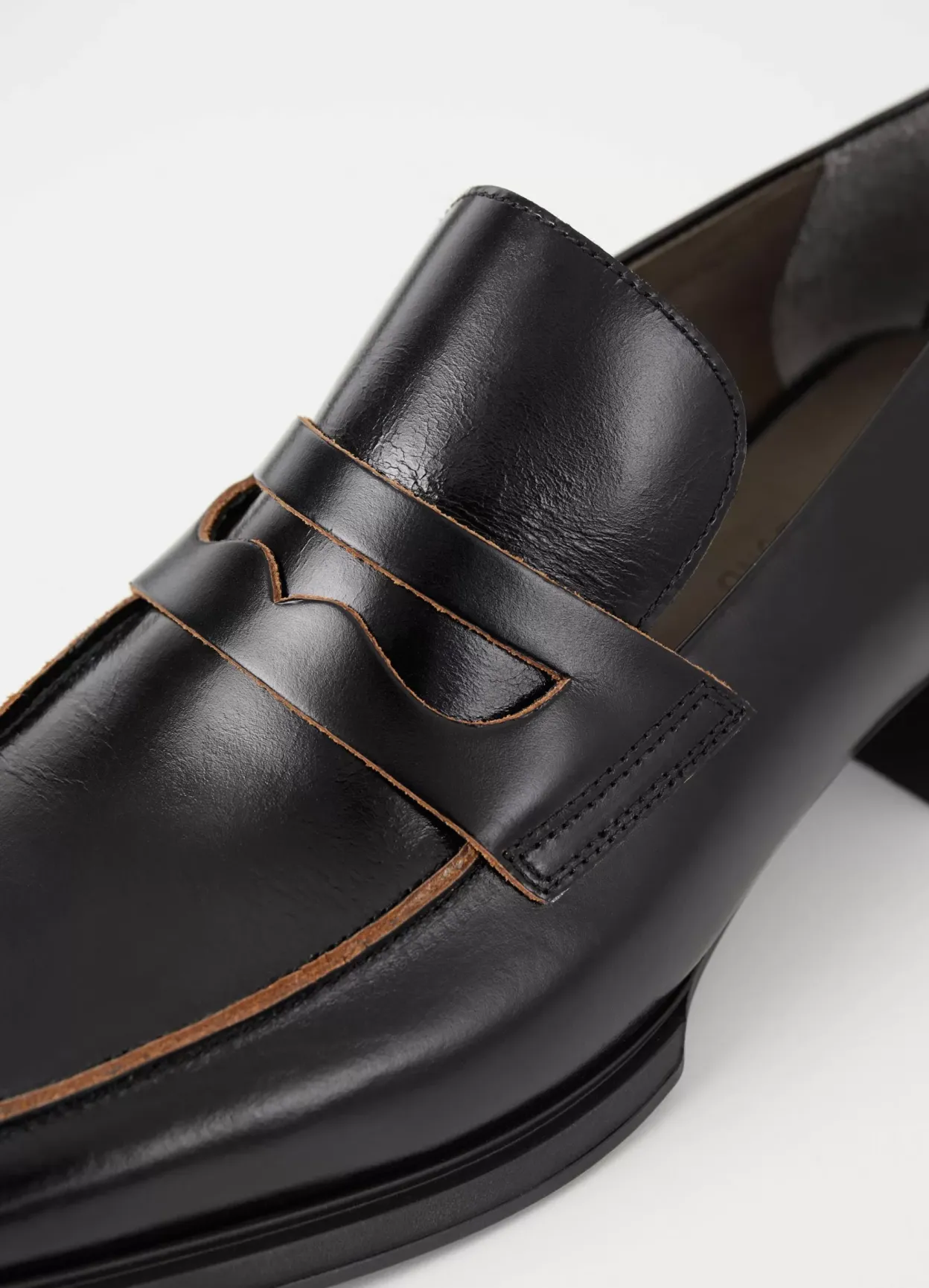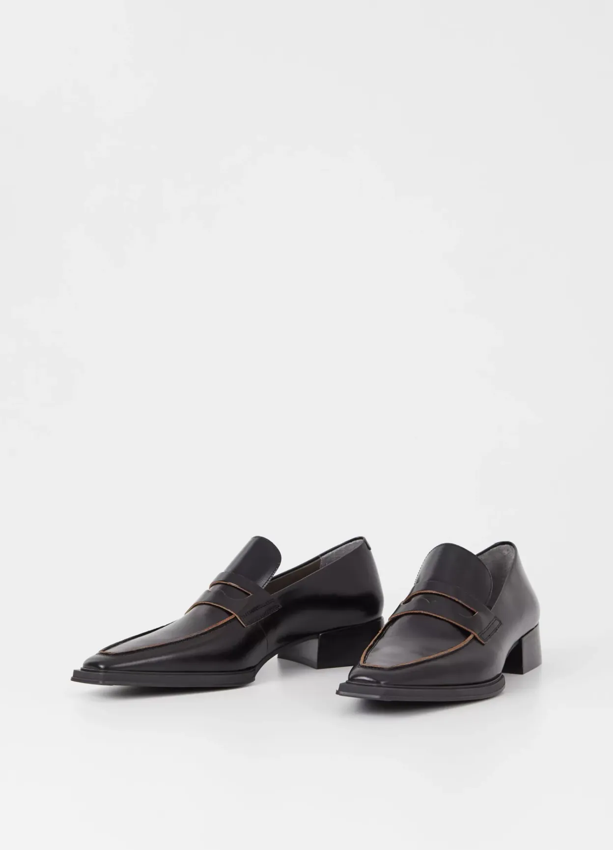 Eida er klædelige loafers med et elegant udseende. Modellen er lavet i sort læder med blank finish, klassisk penny-rem over foden samt spids tå med et kantet design. Hælen er 32 mm.
