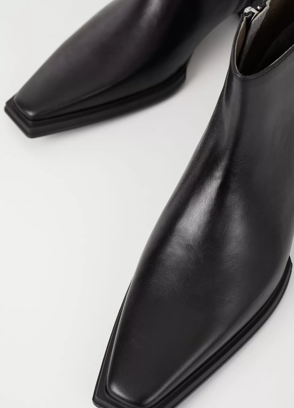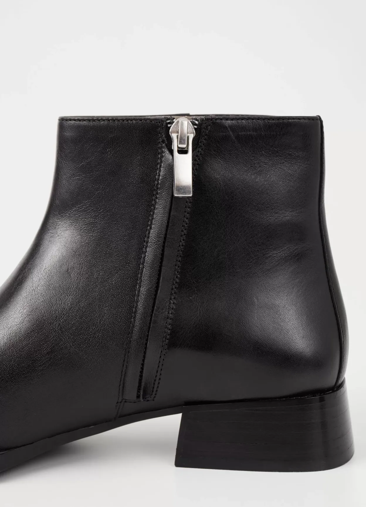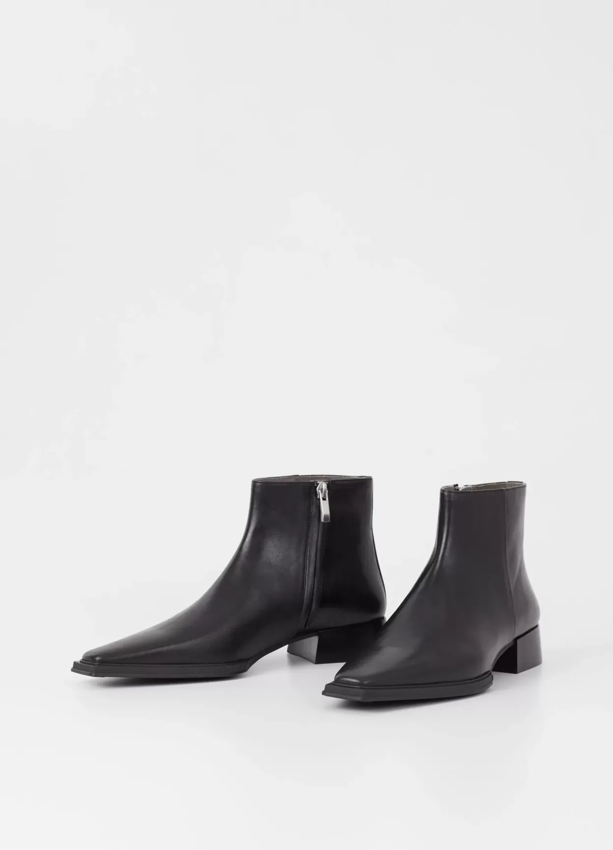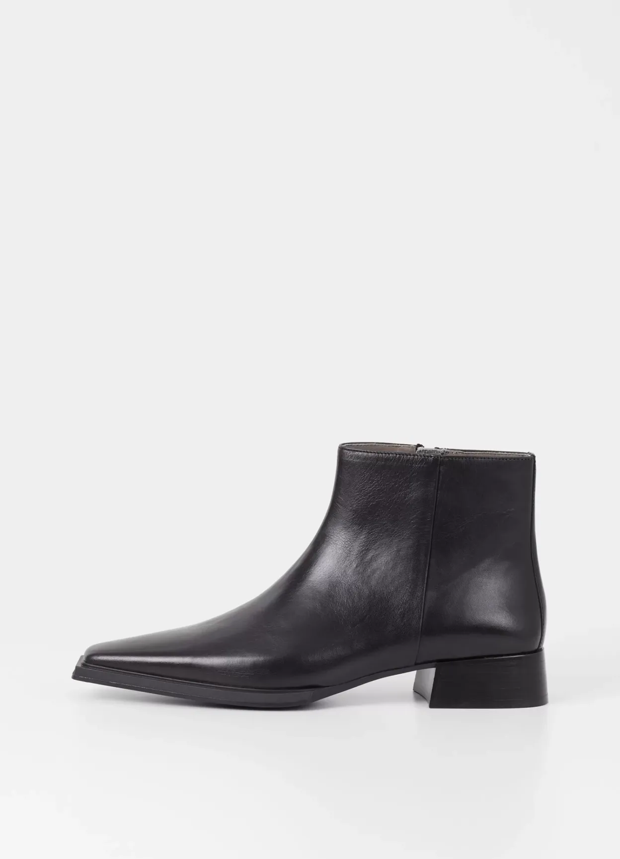 Eida er minimalistiske ankelstøvletter i et elegant design. Modellen er lavet i sort læder med ankelhøjt skafte, lynlås langs med indersiden samt spids tå med et kantet design. Den lave hæl er på 32 mm.
