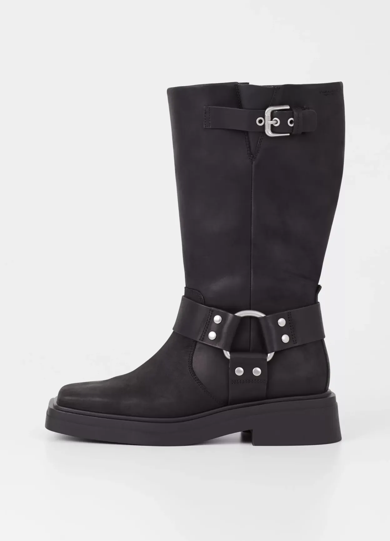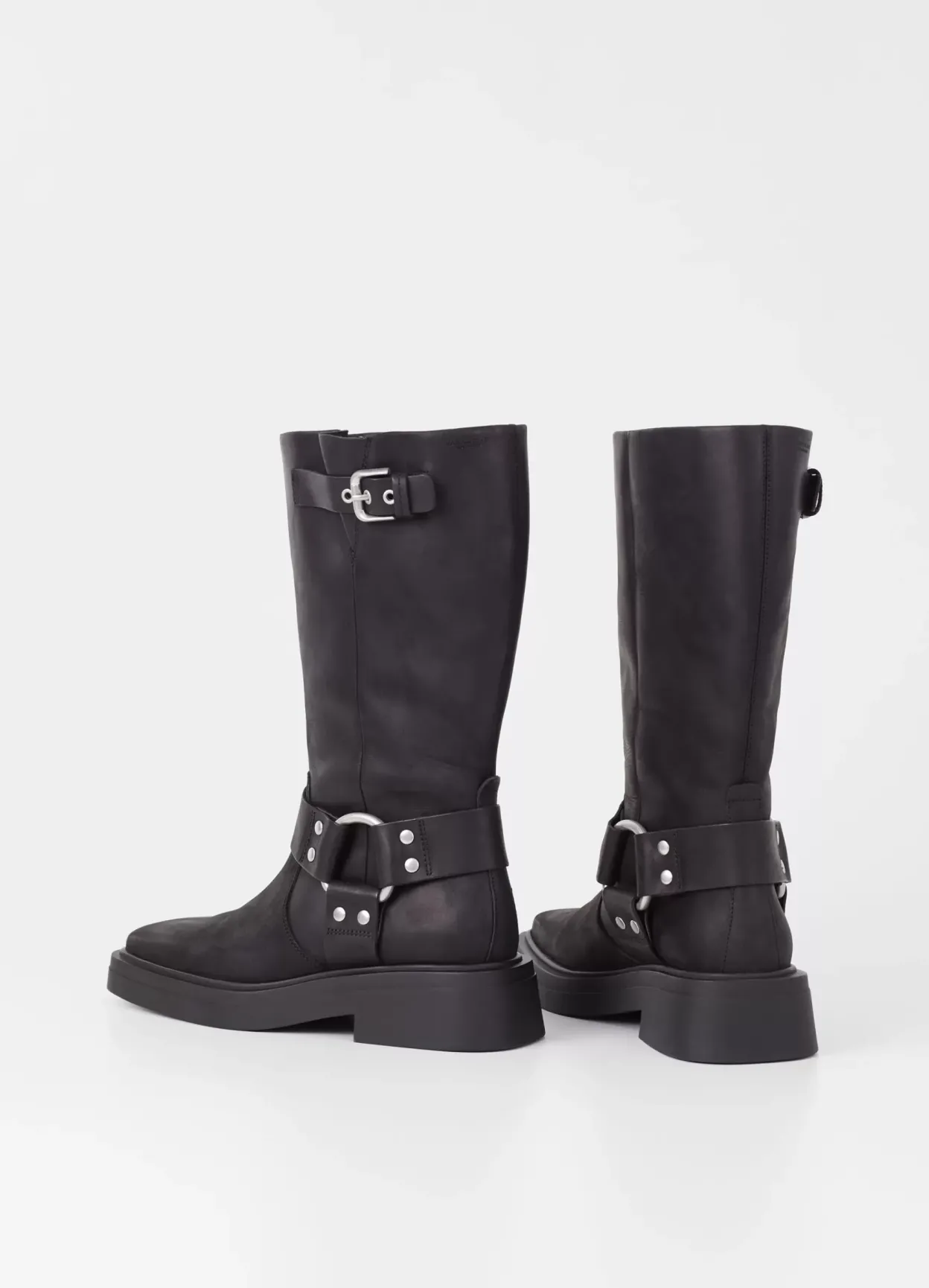 Eyra er moderne bikerstøvler med harness-detaljer. Modellen er lavet i blødt, olieret nubuck i sort med en bred, firkantet tå, sølvfarvede harness-detaljer samt et mellemhøjt skafte. De solide gummisåler er 45 mm.