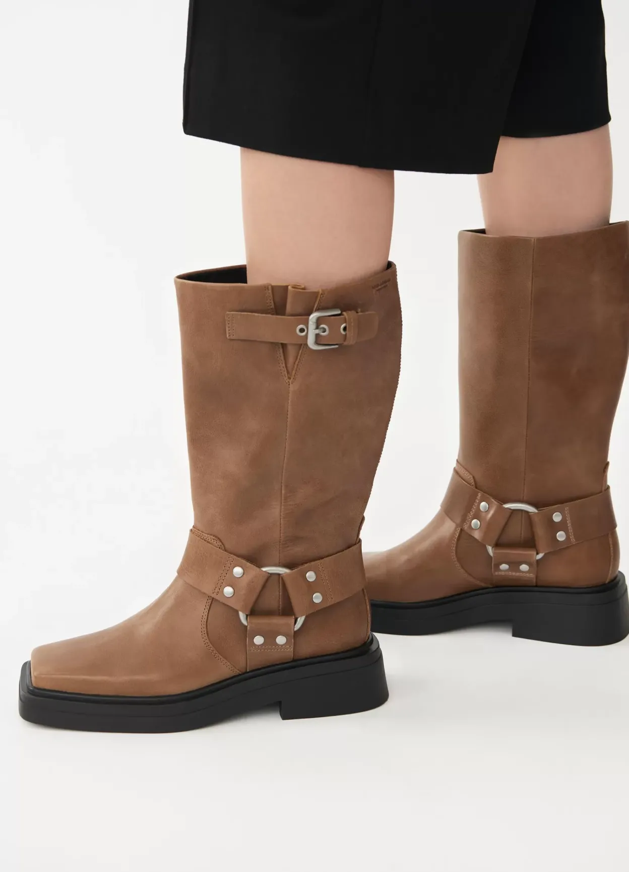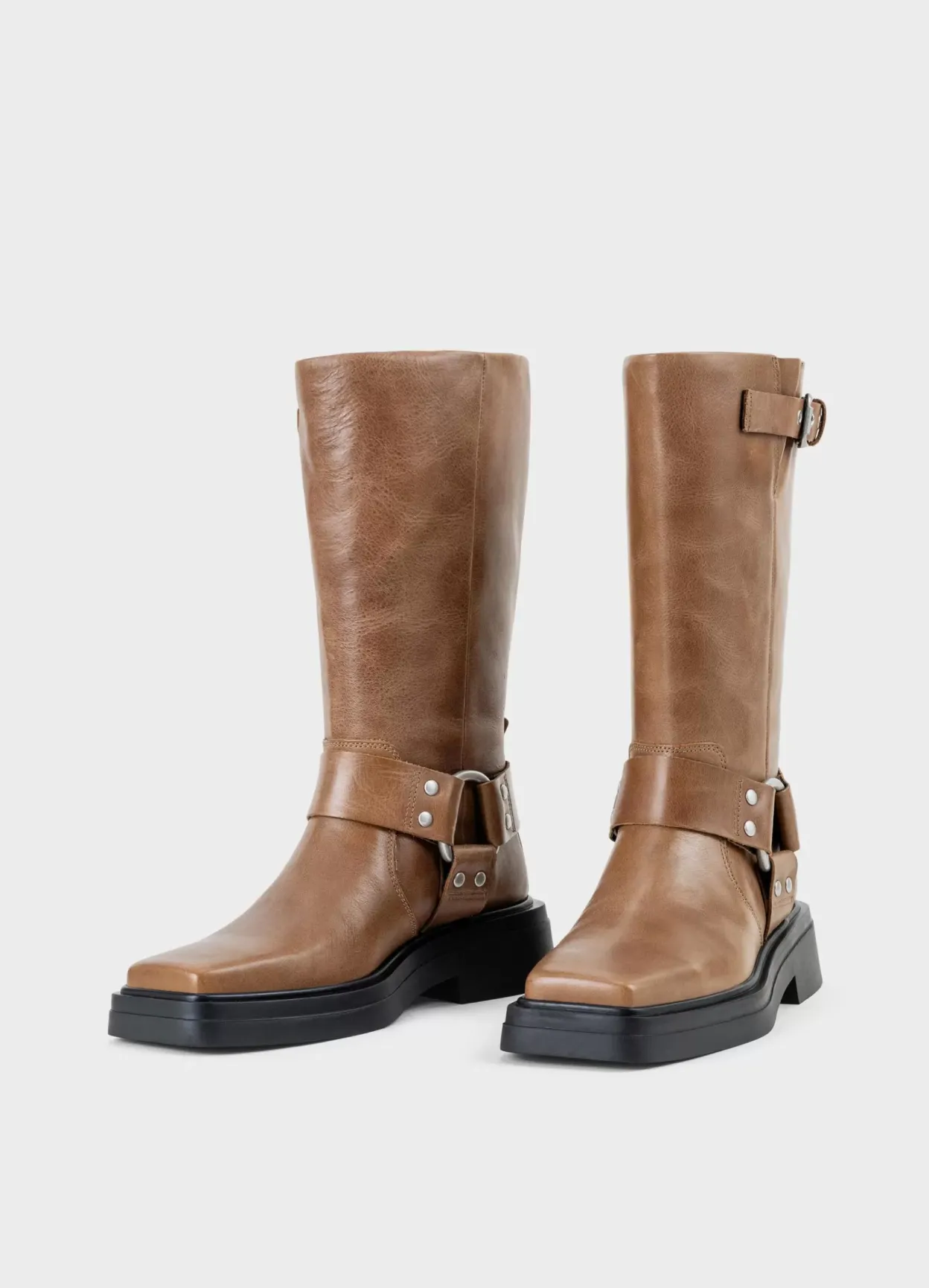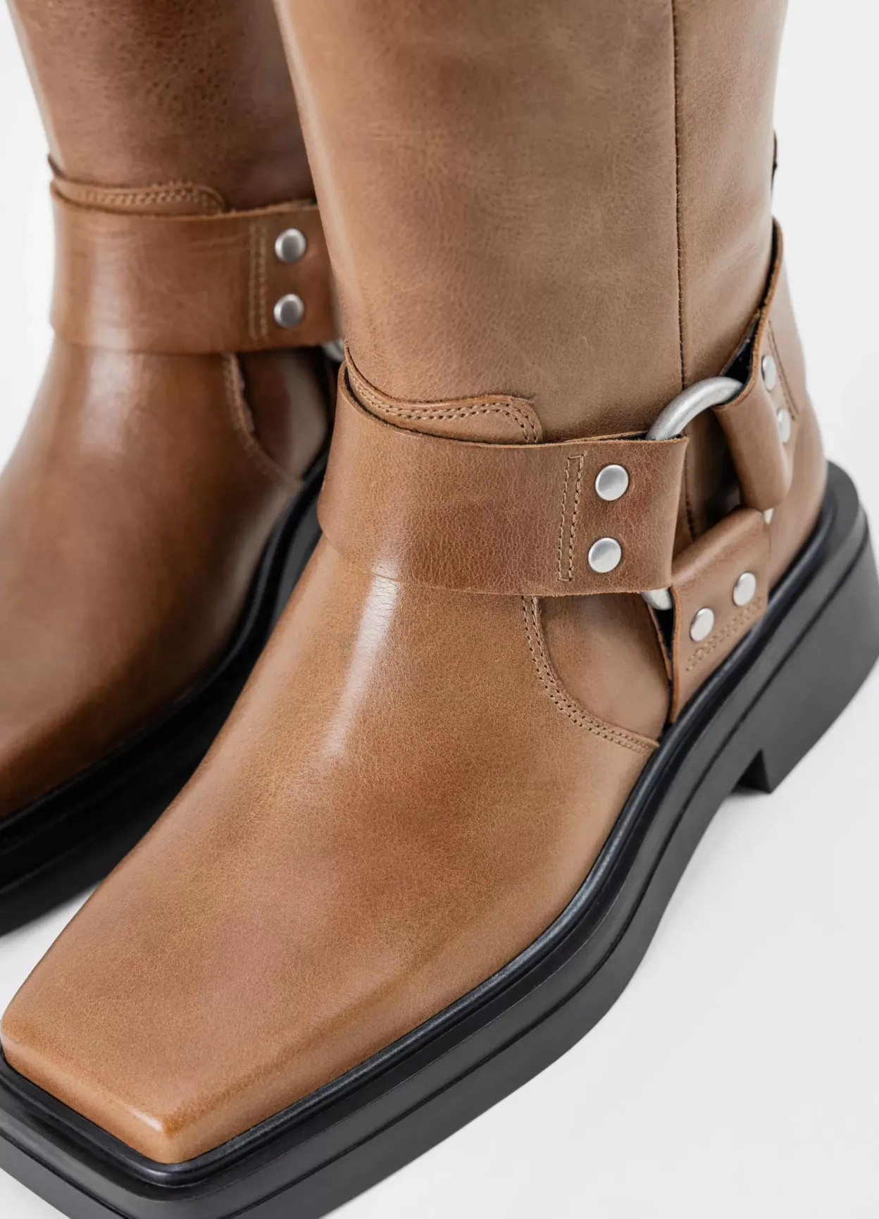 Eyra er mellemhøje boots med harness-detaljer. Modellen er lavet i lysebrunt læder med dekorative harness-detaljer samt justerbar rem med spænde på skaftet. Hælen måles til 42 mm. Detaljen: firkantet tå og en solid sål.