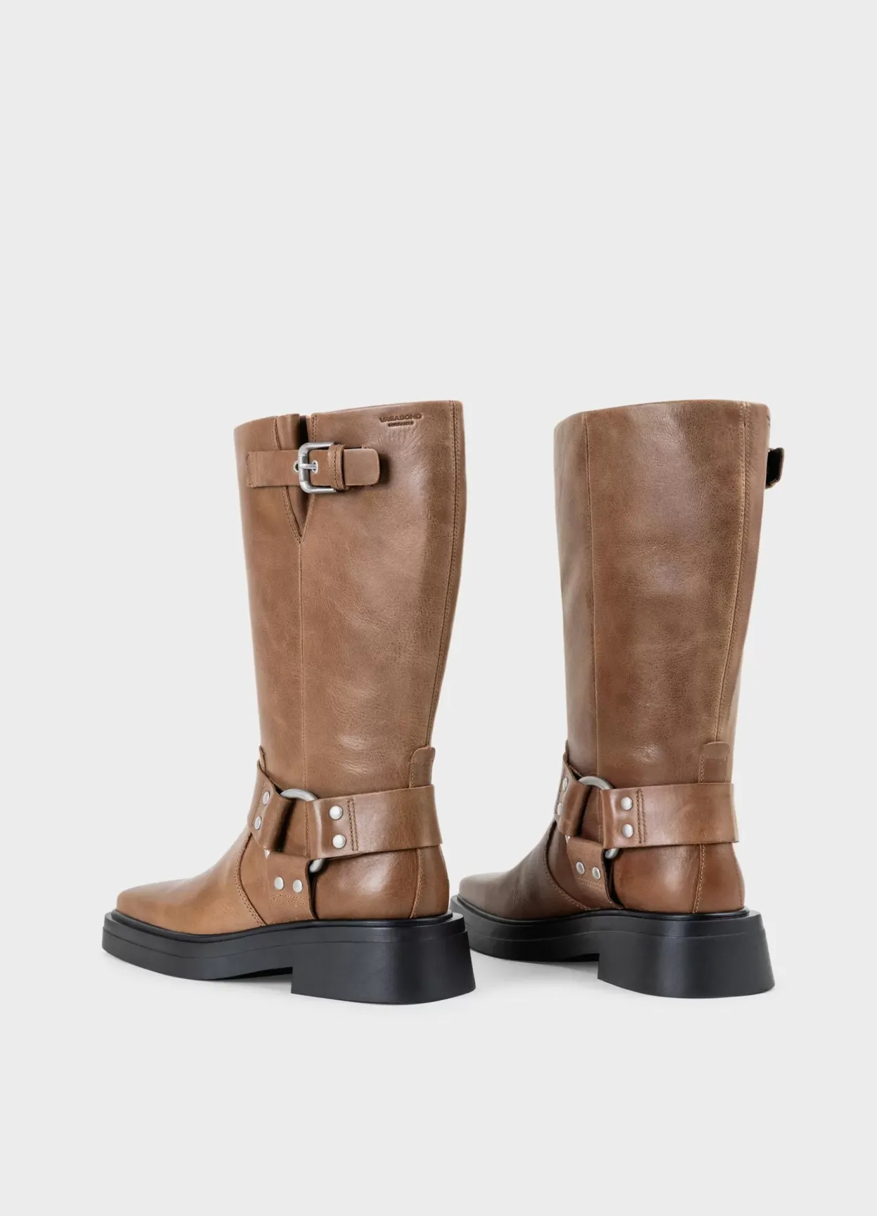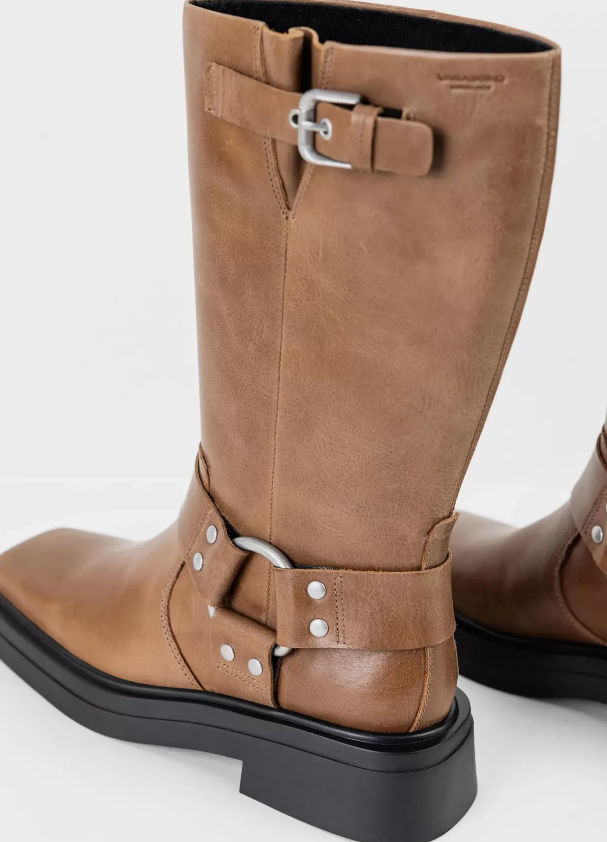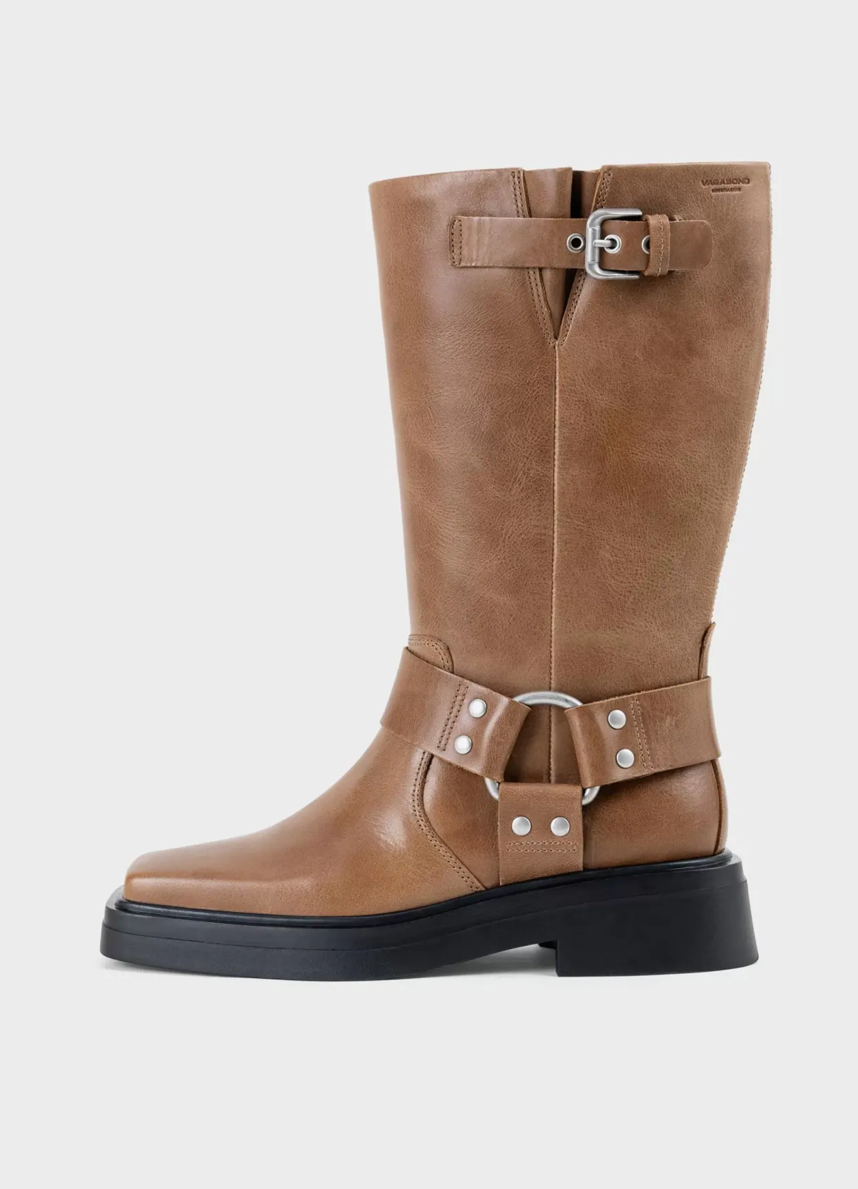 Eyra er mellemhøje boots med harness-detaljer. Modellen er lavet i lysebrunt læder med dekorative harness-detaljer samt justerbar rem med spænde på skaftet. Hælen måles til 42 mm. Detaljen: firkantet tå og en solid sål.