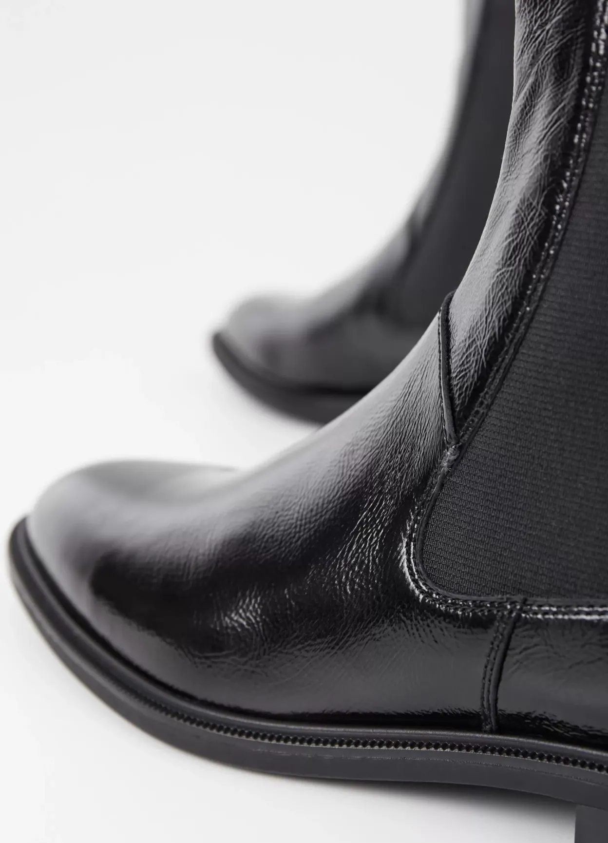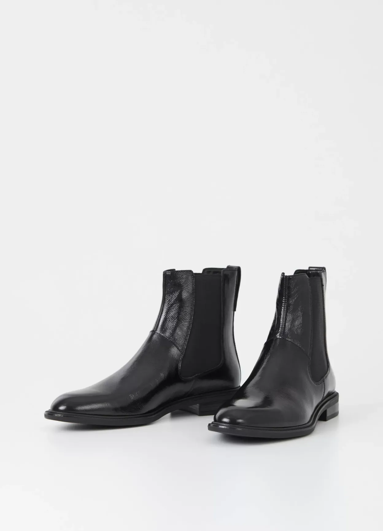 Frances er en tidløs Chelsea støvle med et moderne og rent design. Modellen er i sort lakeret skind med en spids tåform, træk flapper og elastikpaneler langs skaftet. Den fine ydersål er med en lav hæl på 29 mm.