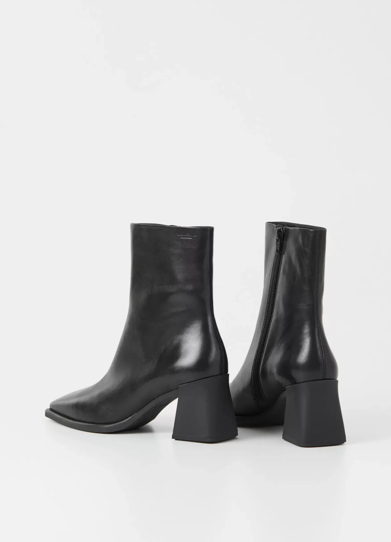 Hedda er tidløse ankelstøvler med et rent, retro-inspireret design. Modellen er i sort læder med en firkantet tå, lynlås og dekorative sømme fremme. Den fine ydersål har en blokhæl med svaj på 70 mm.