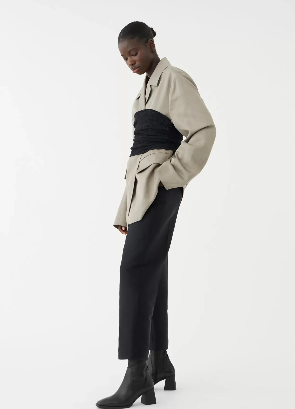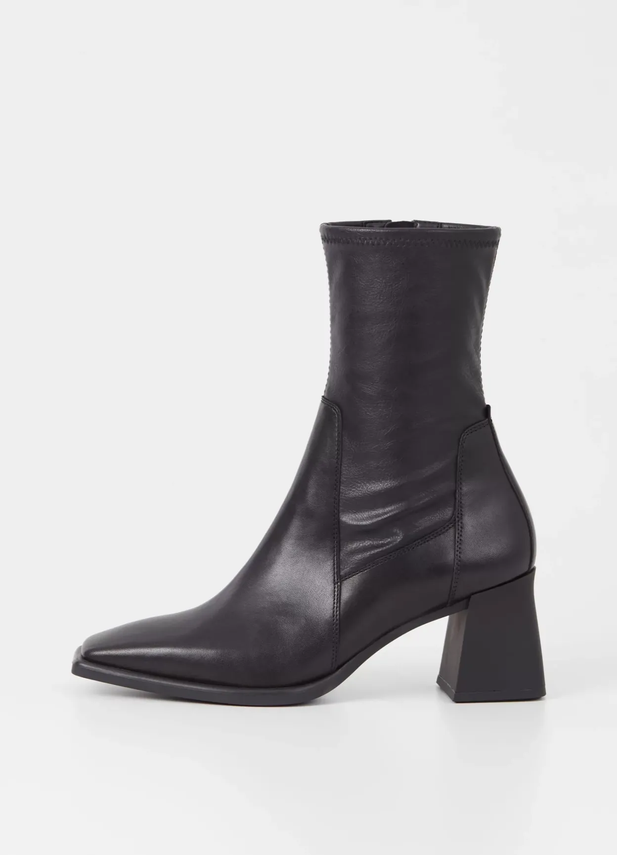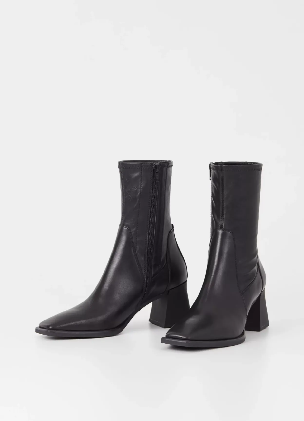 Hedda er højhælede støvletter i et elegant design. Modellen er lavet i sort læder/syntetisk læder med et stretchy, mellemhøjt skafte, firkantet tå og lynlås langs med indersiden af skaftet. Hælen måler 70 mm.