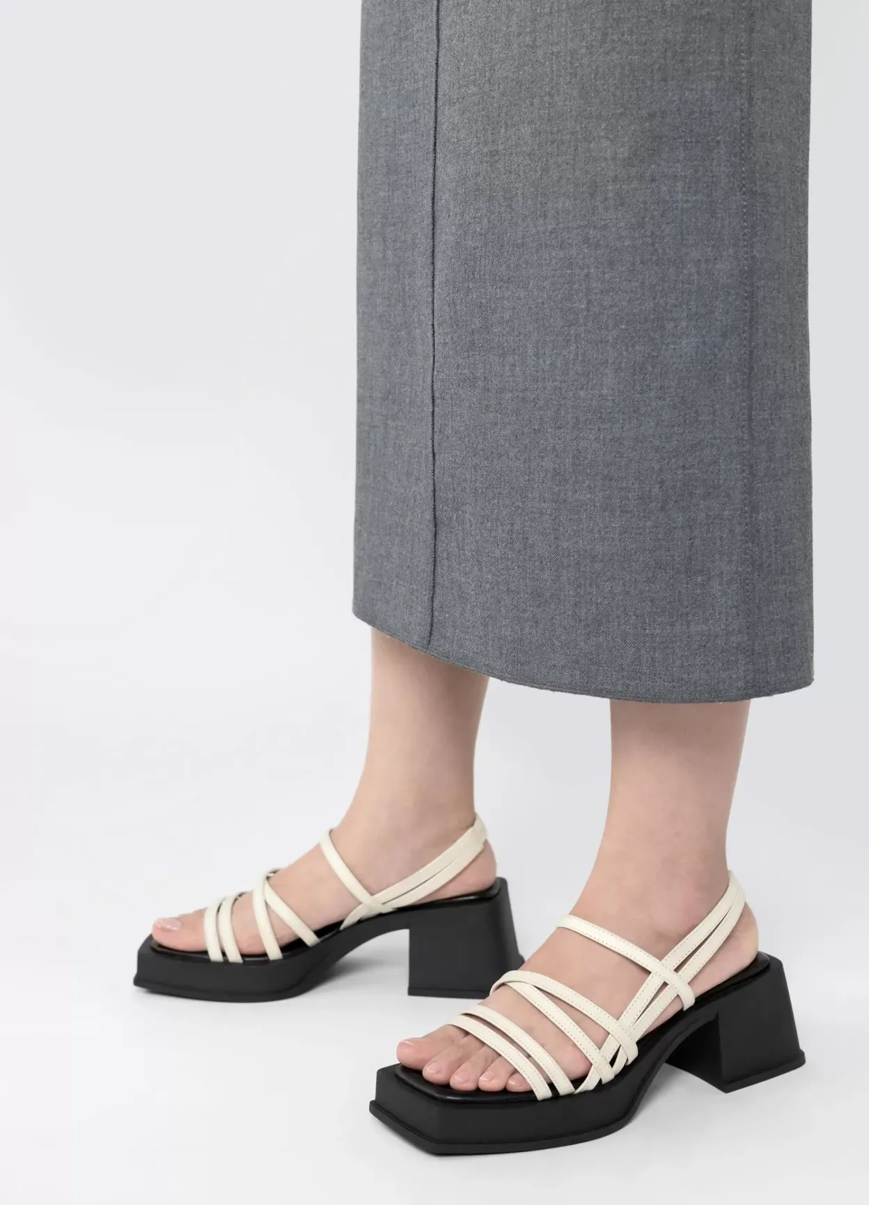 Hennie er remsandaler med halvfemser-vibes fra vores bagkatalog. Modellen er lavet i off-white læder med smalle remme over foden og bred, firkantet tåform. Sålen har plateau foran samt blokhæl på 67 mm.