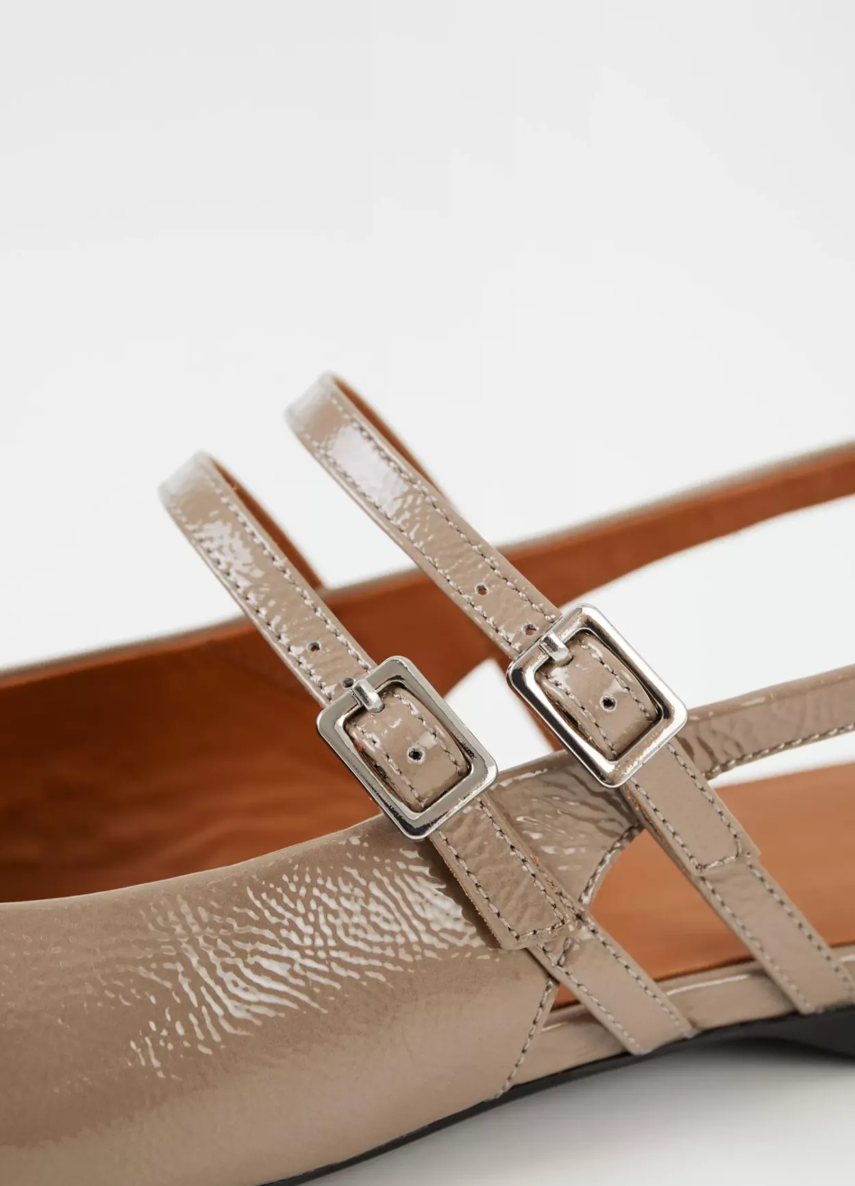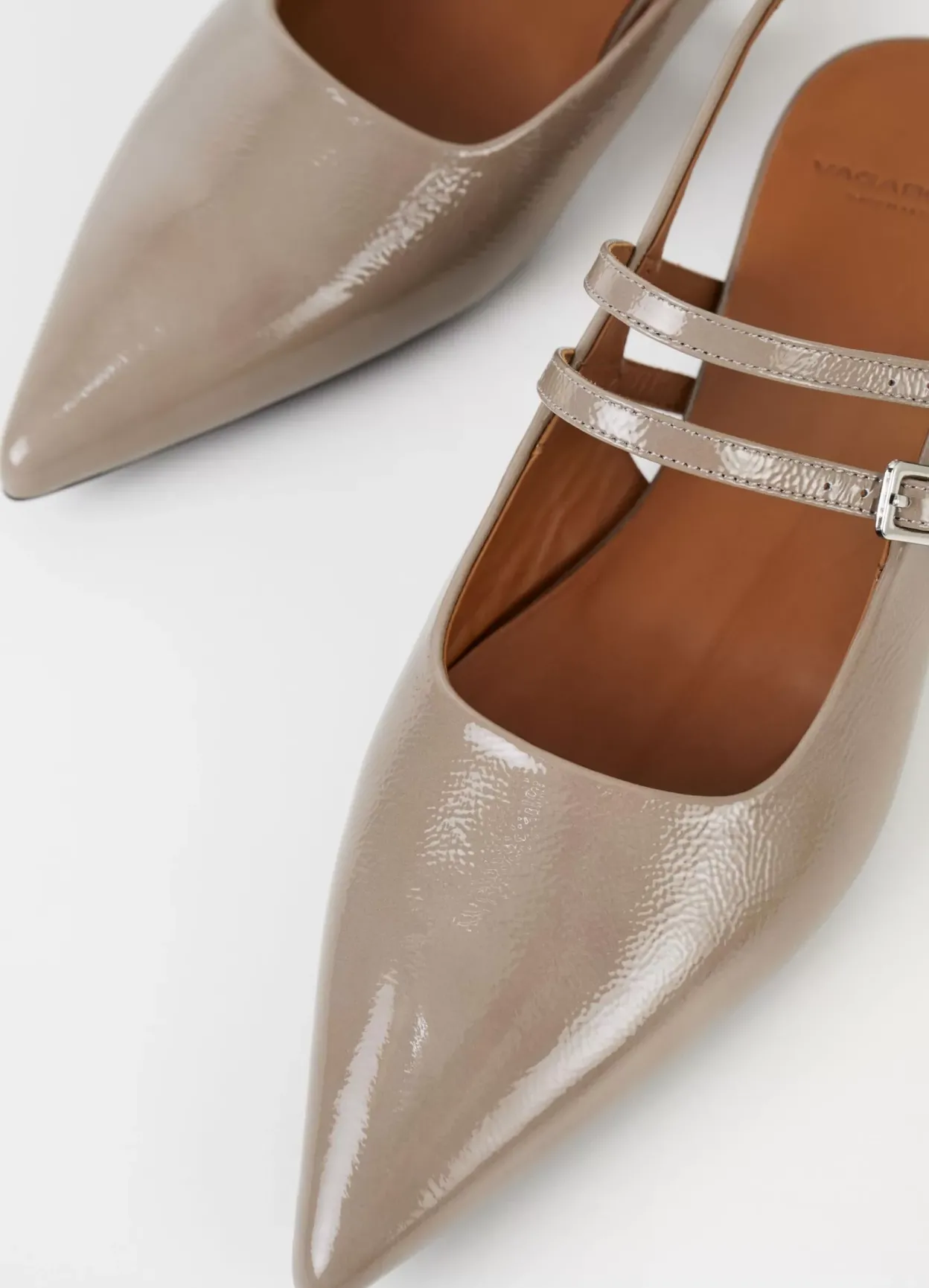 Hermine er slingback-sko med en blank overflade og spids silhuet. Modellen er lavet i beige laklæder med elastisk hælstrop og dobbelte, justerbare stropper med sølvfarvet spænde over foden. Detaljen: læderfor og indersål i læder. Hælen er på 10 mm.