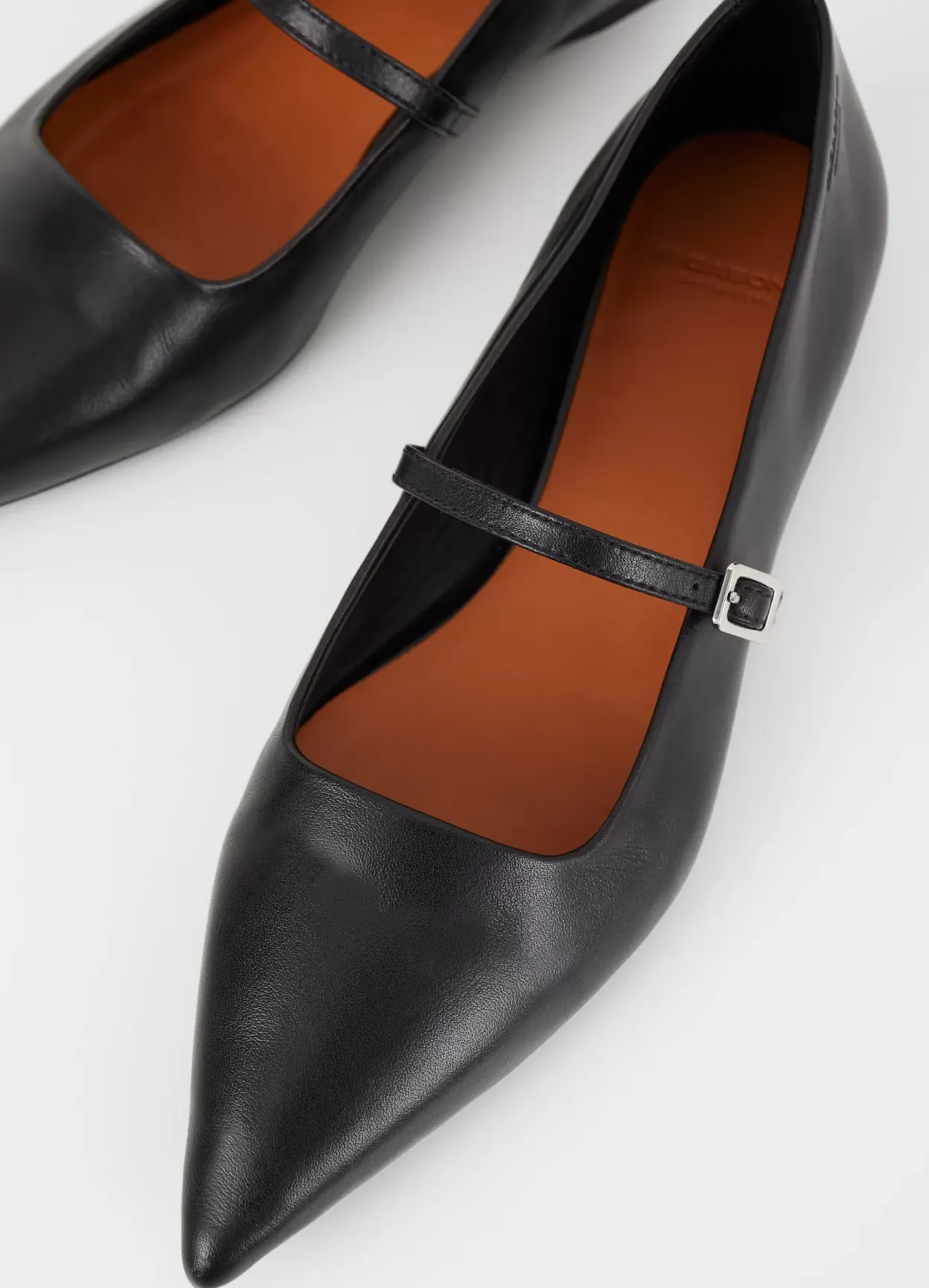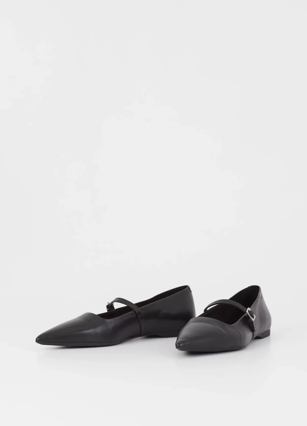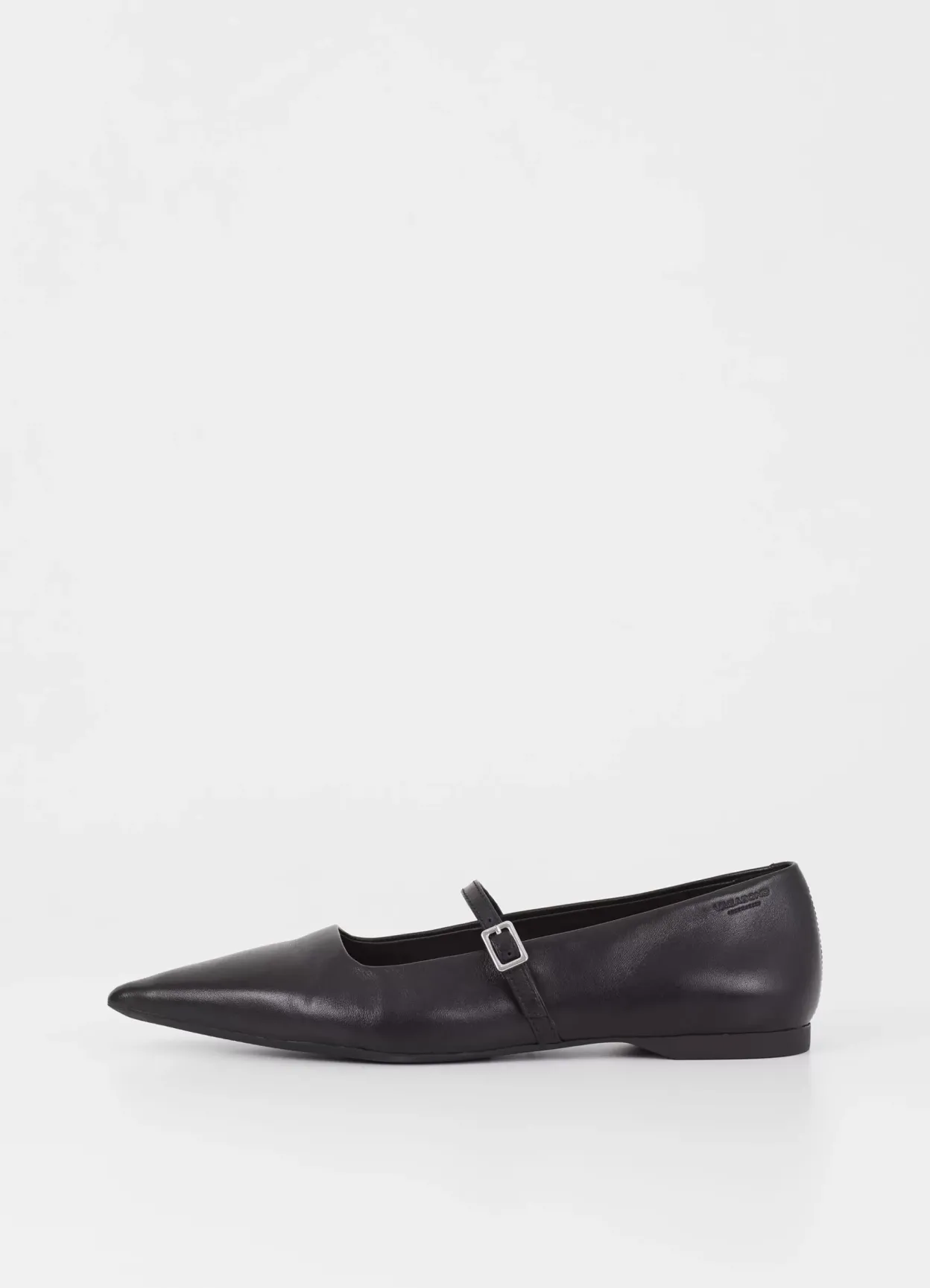 Hermine er edgy Mary Jane-inspirerede flade sko med en opdateret silhuet. Modellen er i sort læder med en spids tåform og en tynd rem med sølvfarvet spænde over foden. Den lave hæl er på 10mm.