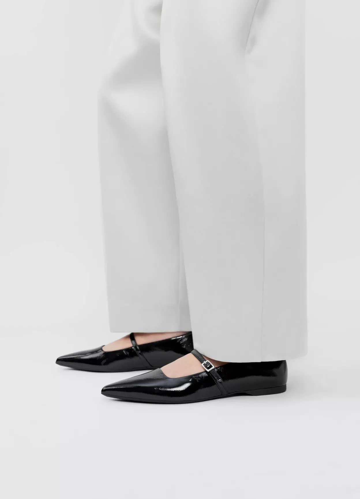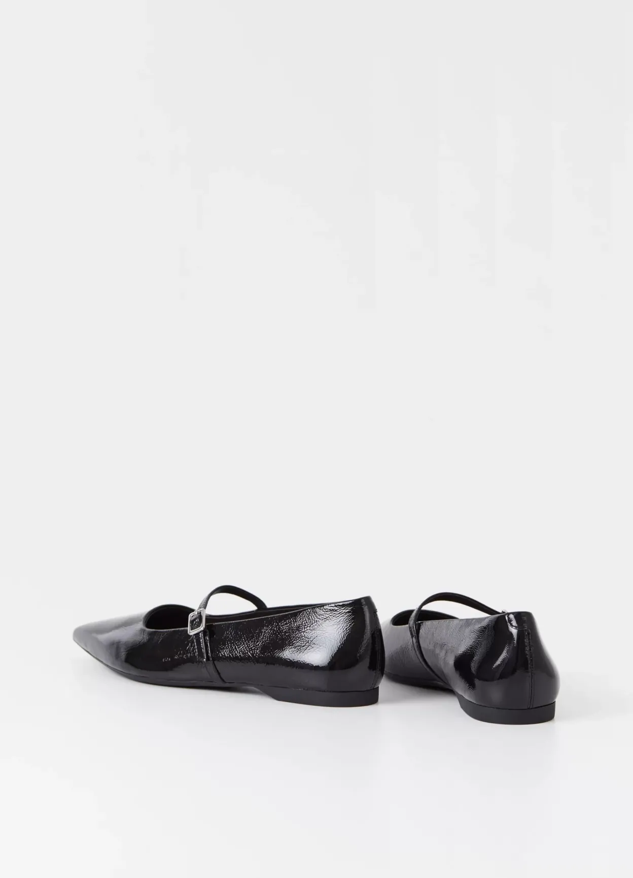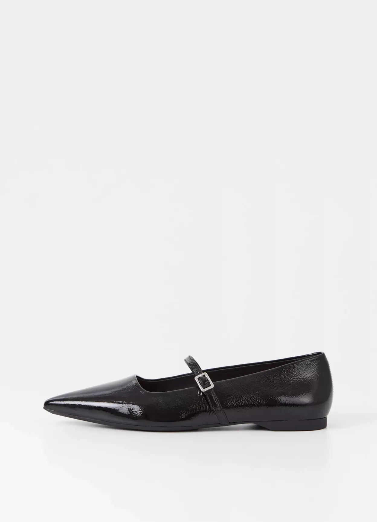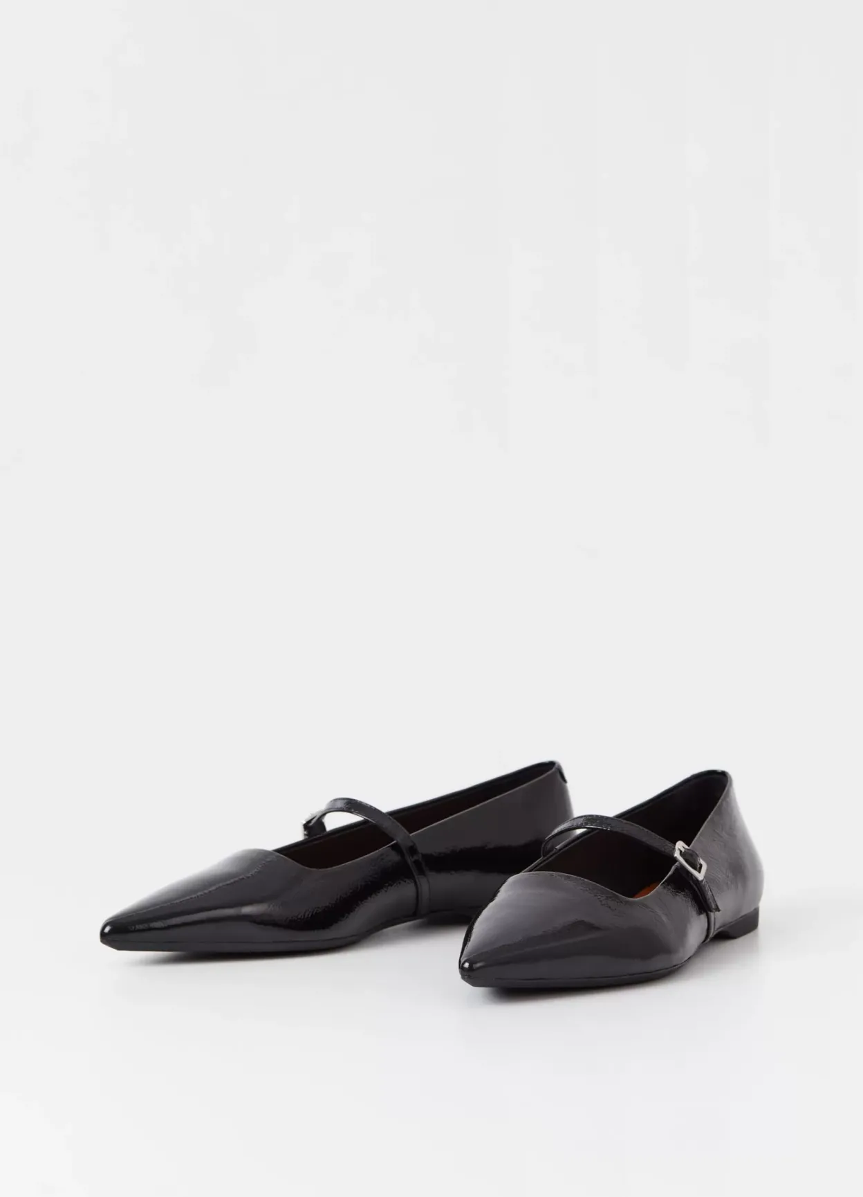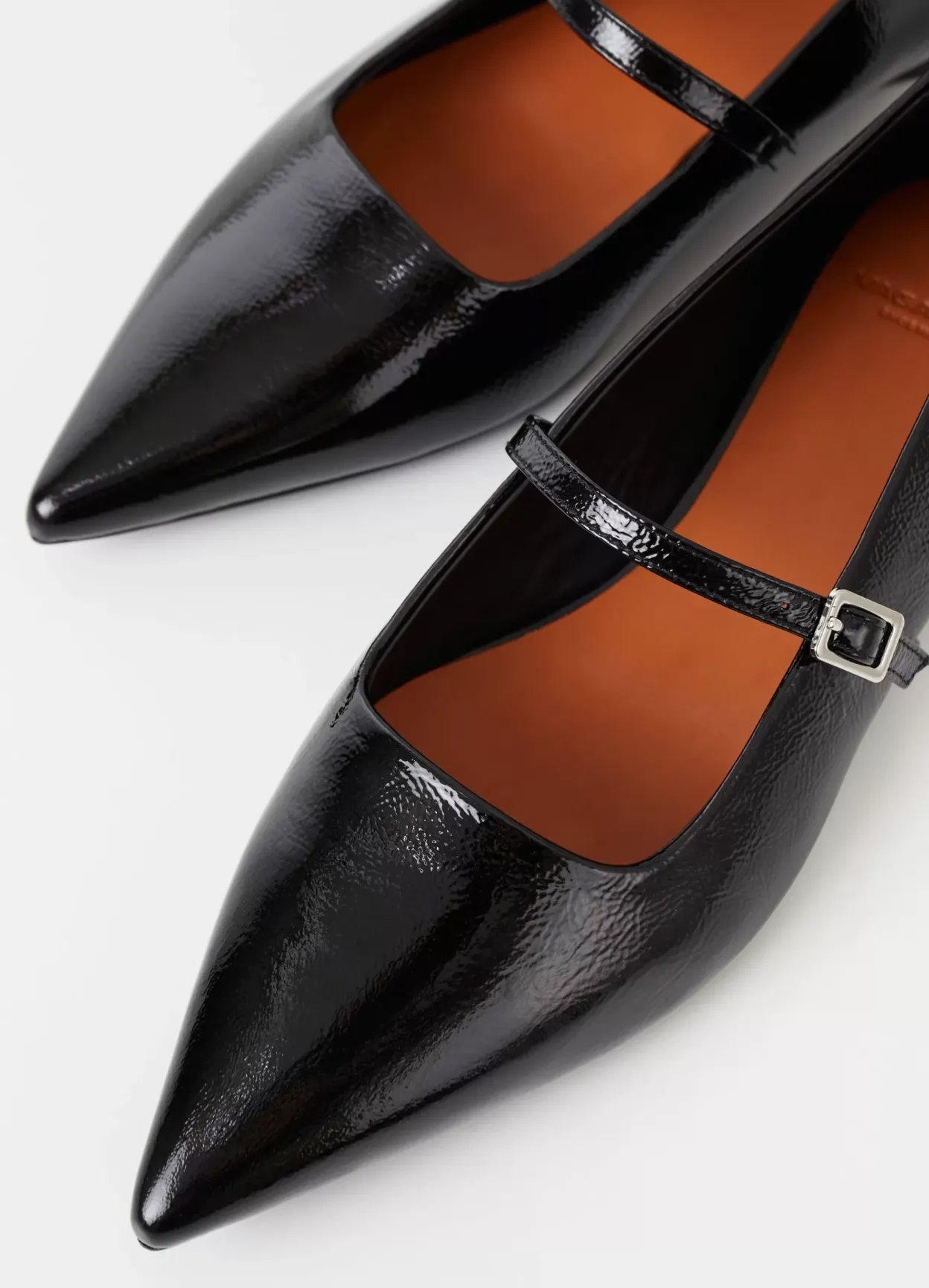 Hermine er Mary Jane-sko med en silhuet, der smalner til. Modellen er lavet i sort laklæder med spids tåform og en smal rem med sølvfarvet spænde over foden. Den tynde sål har en 10 mm lav hæl.