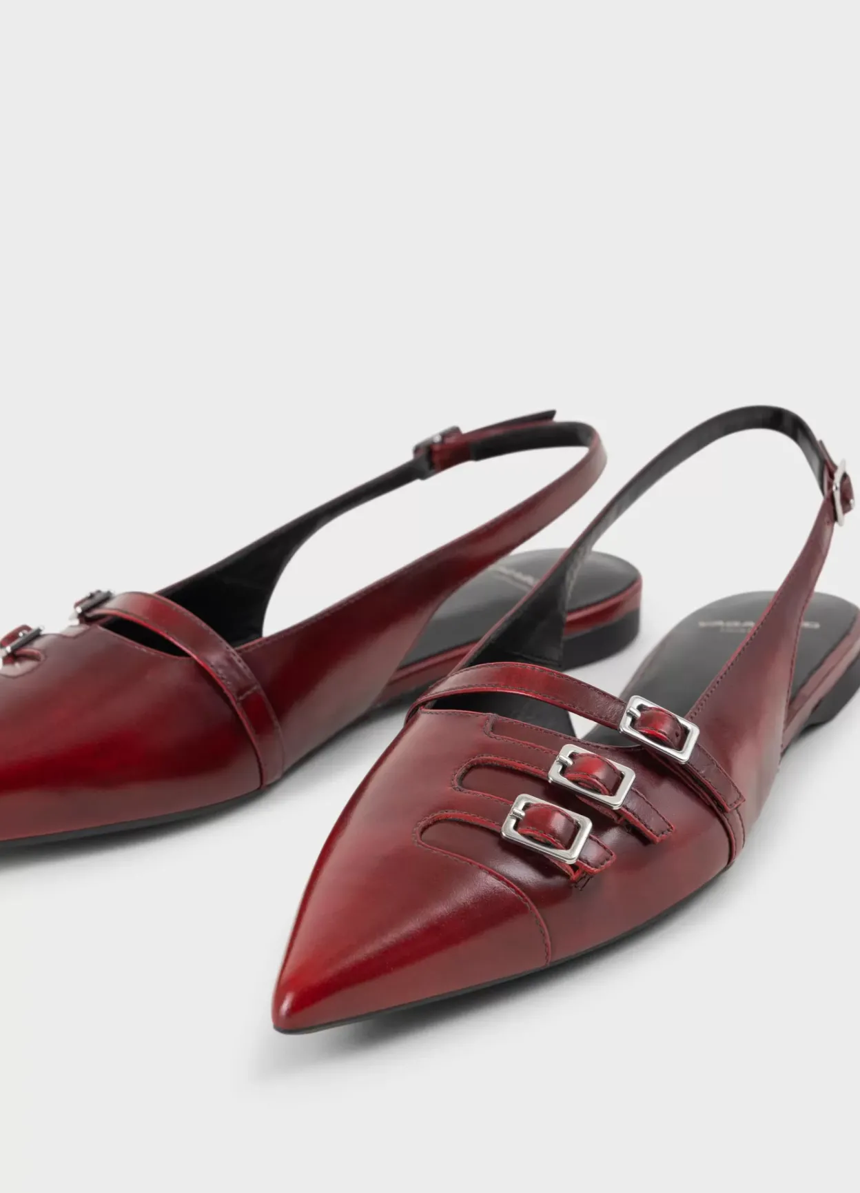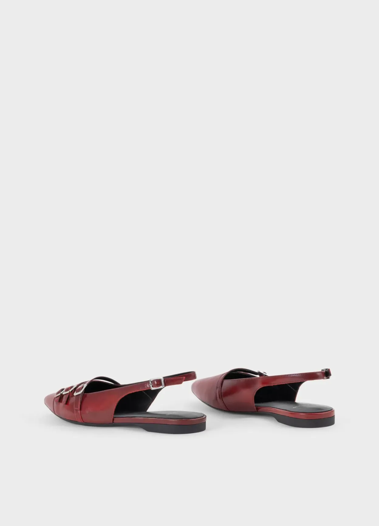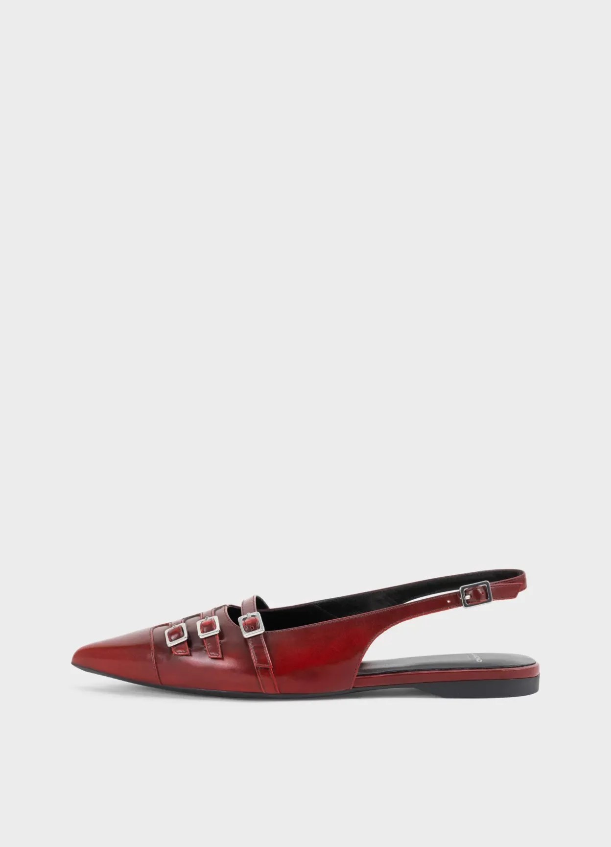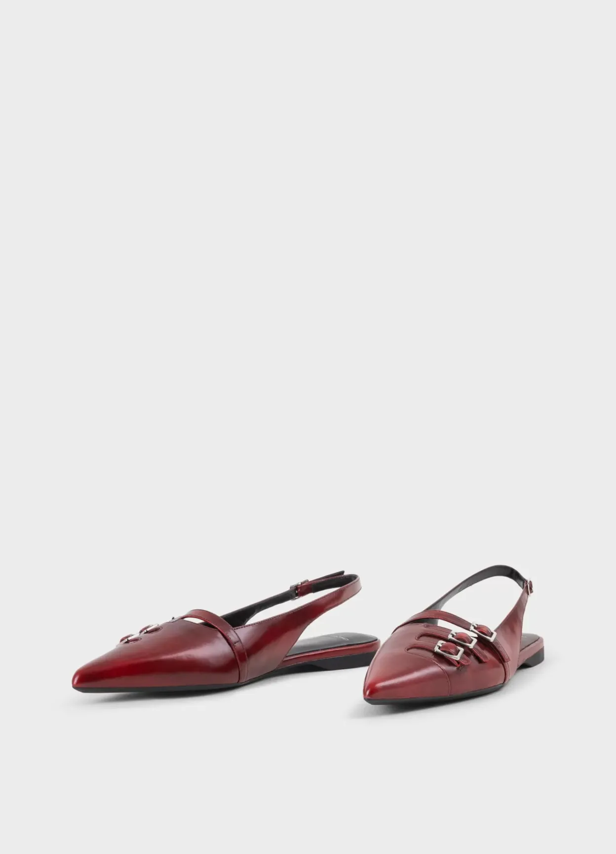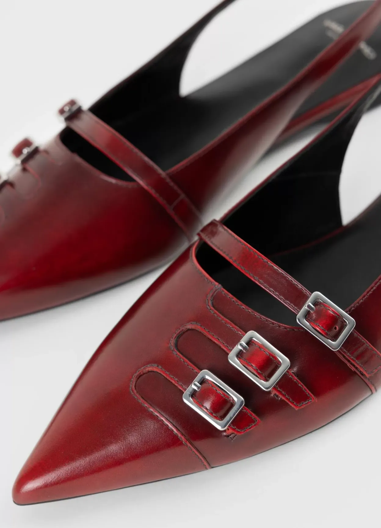 Hermine er stilrene slingbacks med en spids silhuet. Modellen er lavet i rødt brush-off læder med dekorative metalspænder samt spids tå. Den slanke sål er 10 mm. Detaljen: indersål i læder, justerbar hælrem og læderfor.